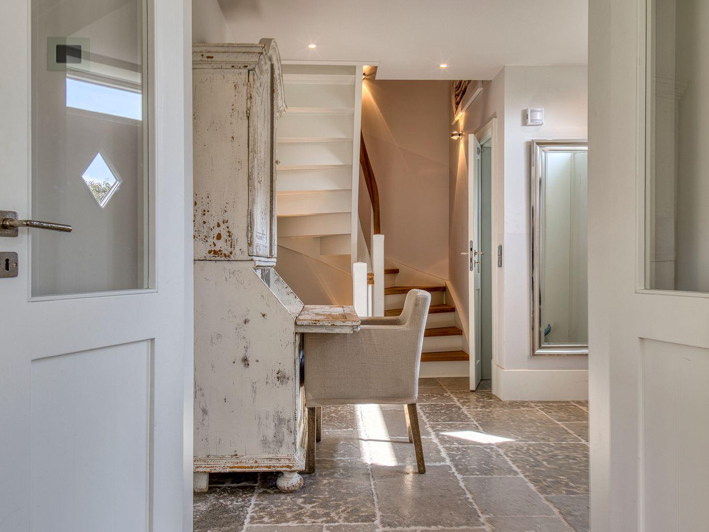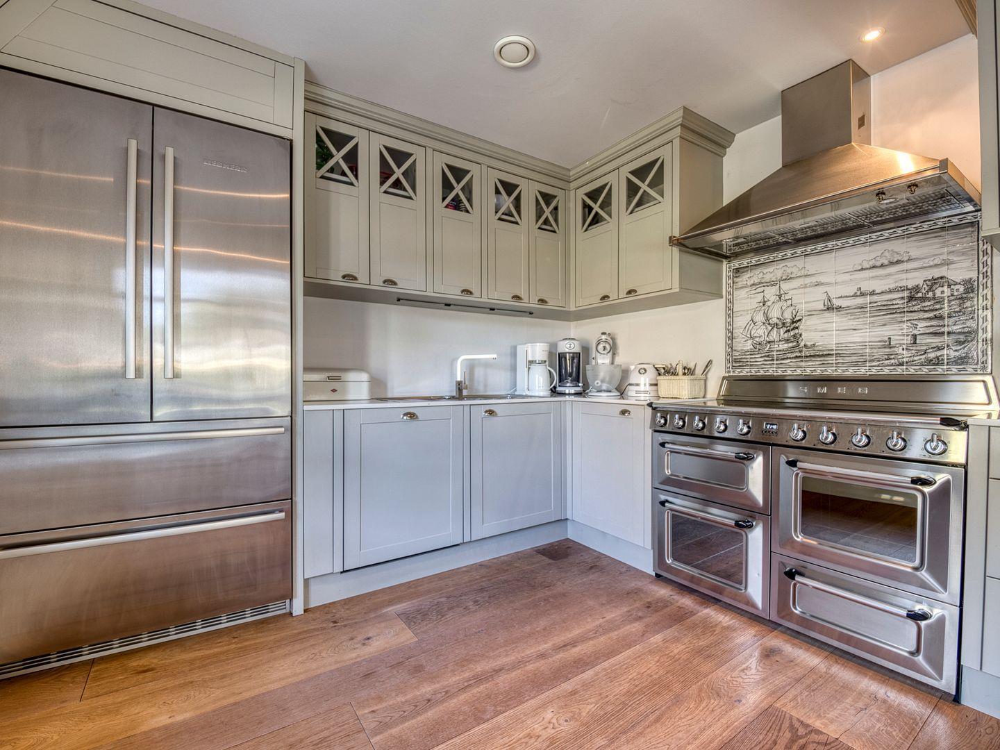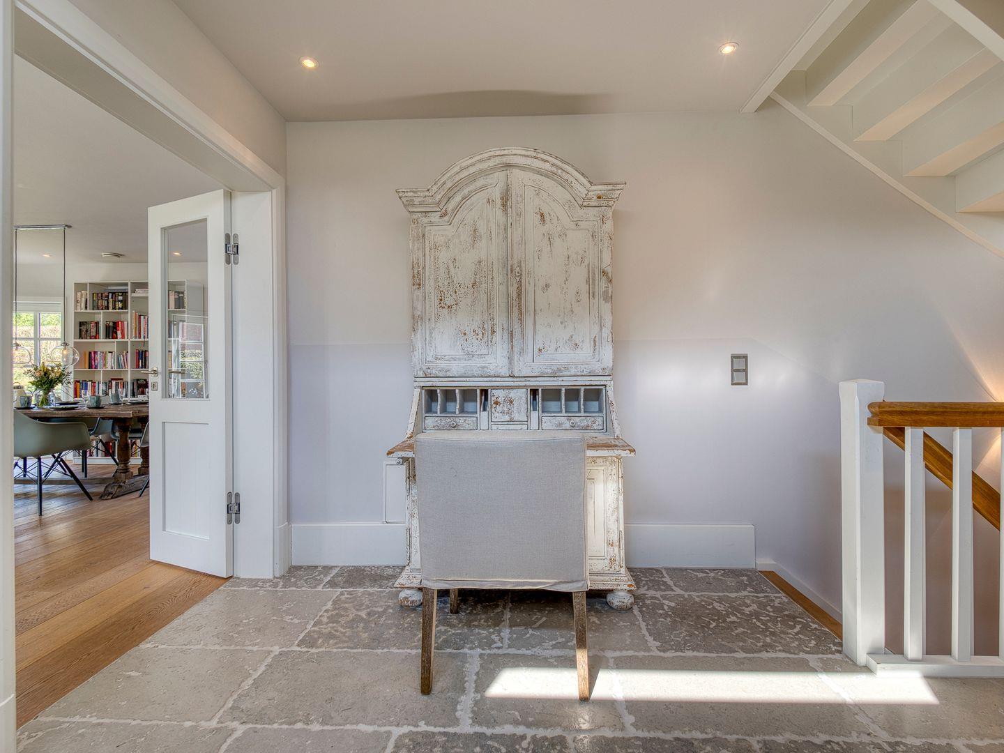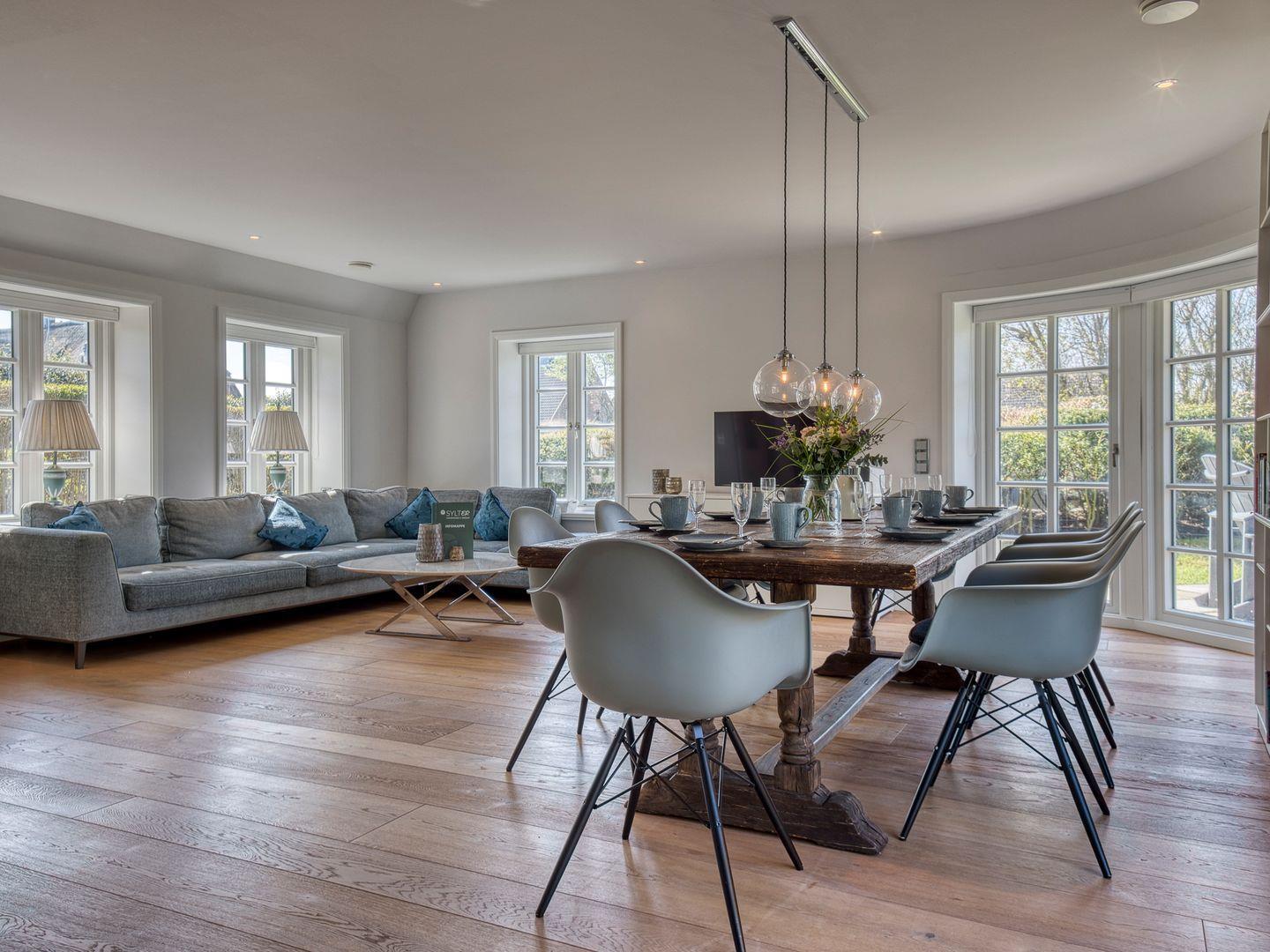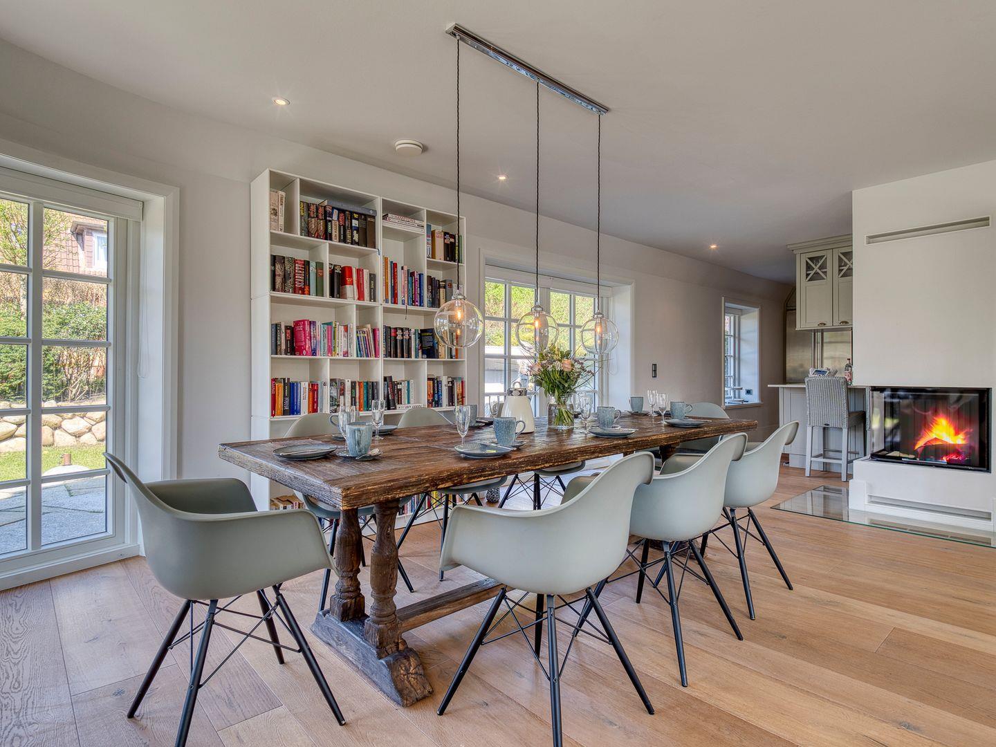 Über einen geräumigen Hausflur mit Garderobe und Ablagefläche gelangen Sie in den hellen und modernen Küchen- und Wohnbereich. Die hellgraue und hochwertige, top ausgestattete, offene Landhausküche lässt für Hobbyköche keine Wünsche offen. 5-Platten-Herd, Backofen, Side-by-Side Kühl- und Gefrierschrank, Weinkühlschrank und Bartresen sind nur ein paar Besonderheiten der Ausstattung. Ein langer Esstisch aus Massivholz ist das Herzstück des Wohnraumes und ermöglicht gesellige Abende mit Familie und Freunden. Die bequeme Sofaecke mit großem TV, Kamin und Blick in den Garten lädt zum Verweilen ein.