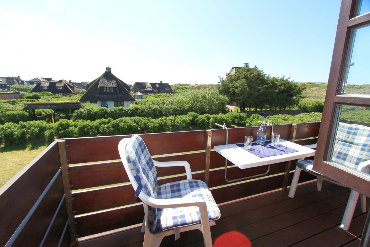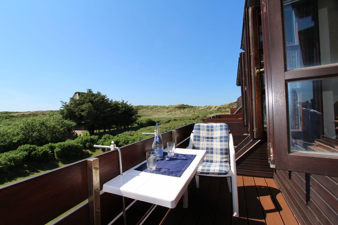 Auf dem Südbalkon sind Sie den ganzen Tag auf der Sonnenseite! Nehmen Sie auf den Balkonmöbeln Platz und genießen Sie die Aussicht auf die Dünen.