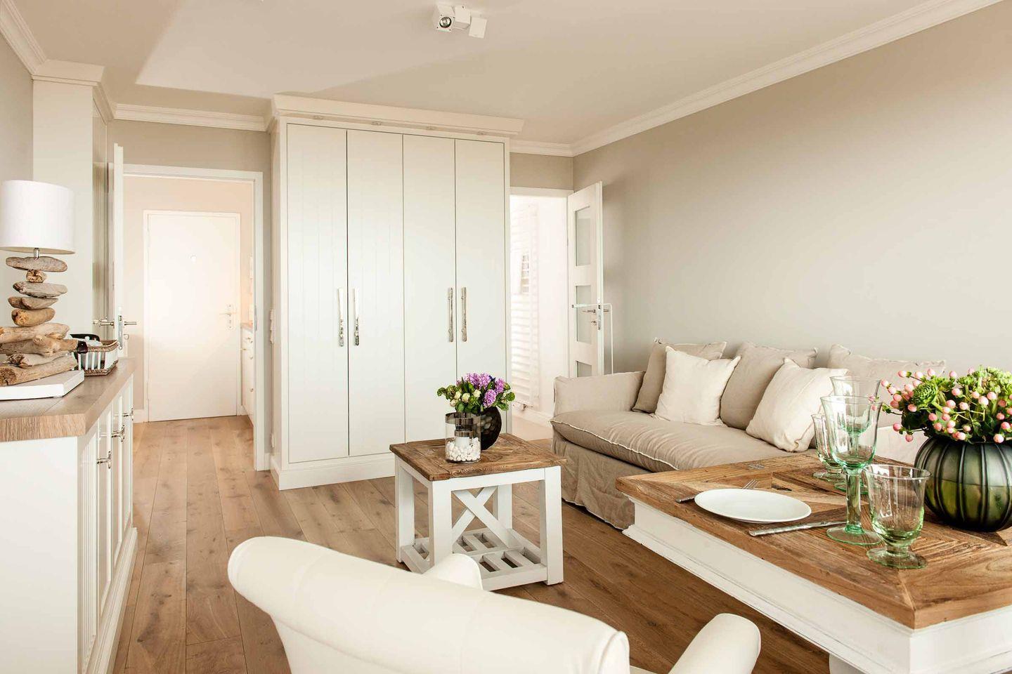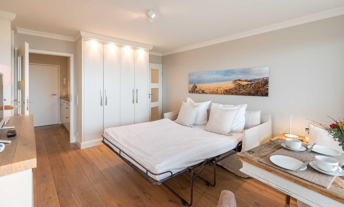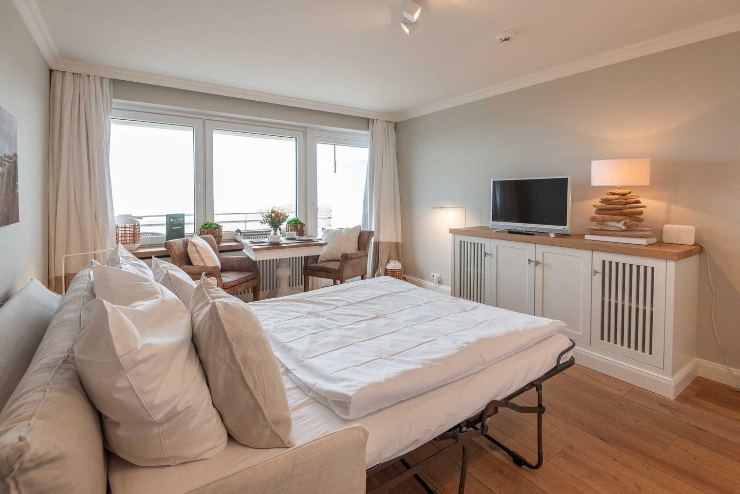Wohn-/Ess- und Schlafbereich: Im Mittelpunkt des hellen Wohnraums steht ein gemütliches Schlafsofa, was innerhalb weniger Sekunden zum Doppelbett mit hochwertiger Matratze (Maße: 1,60 x 1,90 m) umfunktioniert werden kann. Ein kleiner Esstisch mit zwei bequemen Stühlen steht direkt am Fenster. Hier können Sie beim Essen und Lesen entspannte Stunden erleben und auf die Nordsee schauen. Vom möblierten Westbalkon blicken Sie direkt auf das Meer und genießen herrliche Sonnenuntergänge.