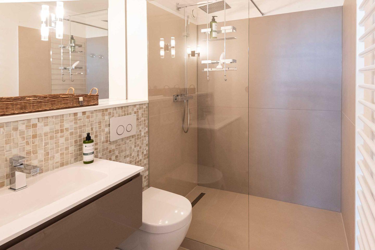 Badezimmer: Modernes Duschbad mit WC und elektrischem Handtuchhalter.