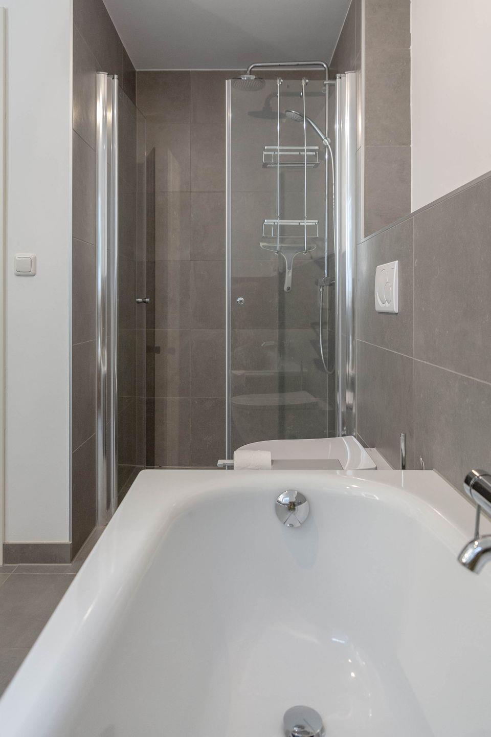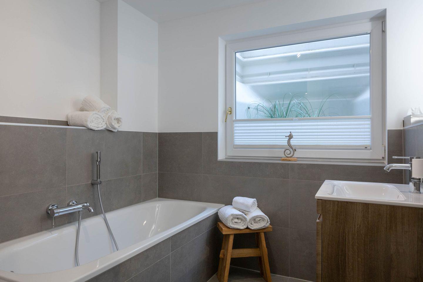 In den Badezimmern, die von Tageslicht durchströmt sind, empfängt Sie komfortabel eine ebenerdige Dusche, und im zweiten Badezimmer befindet sich zusätzlich eine Badewanne zum Entspannen.