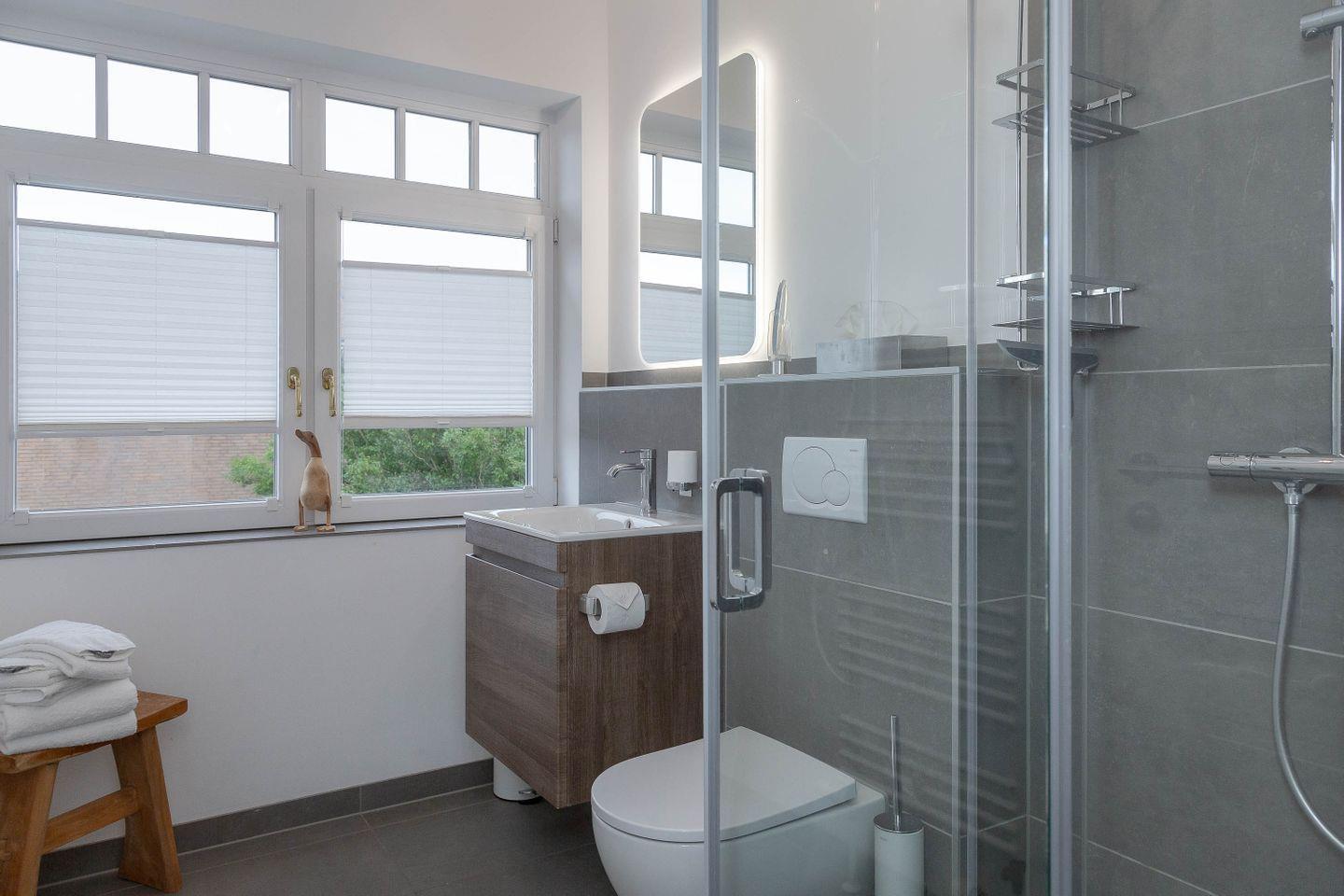 Das Badezimmer ist von Tageslicht durchströmt sind und empfängt Sie komfortabel mit einer ebenerdigen Dusche. Im Keller dieses Hauses befinden sich Waschmaschine und Trockner, welche sie kostenfrei nutzen können.