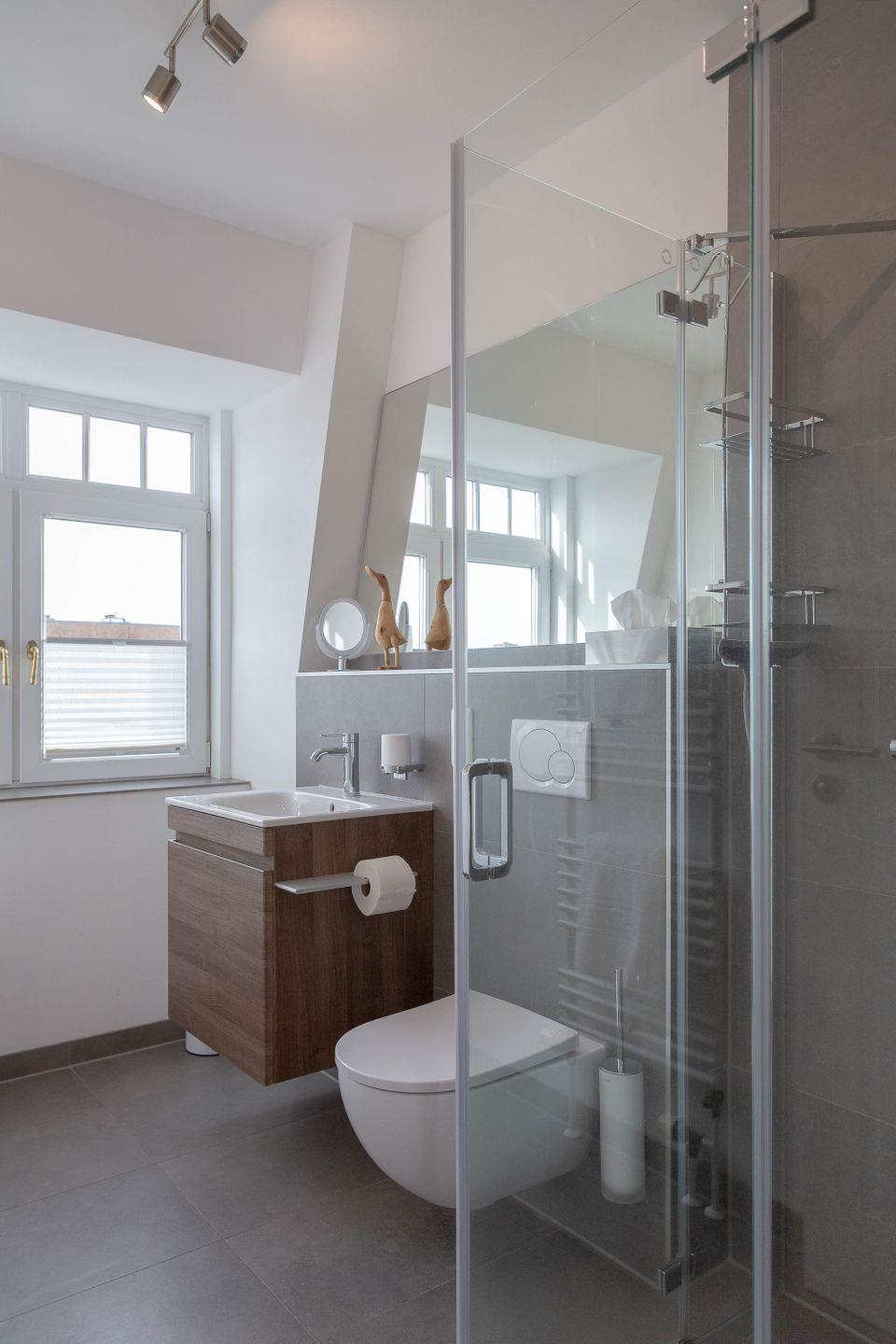 Das Badezimmer ist von Tageslicht durchströmt sind und empfängt Sie komfortabel mit einer ebenerdigen Dusche. Im Keller dieses Hauses befinden sich Waschmaschine und Trockner, welche sie kostenfrei nutzen können.