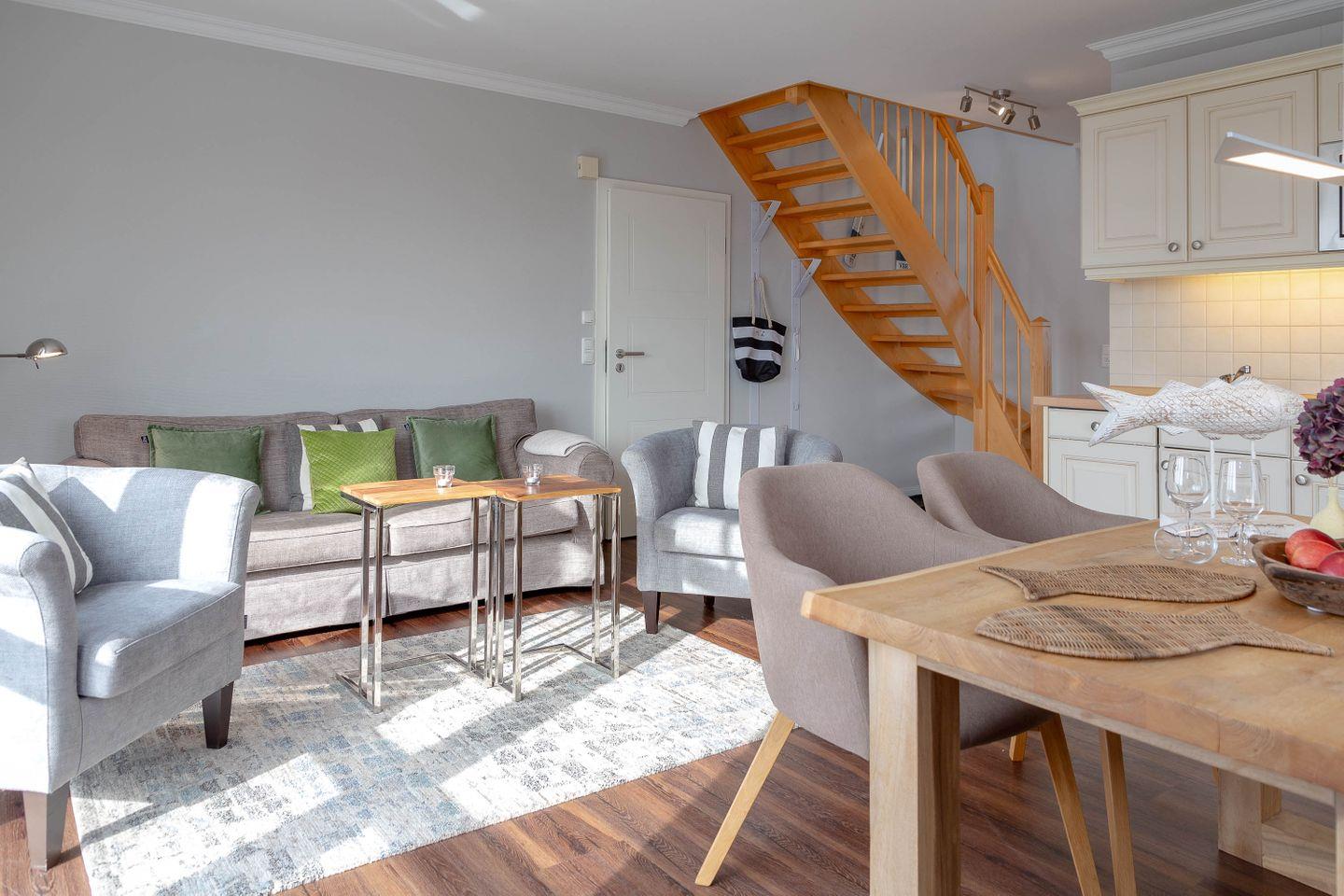 Es erwartet Sie ein exquisites, sehr modernes Design in heller Atmosphäre, in grauen und cremefarbenen Tönen gehalten, mit ganz viel Liebe zum Detail gestaltet. Dieses Urlaubsdomizil ist lichtdurchflutet, und der Blick durch die Fenster präsentiert schöne Ausblicke. In diesem vorzüglichen Ambiente zu wohnen, bedeutet Urlaub von Anfang an!
