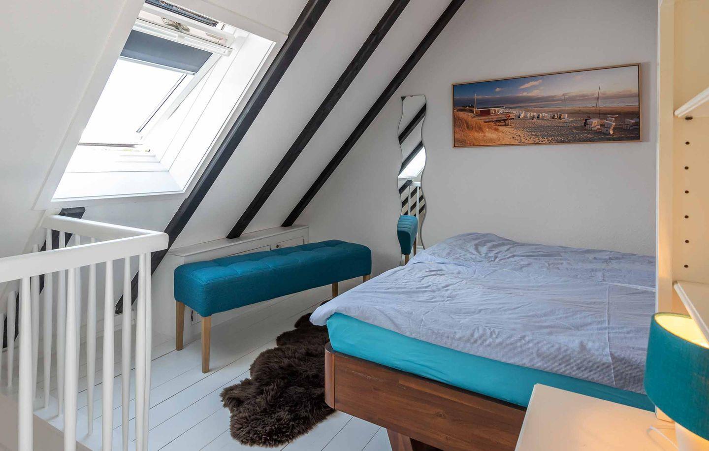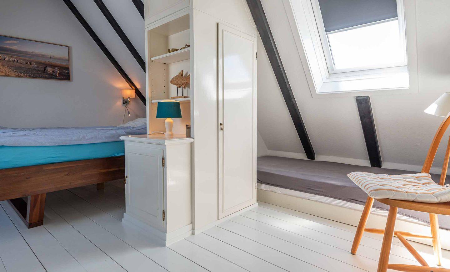 Schlafzimmer 1: Doppelbett und Einbauschrank. Hinweis: Auf Anfrage ist eine Überbelegung mit 1 Kind möglich: Im Schlafzimmer befindet sich unter der Dachschrägen eine Matratze mit den Maßen 90cm x 100cm mit Lattenrost.