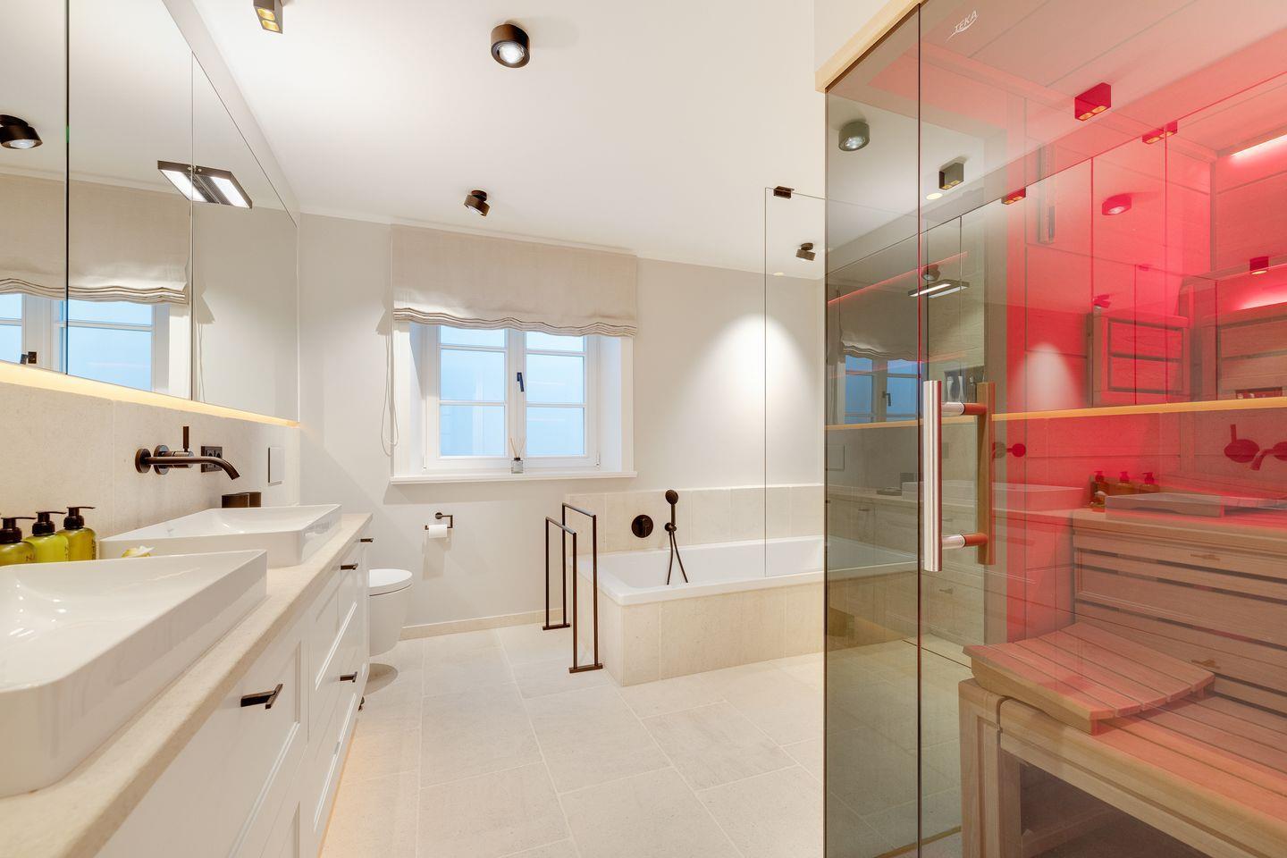 UG: Raum mit Doppelbett (200x200cm) mit Flatscreen TV, Badezimmer mit Dusche, Badewanne, WC und Sauna, separates WC.