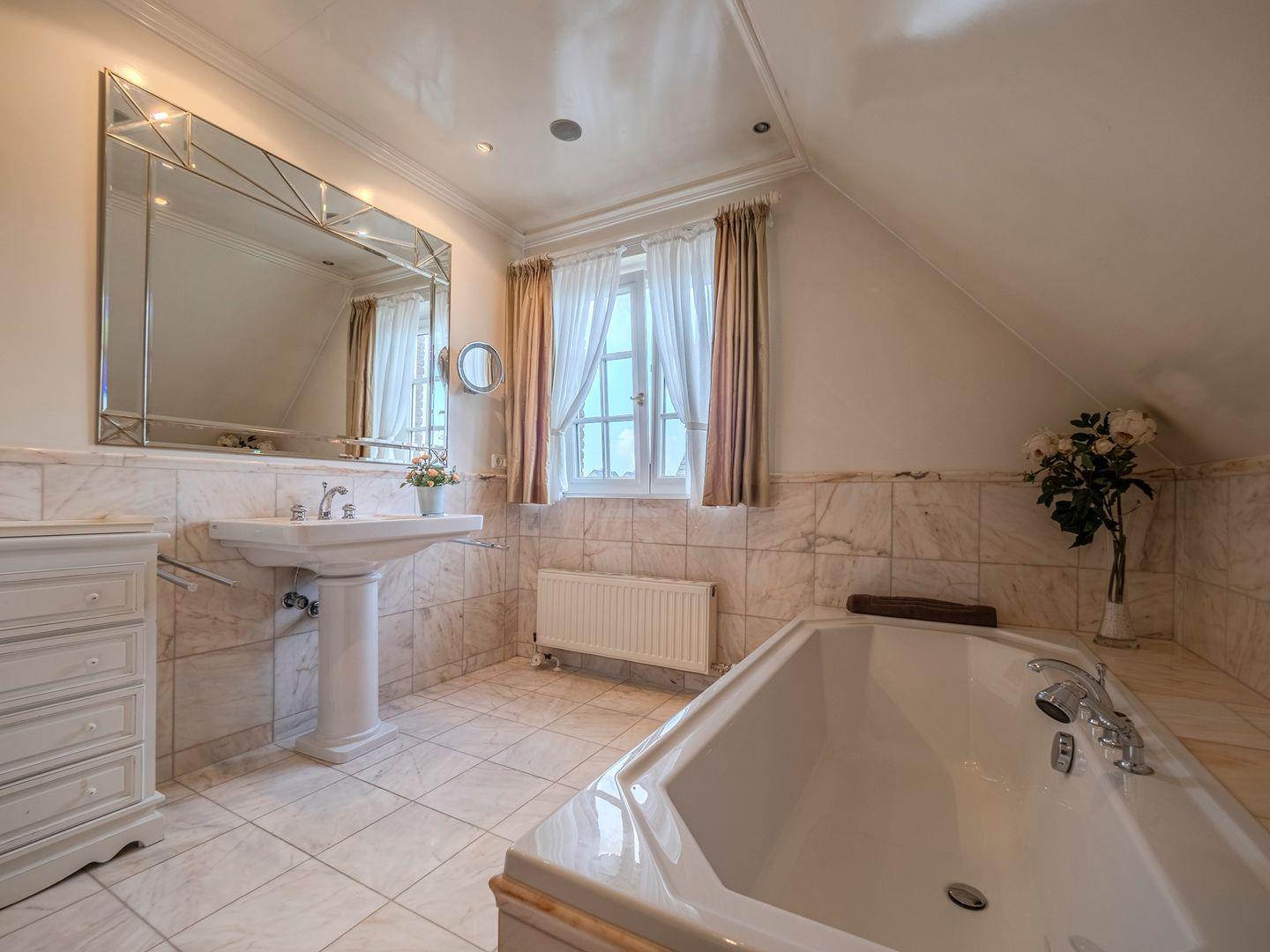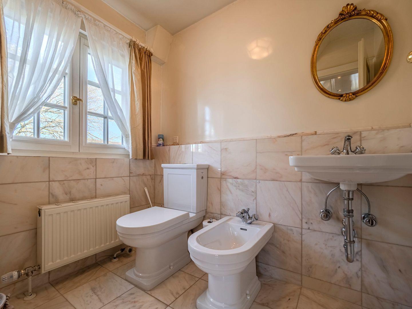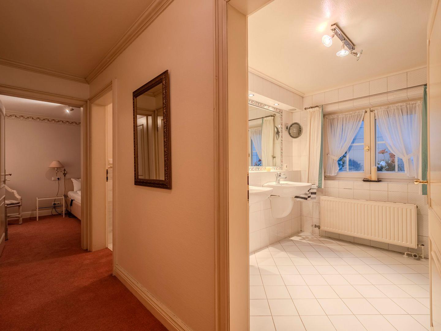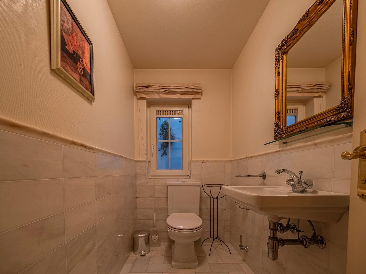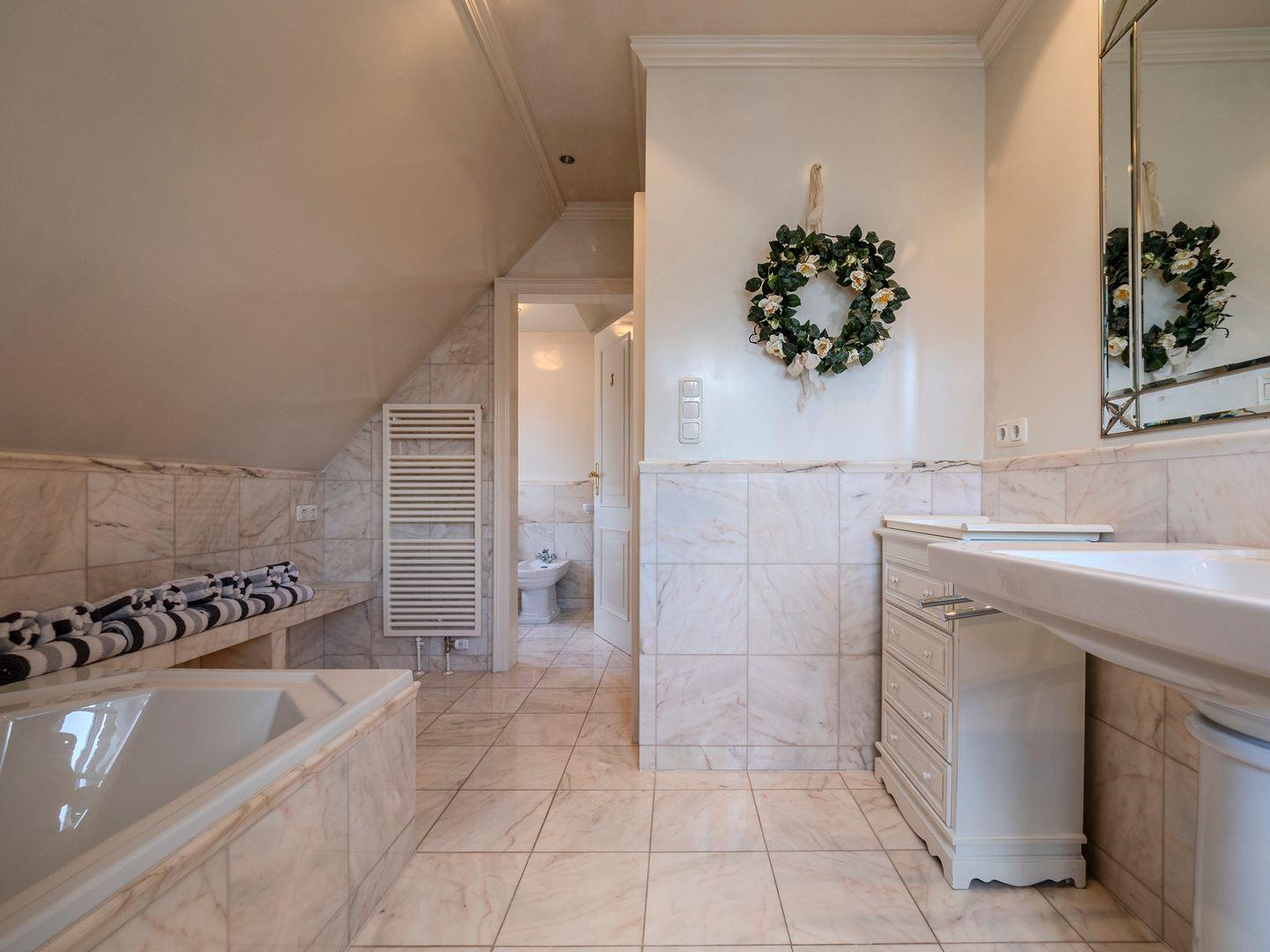 Das Obergeschoss besticht durch ein weiteres Schlafzimmer mit Doppelbett und begehbarem Kleiderschrank. Das großzügige Wannenbad mit separatem WC und Bidet bietet Ihnen luxuriösen Komfort.