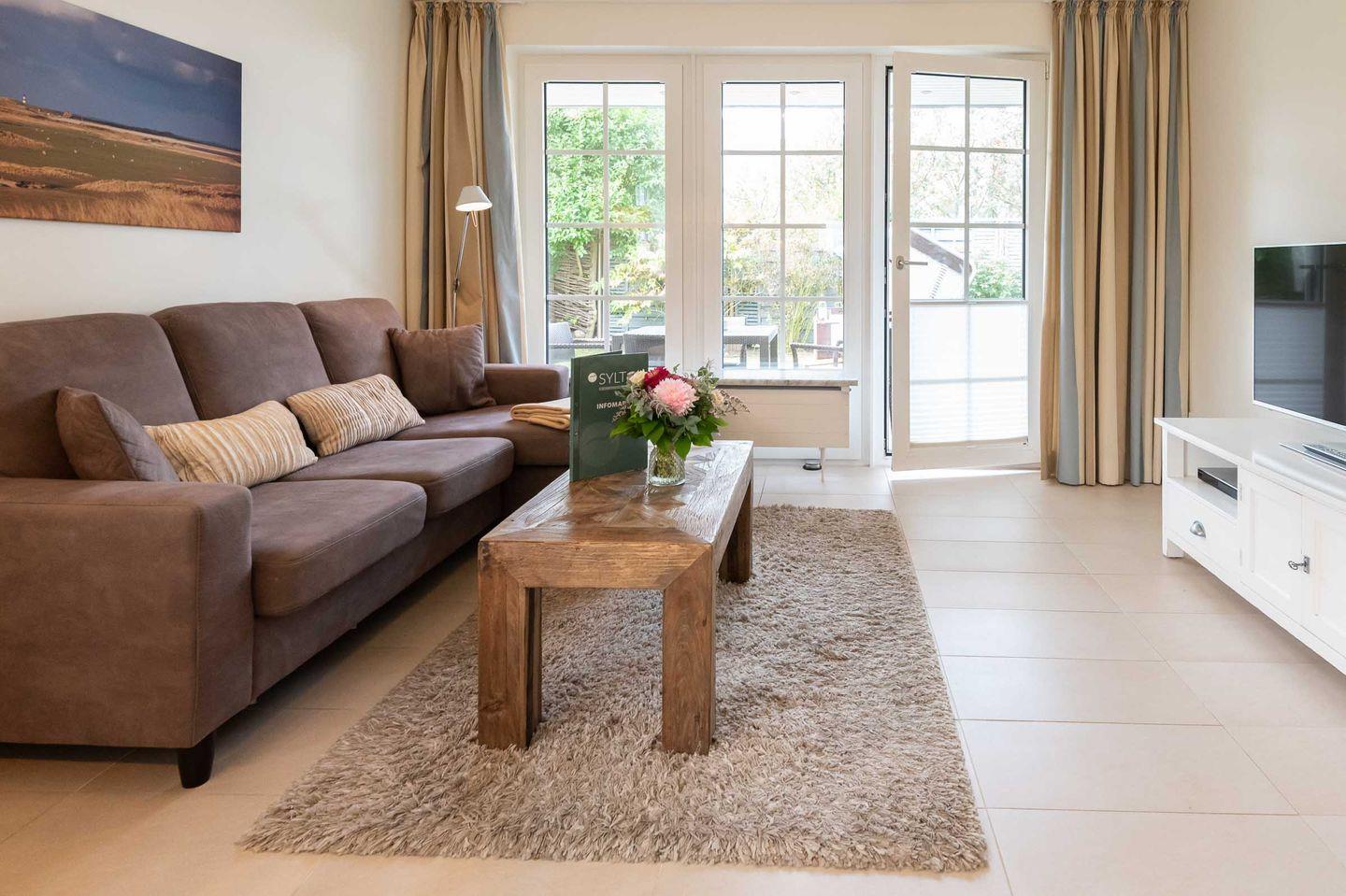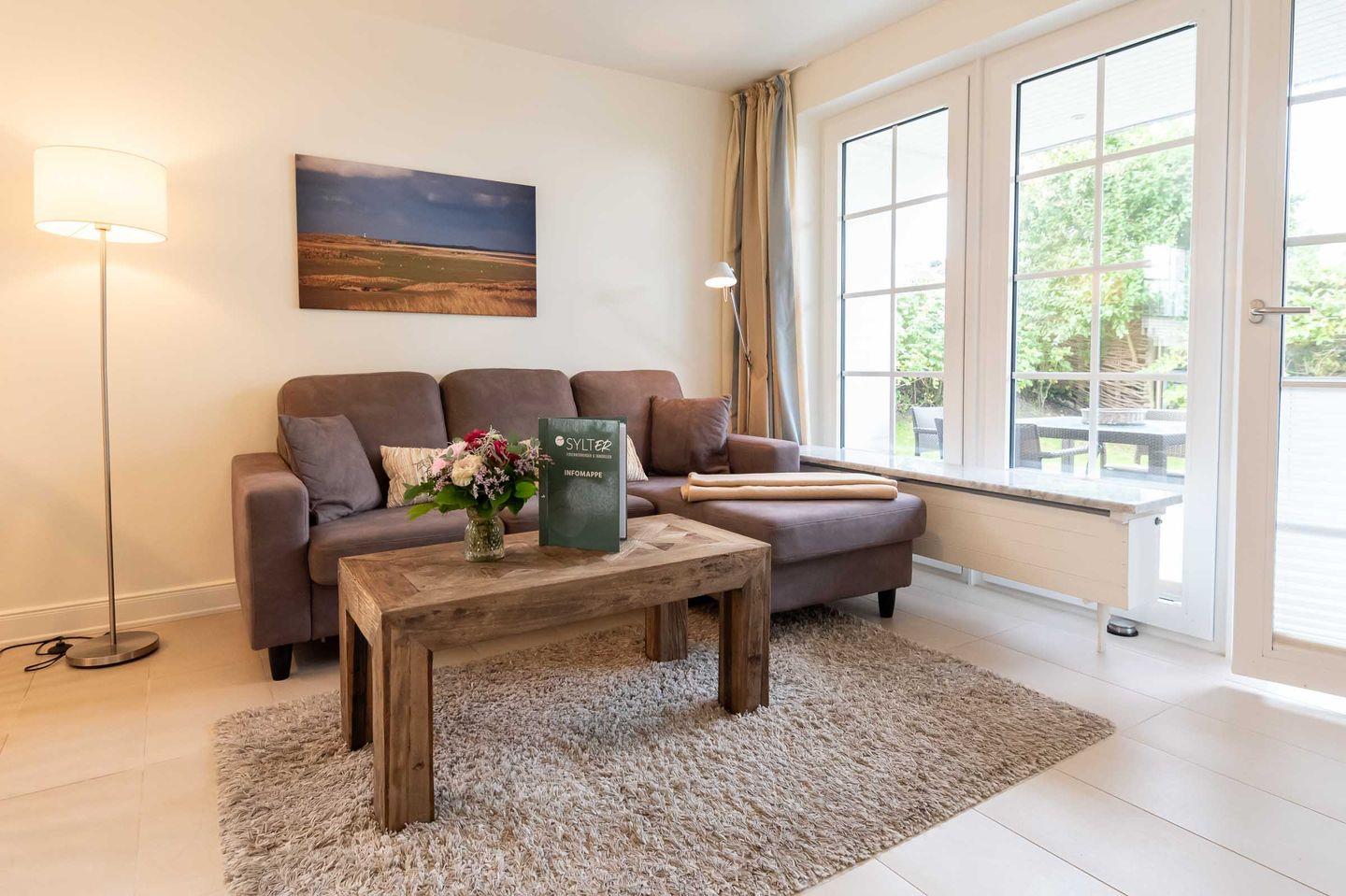 Über eine Terrassentür gelangen Sie vom Wohnzimmer aus auf die sonnige und großzügig möblierte West-Terrasse mit Saisonstrandkorb (ca. April - Oktober).