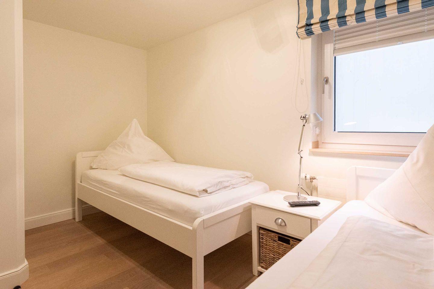 Schlafzimmer 2: 2 Einzelbetten, Kleiderschrank, TV und Fenster.