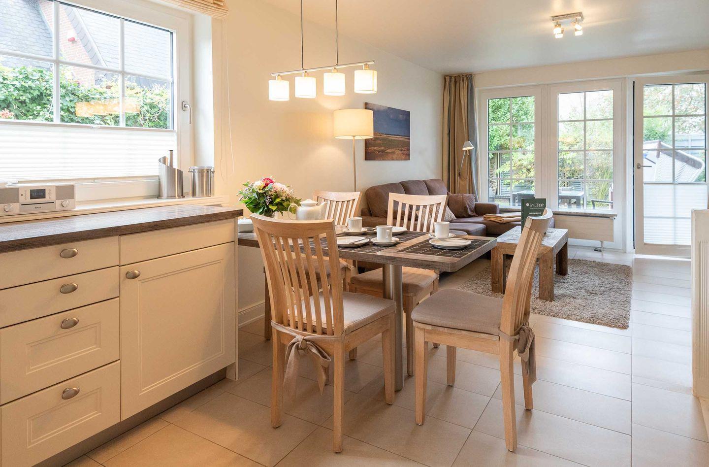 Großzügiger und stilvoll eingerichteter Wohnraum mit einer gemütlichen Sofaecke und Blick in den Garten. Der moderne und helle Essbereich lädt zu geselligen Mahlzeiten ein. Die offene Küche mit Fenster ist sehr gut ausgestattet und verfügt über einen Backofen mit Mikrowellenfunktion.