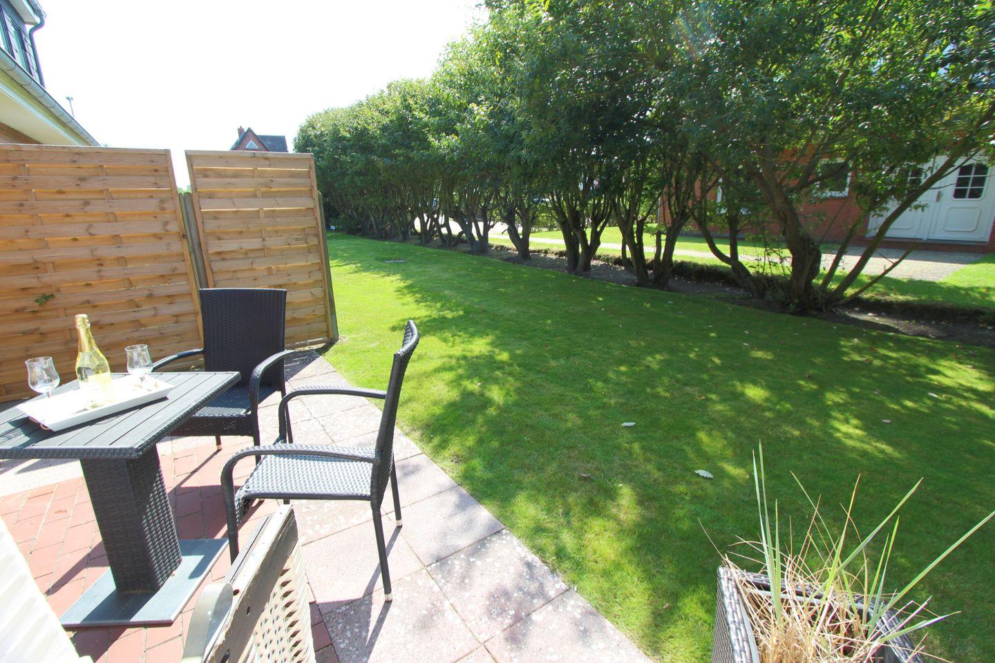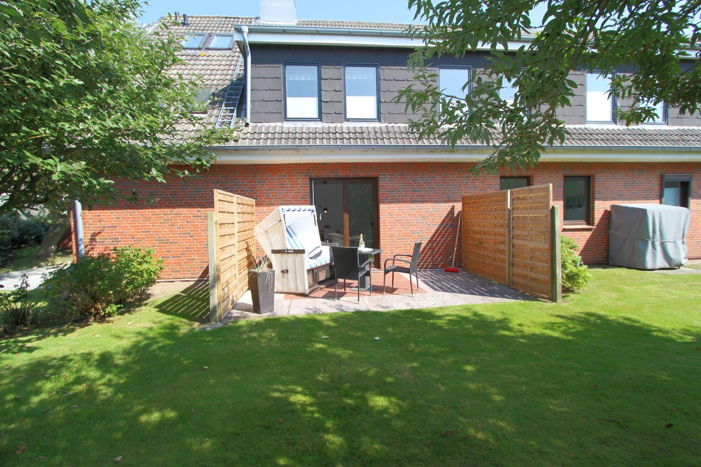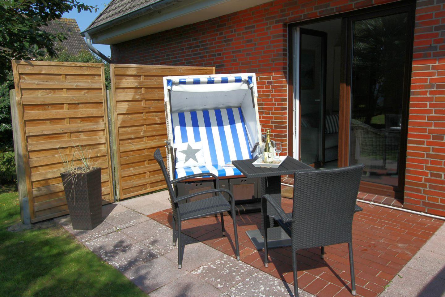Vom Wohnbereich aus geht es auf die Süd-Terrasse mit komfortablen Gartenmöbeln. Der Strandkorb zum Verweilen ein.