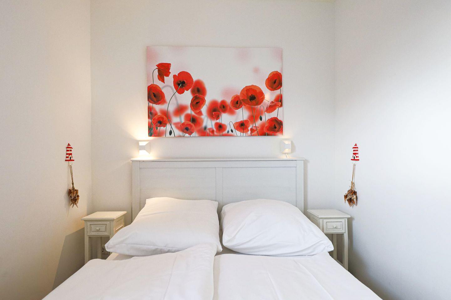 Die Wohnung verfügt über zwei separate Schlafräume im Erdgeschoss. Eines ist mit einem Doppelbett (140x200, durchgehende Matratze) versehen, das zweite verfügt über ein Einzelbett.