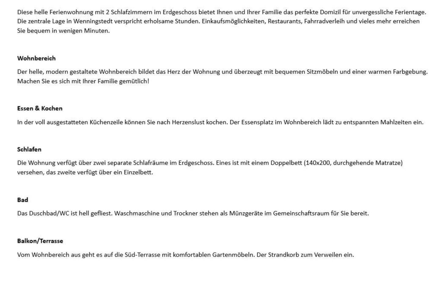 Diese helle Ferienwohnung mit 2 Schlafzimmern im Erdgeschoss bietet Ihnen und Ihrer Familie das perfekte Domizil für unvergessliche Ferientage. Die zentrale Lage in Wenningstedt verspricht erholsame Stunden. Einkaufsmöglichkeiten, Restaurants, Fahrradverleih und vieles mehr erreichen Sie bequem in wenigen Minuten.