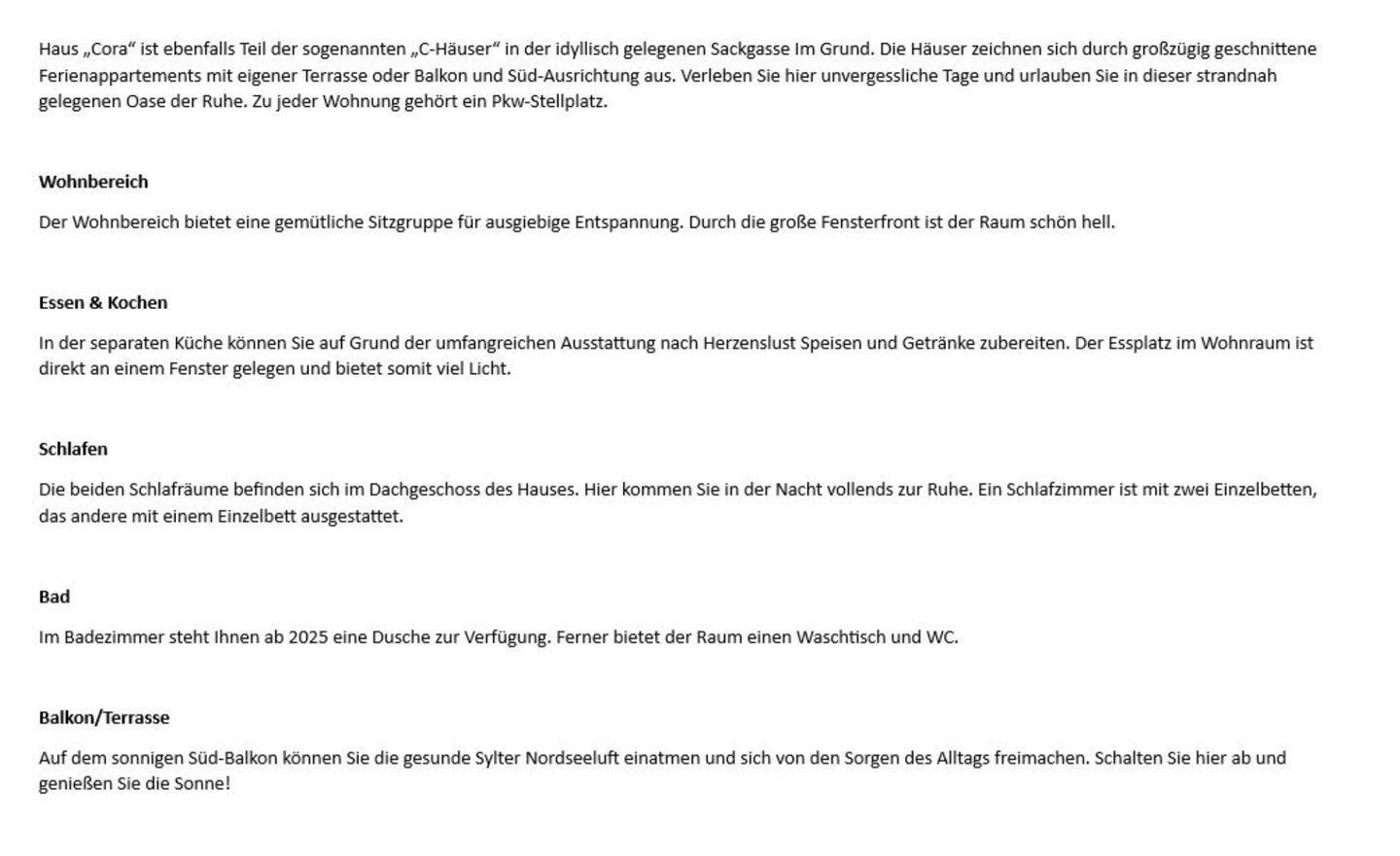 Haus „Cora“ ist ebenfalls Teil der sogenannten „C-Häuser“ in der idyllisch gelegenen Sackgasse Im Grund. Die Häuser zeichnen sich durch großzügig geschnittene Ferienappartements mit eigener Terrasse oder Balkon und Süd-Ausrichtung aus. Verleben Sie hier unvergessliche Tage und urlauben Sie in dieser strandnah gelegenen Oase der Ruhe. Zu jeder Wohnung gehört ein Pkw-Stellplatz.