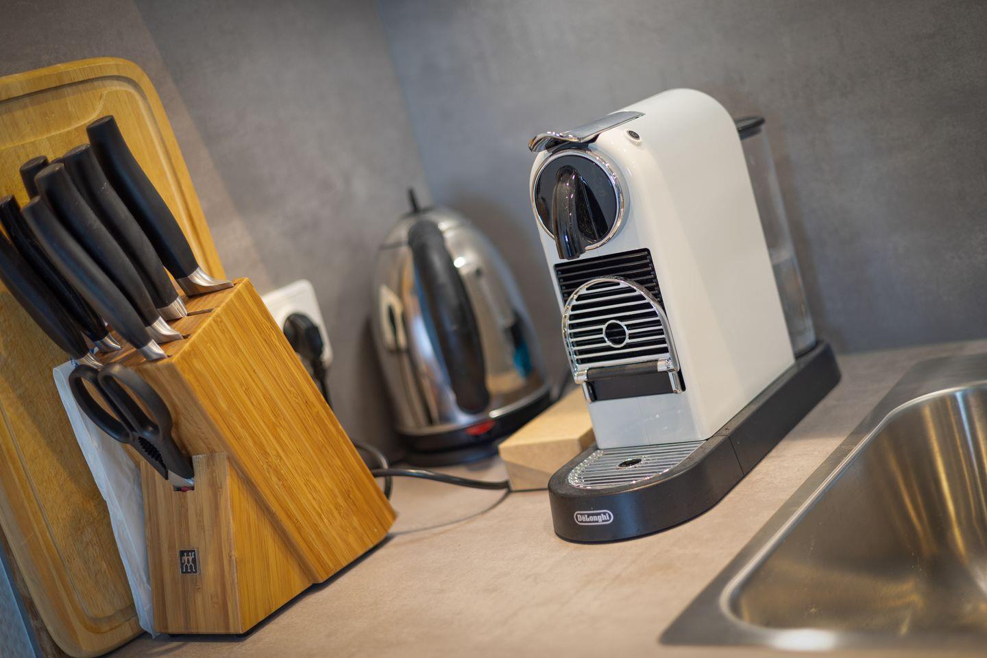 Die voll ausgestattete Küche ist ein Highlight der Ferienwohnung. Sie verfügt über moderne Geräte wie Herd mit Ceranfeld, Spülmaschine, Kühlschrank, Nespresso-Maschine, Toaster und Wasserkocher. Hier kannst du deine Lieblingsgerichte zubereiten und gemütliche Abendessen genießen. Für den Fall, dass du etwas Frisches vom Markt kaufen möchtest, ist der nächste Supermarkt nur 900 Meter entfernt.