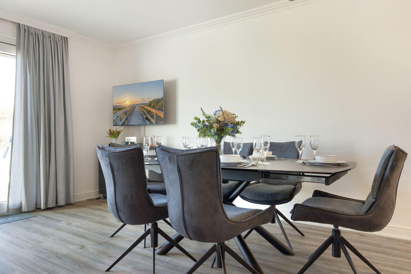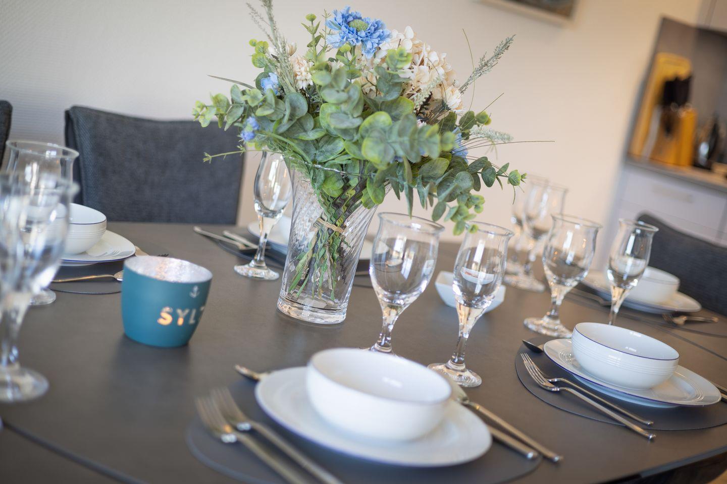 Das lichtdurchflutete Wohnzimmer ist der perfekte Ort zum Entspannen. Hier genießt du die Zeit in der einladenden Sofaecke. Auch ein Smart-TV, Radio und CD-Spieler sorgen für Unterhaltung und lassen keine Langeweile aufkommen. Der offene Essbereich mit einem großen Esstisch bietet ausreichend Platz für gesellige Mahlzeiten mit Freunden oder der Familie.