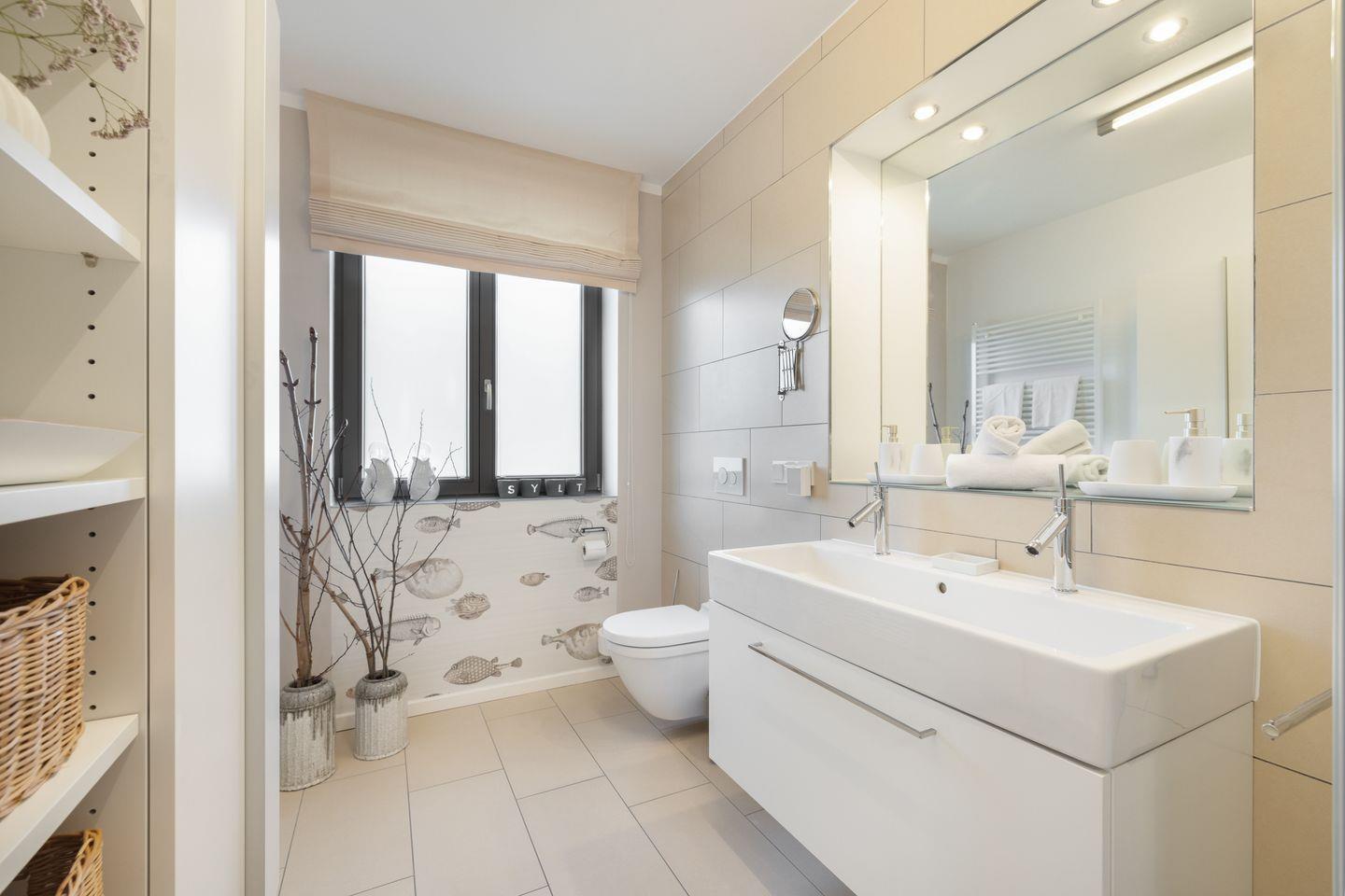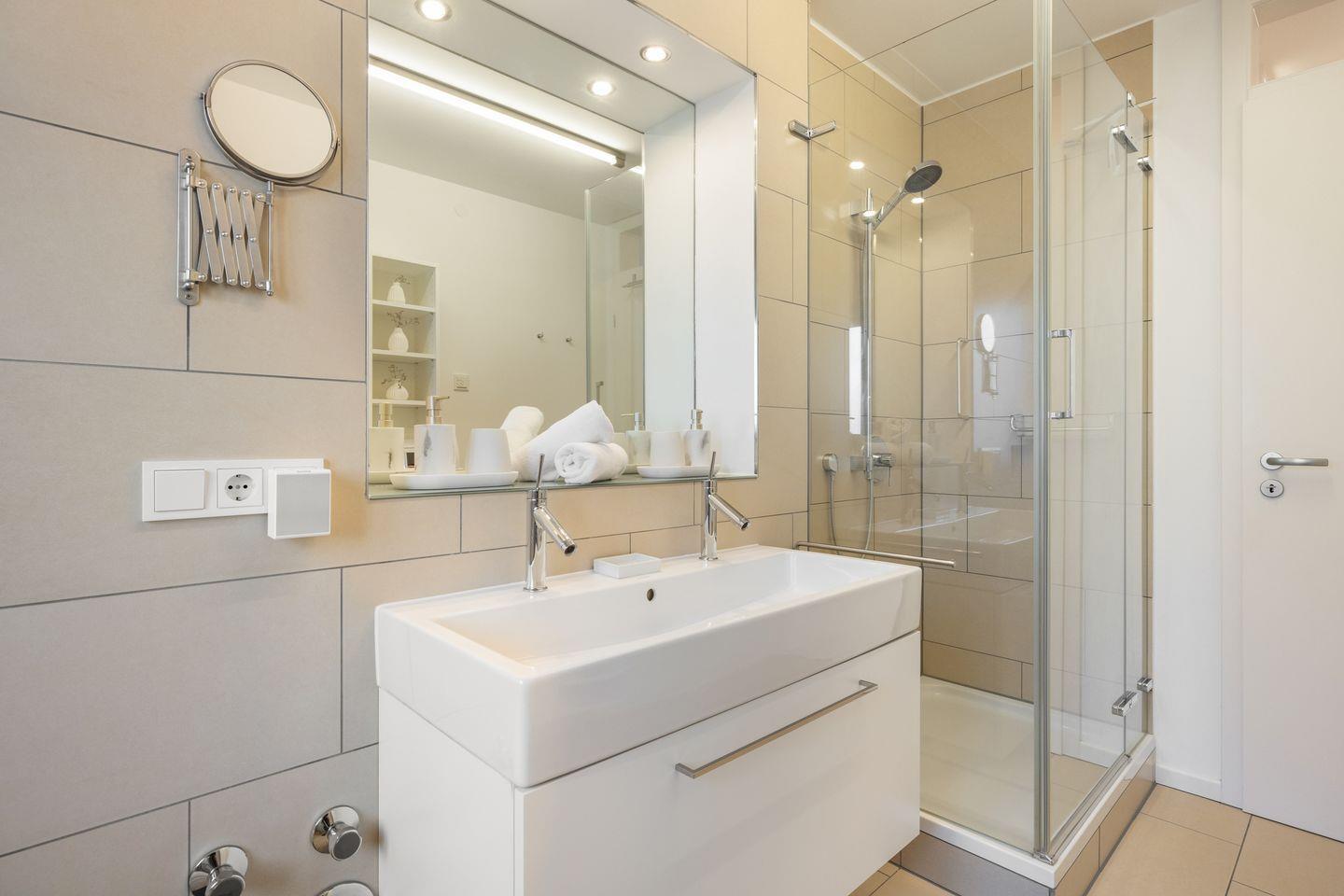 Die Badezimmerausstattung ist ebenfalls durchdacht – Sie finden hier eine Dusche, ein modernes Waschbecken, einen Kosmetikspiegel und einen Haartrockner. Handtücher und die erste Badausstattung sind selbstverständlich bereits für Sie bereitgelegt.