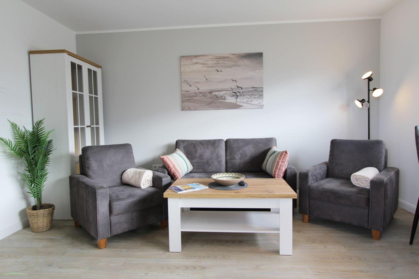 Im lichtgefluteten Wohnbereich des Appartements im Erdgeschoss steht die Erholung an erster Stelle. Sofa und Sessel laden zum Entspannen ein.