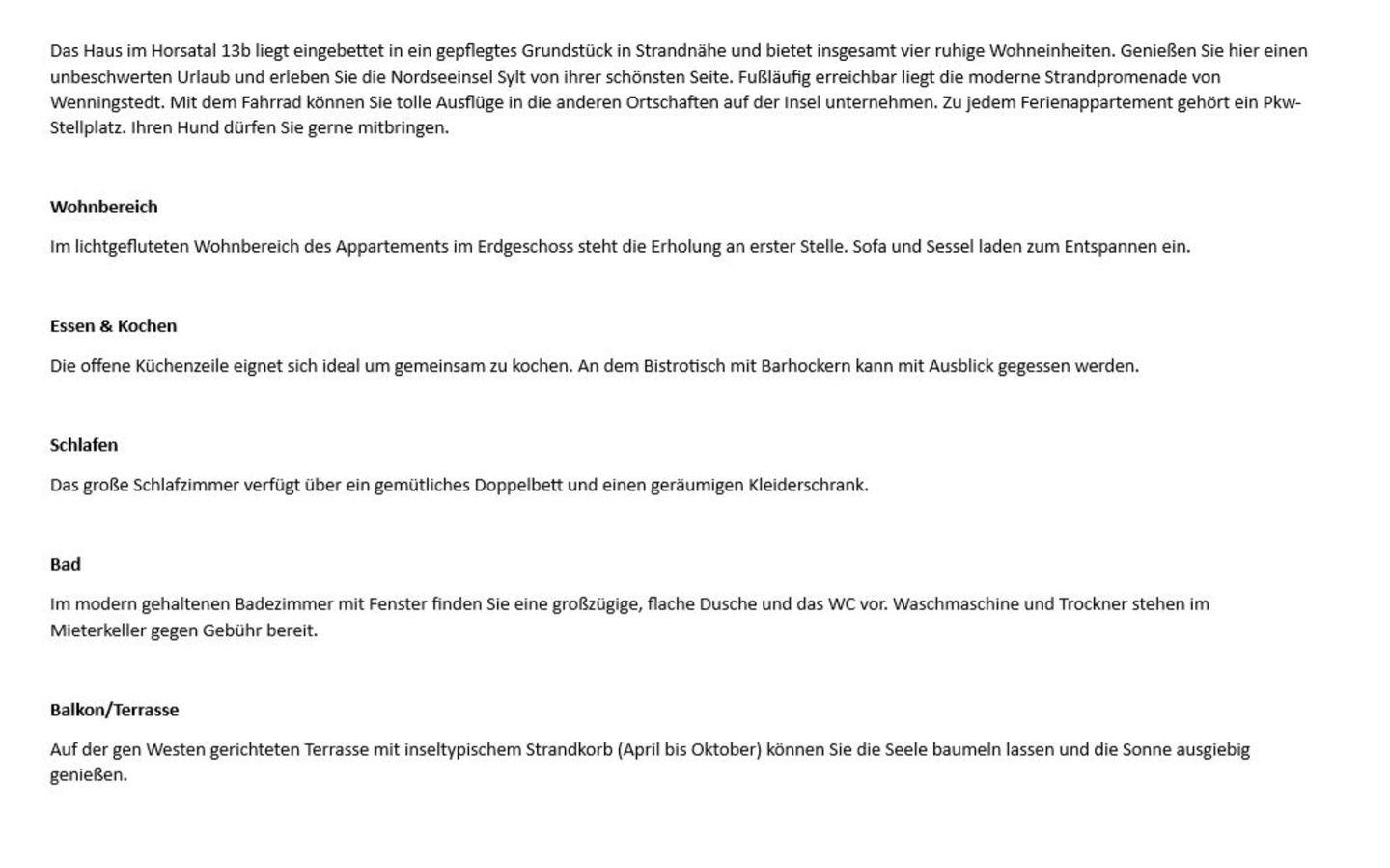Das Haus im Horsatal 13b liegt eingebettet in ein gepflegtes Grundstück in Strandnähe und bietet insgesamt vier ruhige Wohneinheiten. Genießen Sie hier einen unbeschwerten Urlaub und erleben Sie die Nordseeinsel Sylt von ihrer schönsten Seite. Fußläufig erreichbar liegt die moderne Strandpromenade von Wenningstedt. Mit dem Fahrrad können Sie tolle Ausflüge in die anderen Ortschaften auf der Insel unternehmen. Zu jedem Ferienappartement gehört ein Pkw-Stellplatz. Ihren Hund dürfen Sie gerne mitbringen.