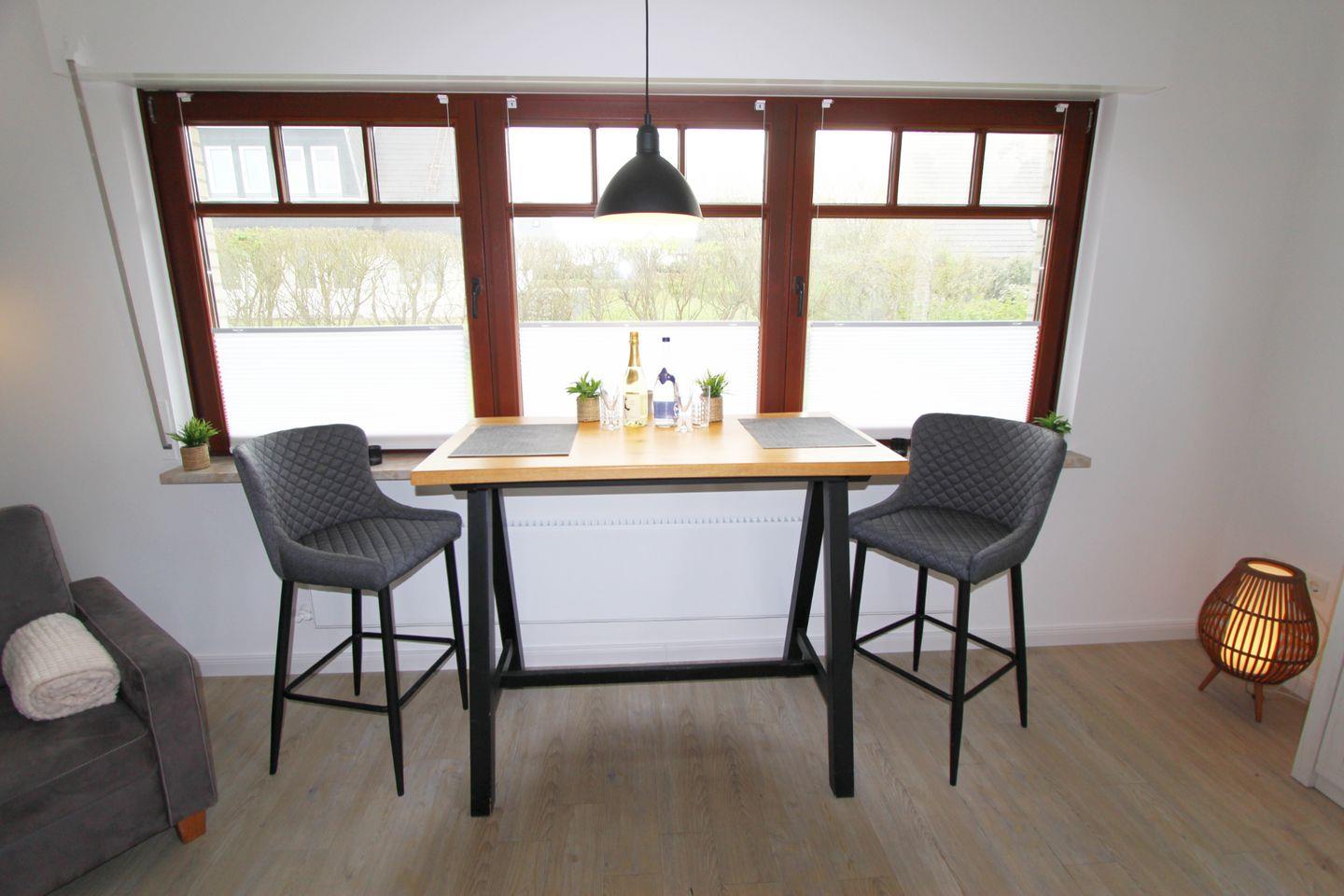 Die offene Küchenzeile eignet sich ideal um gemeinsam zu kochen. An dem Bistrotisch mit Barhockern kann mit Ausblick gegessen werden.