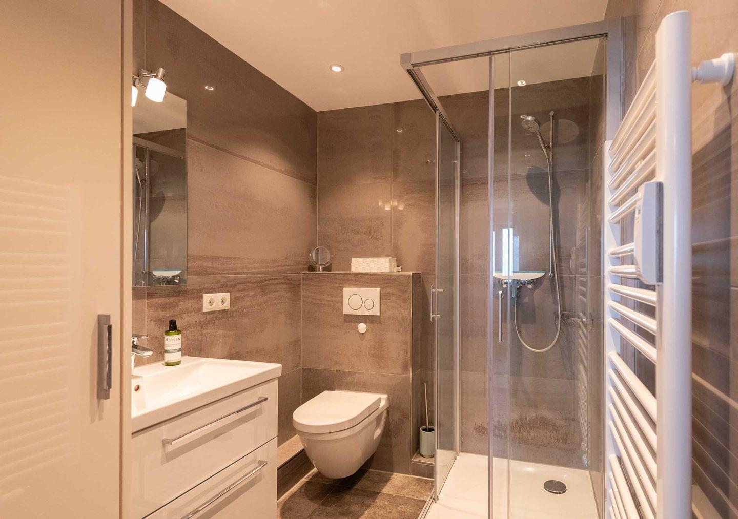 Badezimmer: Modernes Duschbad mit WC und elektrischem Handtuchhalter.