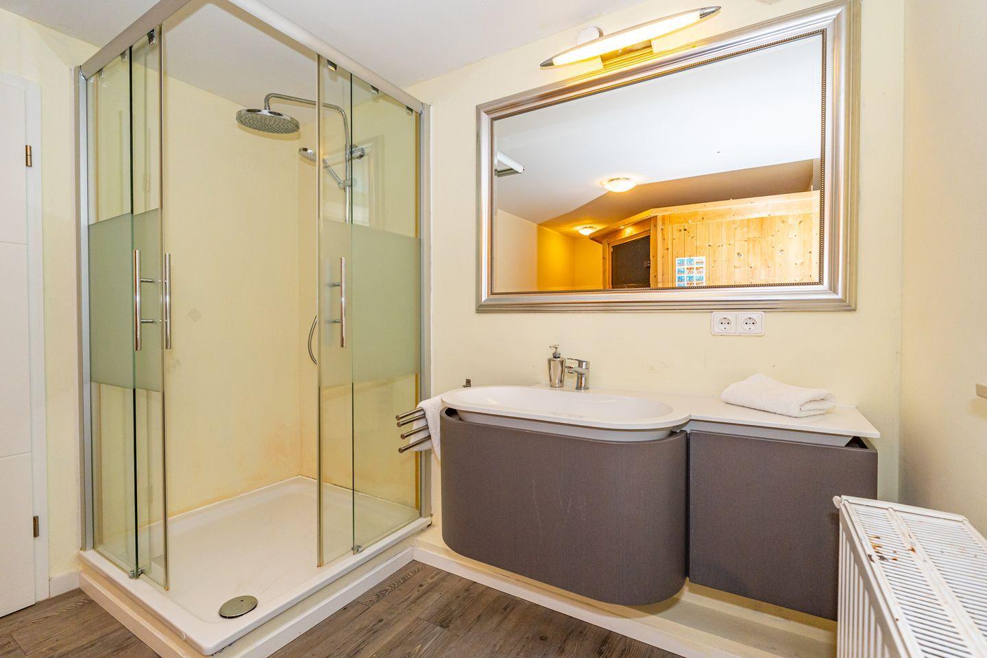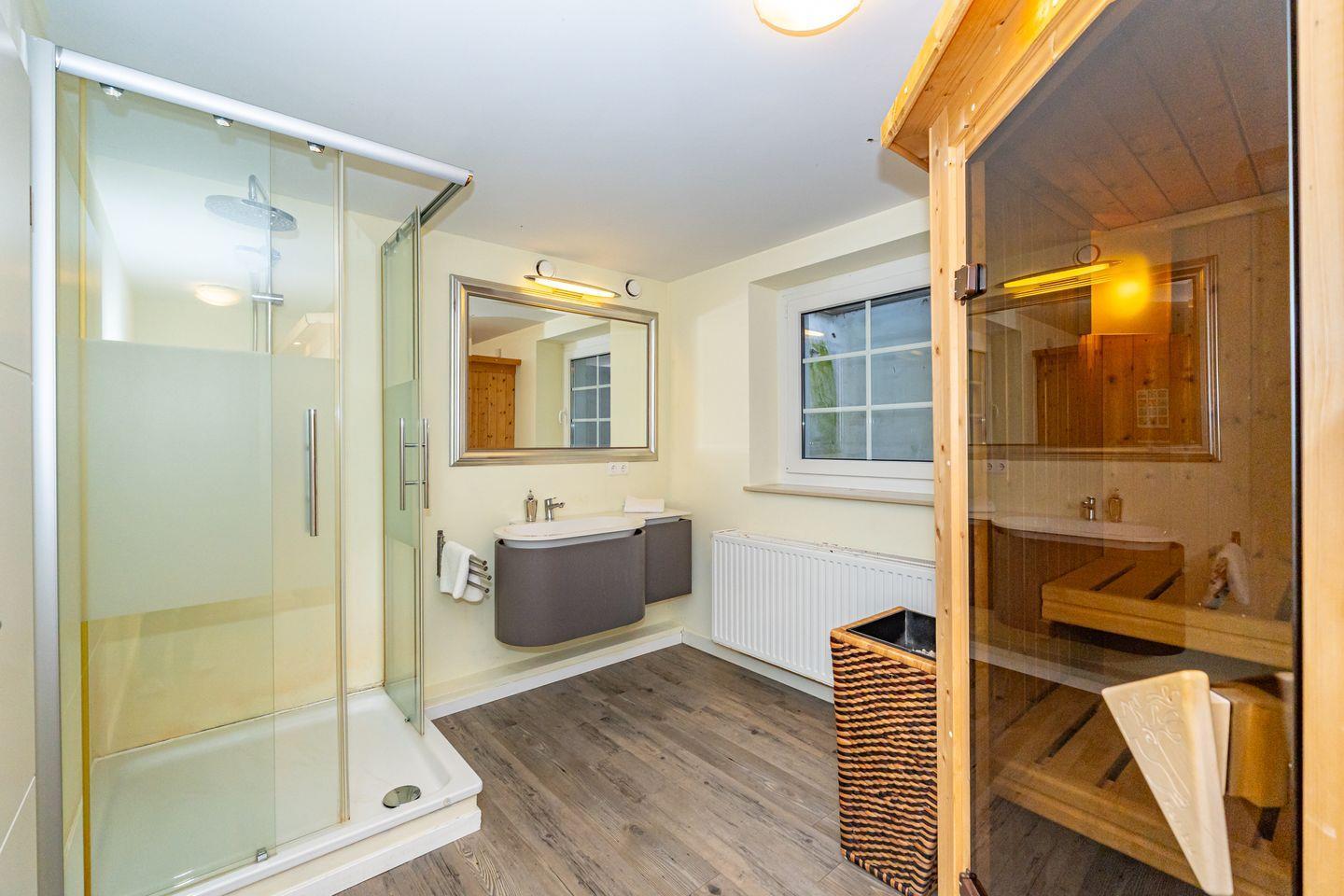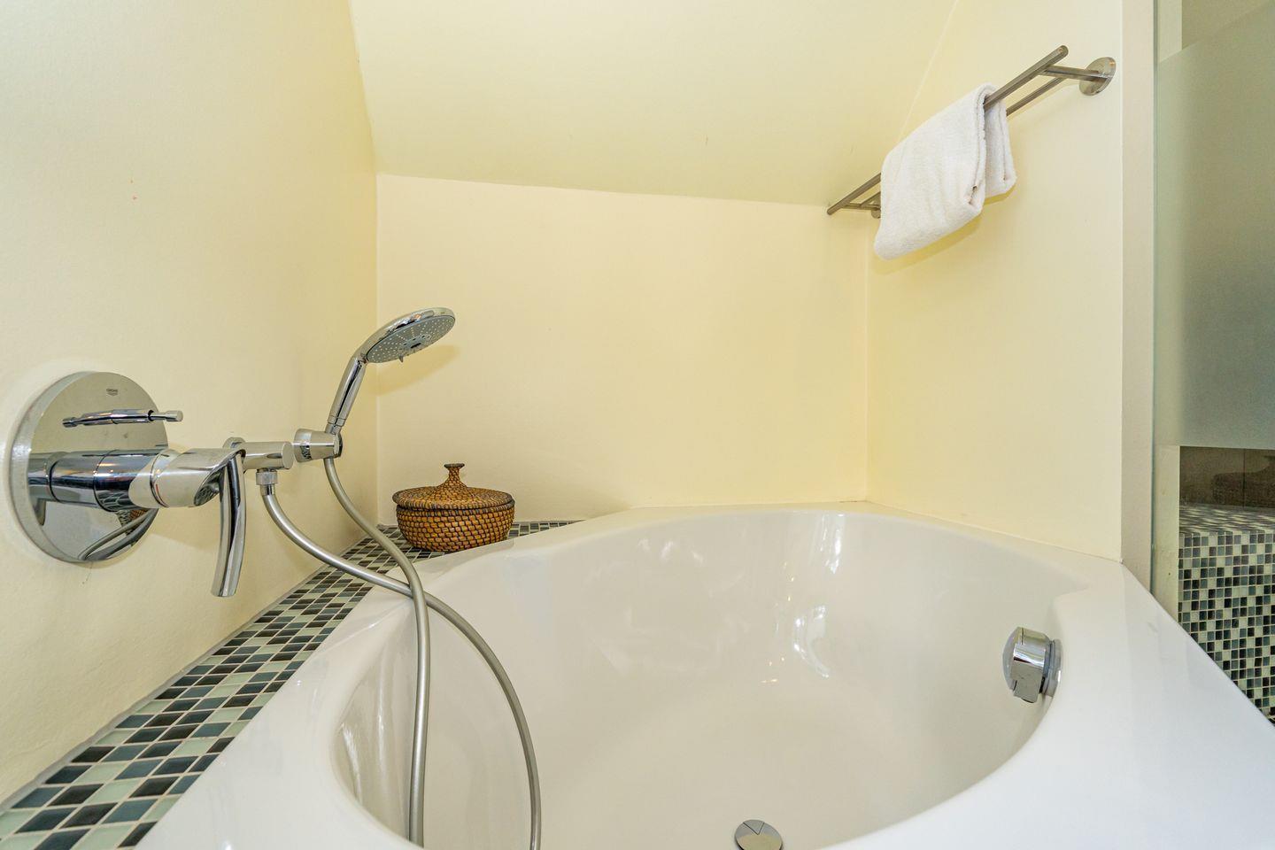 Die komplett ausgestattete Küche bietet neben einem Esstisch sämtliche Annehmlichkeiten, um gemeinsam zu kochen und Mahlzeiten zu genießen. Zur hochwertigen Ausstattung zählen unter anderem eine Waschmaschine, ein Trockner sowie zahlreiche Ablagemöglichkeiten. Die Villa umfasst zwei moderne Badezimmer, eines davon mit Badewanne, sowie eine Dusche. Darüber hinaus ist ein separates Gäste-WC vorhanden.