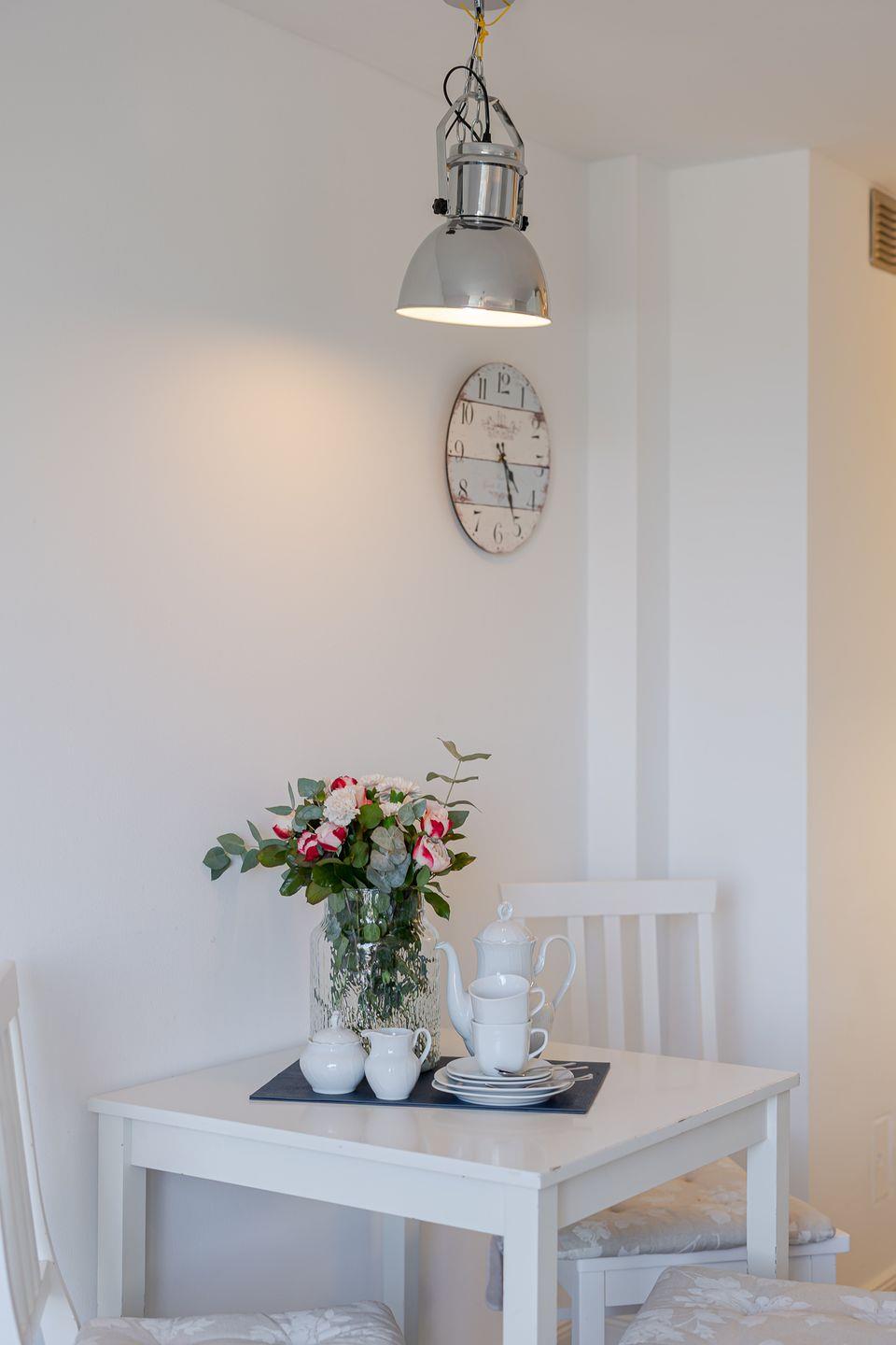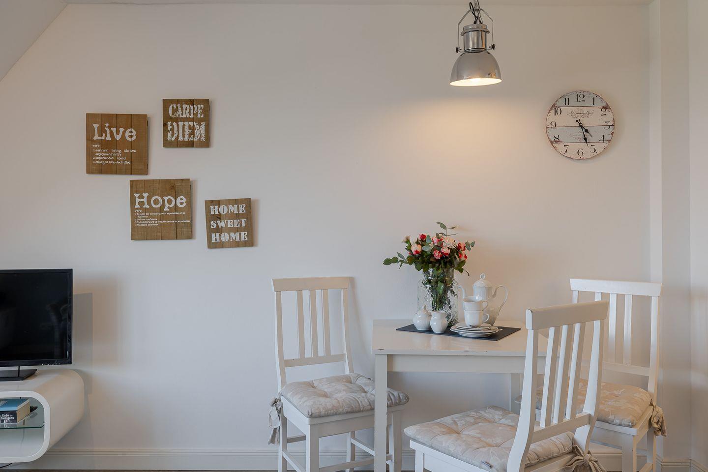 Der Wohnraum ist hell und freundlich eingerichtet und verbindet Wohnen, Essen und Kochen auf stimmige Weise. Die integrierte Küche ist vollständig ausgestattet und bietet alles, was es für eine entspannte Selbstversorgung braucht. Große Fenster sorgen für viel Tageslicht und eine offene, leichte Atmosphäre.