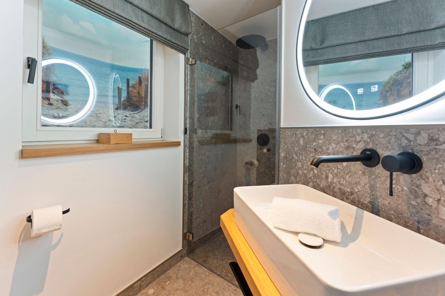 Im großzügigen Schlafzimmer mit einem komfortablen Doppelbett (180?×?200?cm) und eigenem Flat-TV finden Sie Ihre persönliche Ruheoase. Das moderne Badezimmer mit begehbarer Dusche sorgt für einen erfrischenden Start in den Tag – stilvoll, hell und hochwertig ausgestattet.