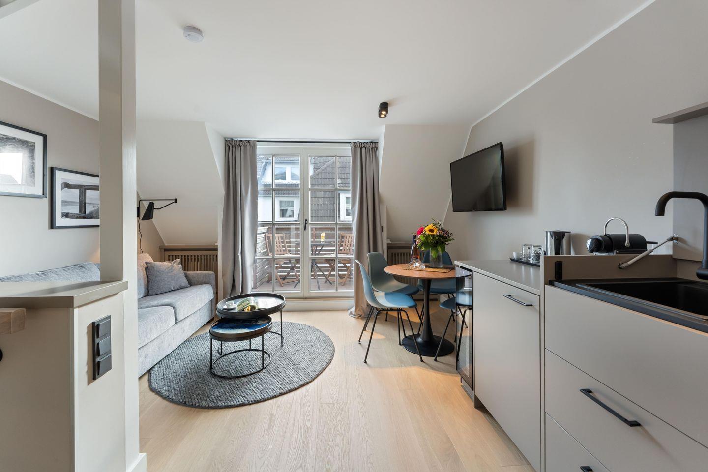 Diese charmante Ferienwohnung auf zwei Ebenen ist der ideale Rückzugsort für Paare oder Alleinreisende, die Sylt in vollen Zügen genießen möchten. Mit stilvollem, urbanem Design und durchdachter Ausstattung bietet sie auf ca. 55 qm alles, was das Urlaubsherz begehrt – inklusive Balkon mit seitlichem Meerblick und fußläufiger Nähe zum Strand.
