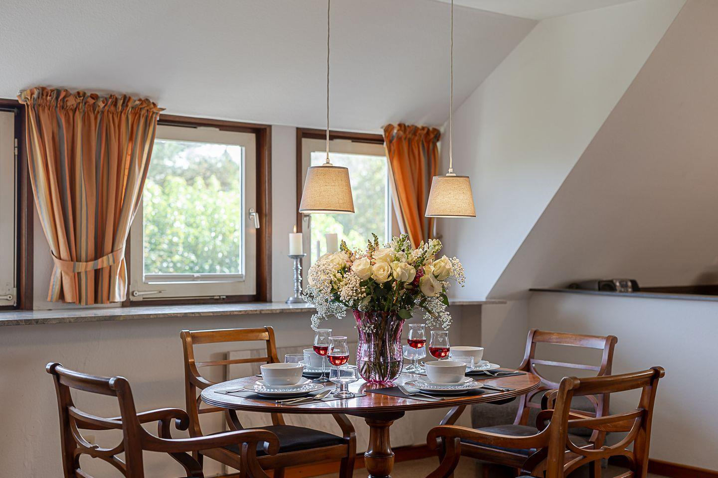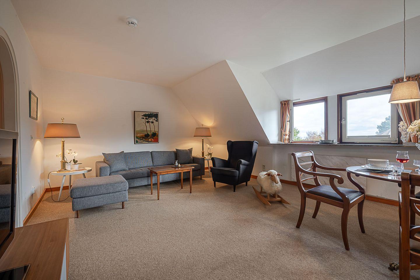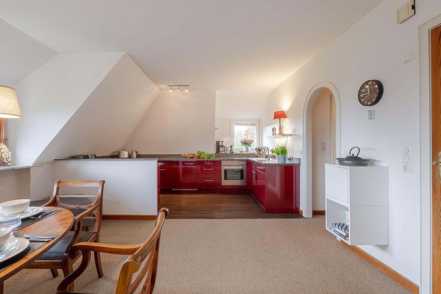 Das Herzstück der Wohnung ist der große Wohn- und Essbereich, der mit seiner Fensterfront den Blick über Reetdächer hinweg bis zum Wattenmeer freigibt. Hier trifft nordische Schlichtheit auf wohnliche Eleganz – gemütliche Sofas, warme Lichtstimmung und viel Platz für gemeinsame Stunden. Der angrenzende Essplatz lädt zu langen Frühstücken oder geselligen Abenden ein, während die offene Küche mit modernen Geräten (Backofen, Spülmaschine, Nespresso- und Filtermaschine) alles bietet, was man für den Urlaub braucht.