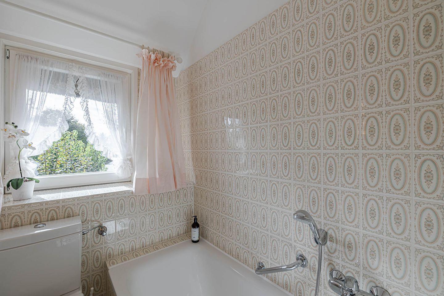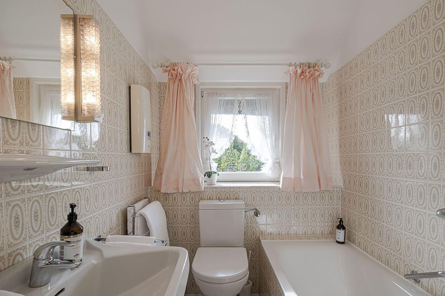 Das zweite Badezimmer begeistert mit seinem nostalgischen Charme: zartrosa Fliesen, eine gemütliche Badewanne und ein Fenster, das Tageslicht hereinlässt und für eine angenehme Atmosphäre sorgt. Hier darf man sich Zeit nehmen – ein Ort für Ruhe, Wärme und kleine Inselmomente.