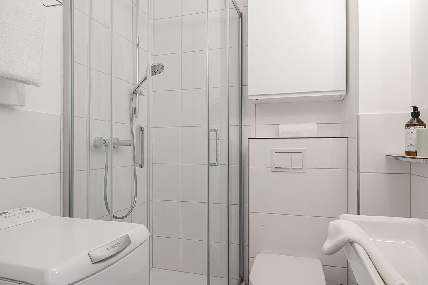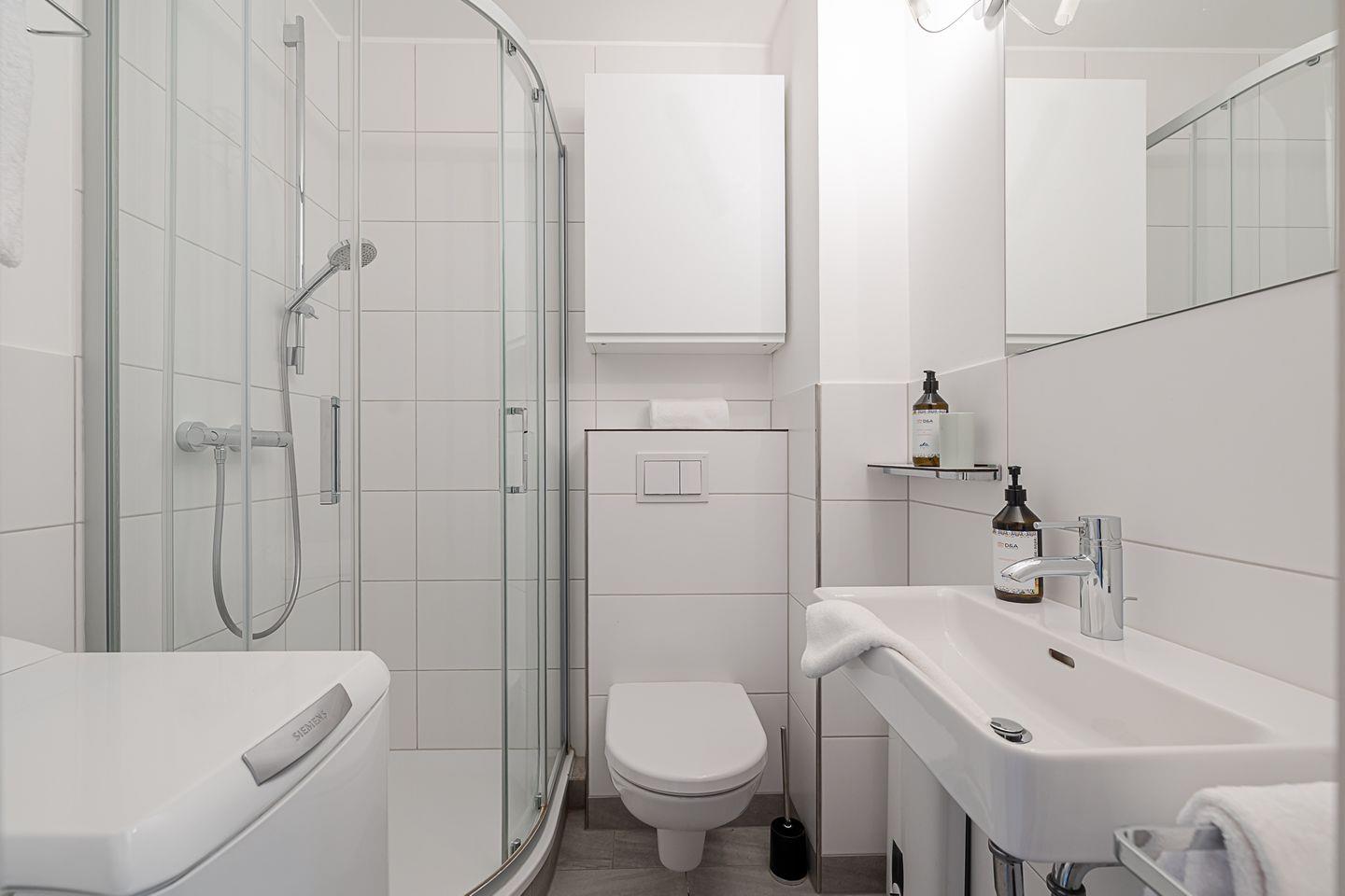 Das erste Badezimmer präsentiert sich hell und modernisiert, mit einer großzügigen Dusche und klaren Linien. Es verfügt zwar über kein Fenster, wirkt durch die helle Gestaltung und die stimmige Beleuchtung jedoch freundlich und einladend – perfekt für den Start in den Tag.