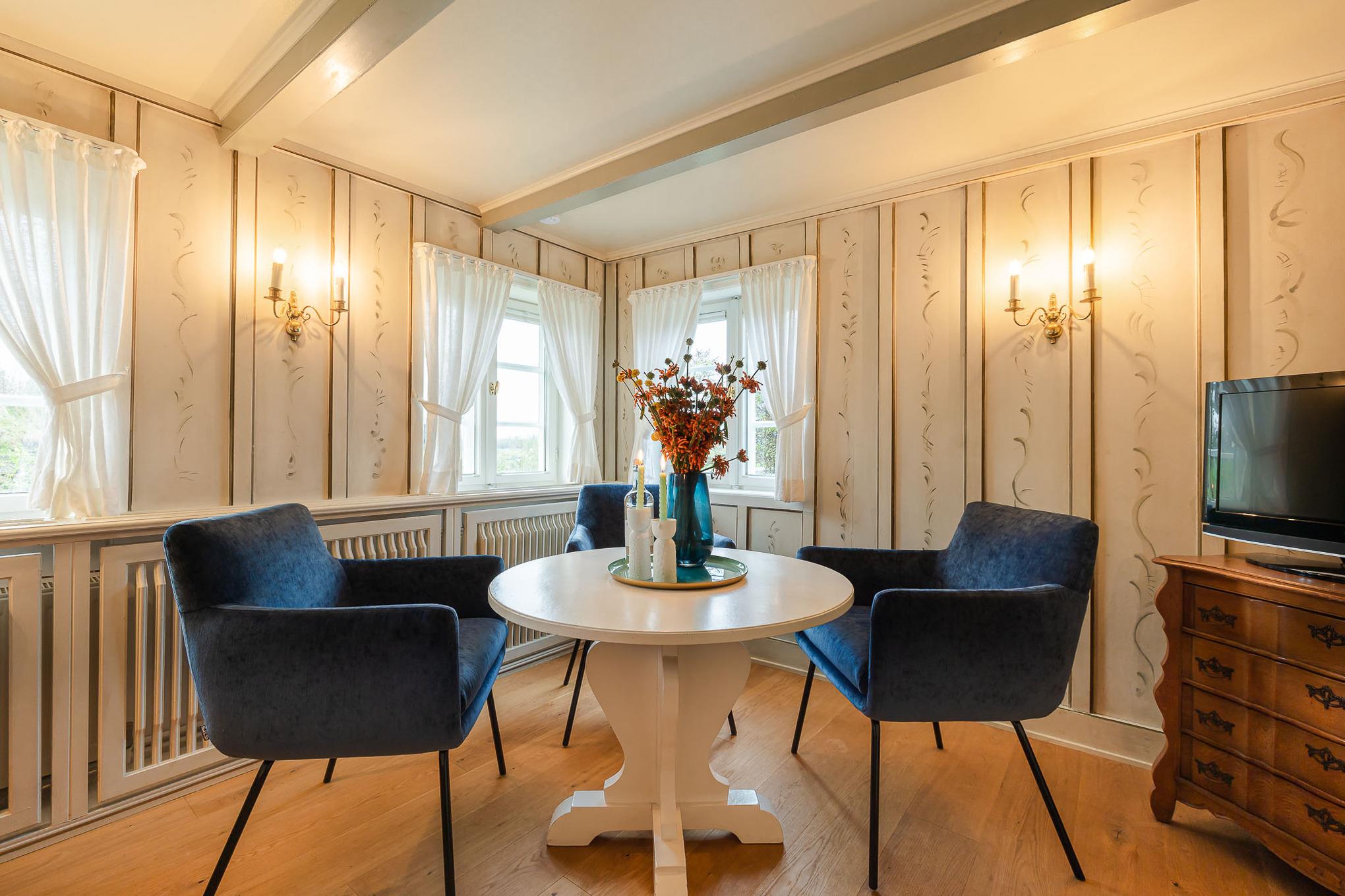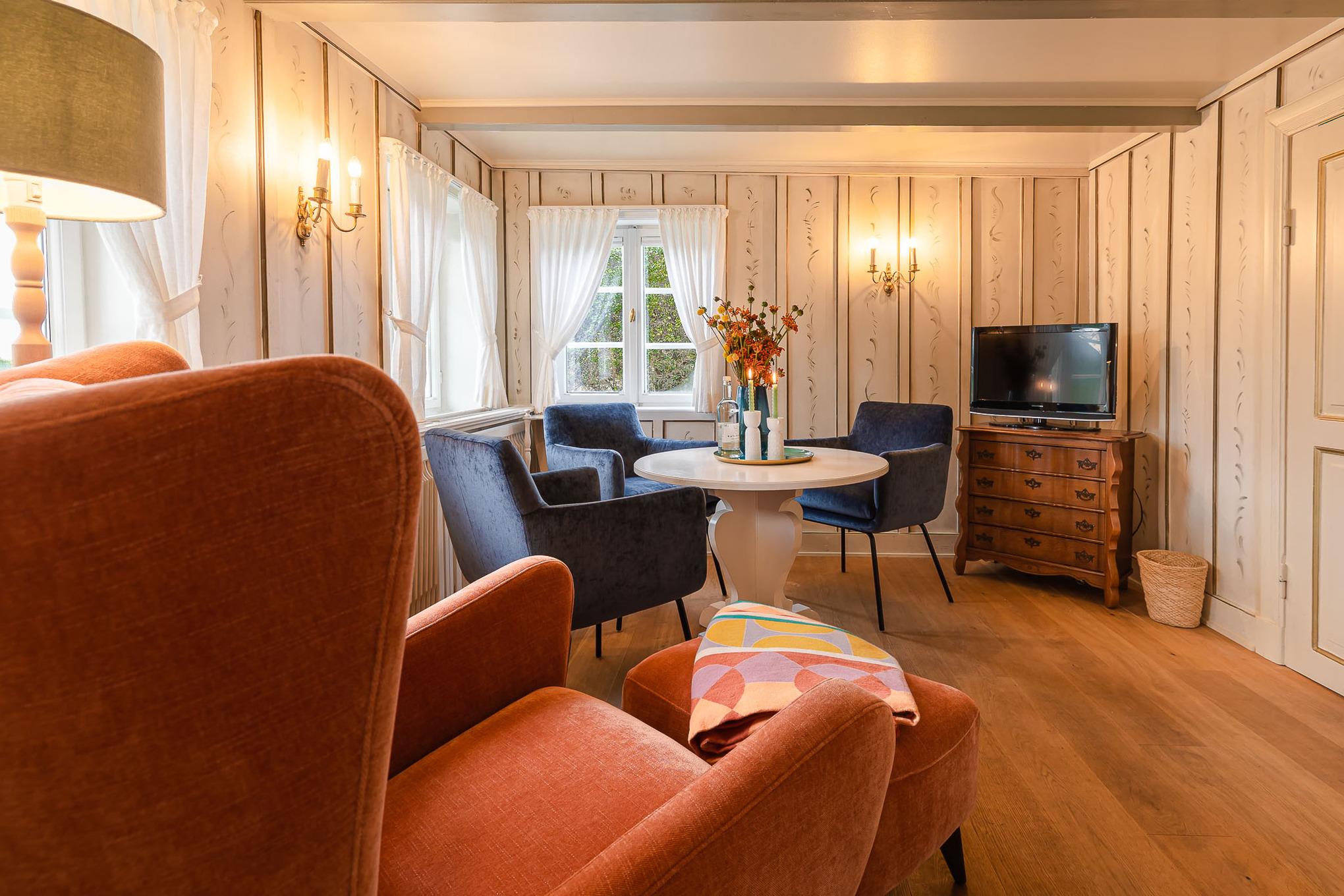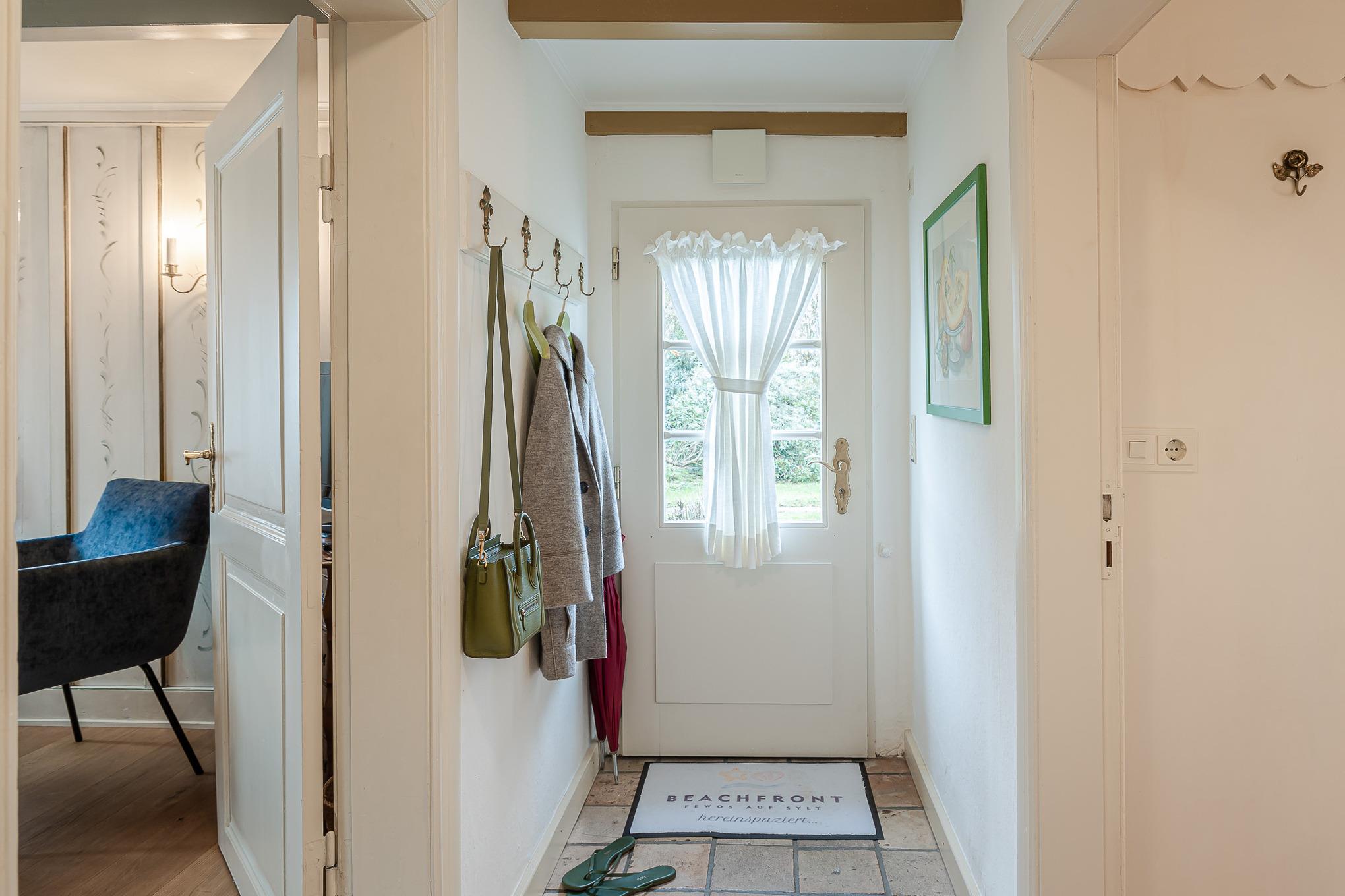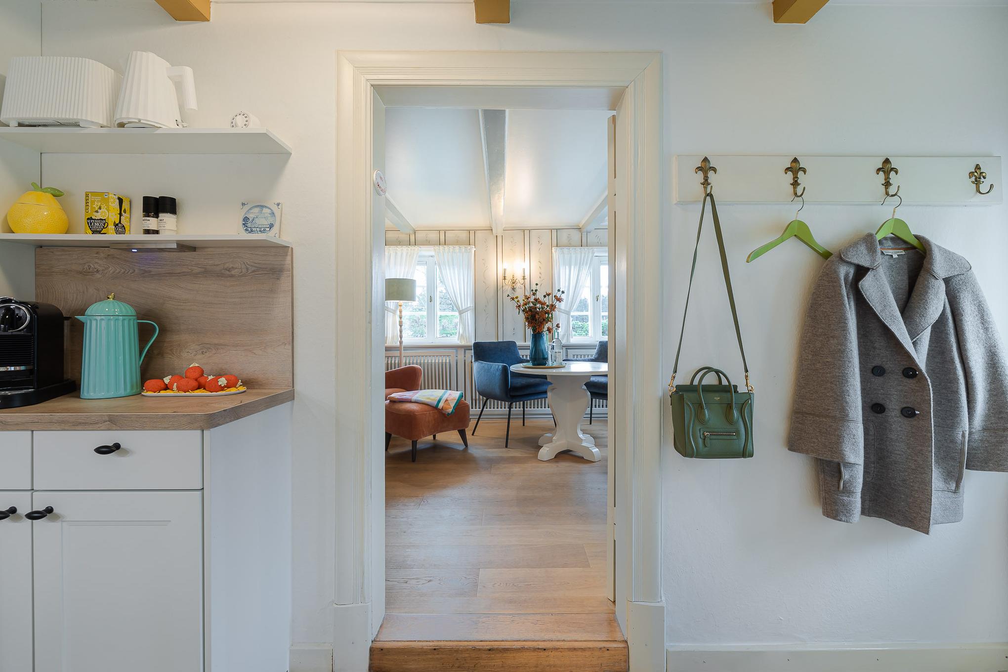 Weiter geht es zur Pantryküche – klein, fein und perfekt für den ersten Kaffee am Morgen oder eine kleine Mahlzeit zwischendurch. Direkt dahinter befindet sich das Badezimmer mit Dusche und WC. Gegenüber öffnet sich der Wohn- und Essbereich, in dem ein alter Friesenschrank mit originalem Friesengeschirr die Geschichte des Hauses lebendig hält. Hier können Sie lesen, spielen, fernsehen oder einfach den Tag ruhig ausklingen lassen. Dahinter liegt das zweite Schlafzimmer mit einem komfortablen Doppelbett für erholsame Nächte.