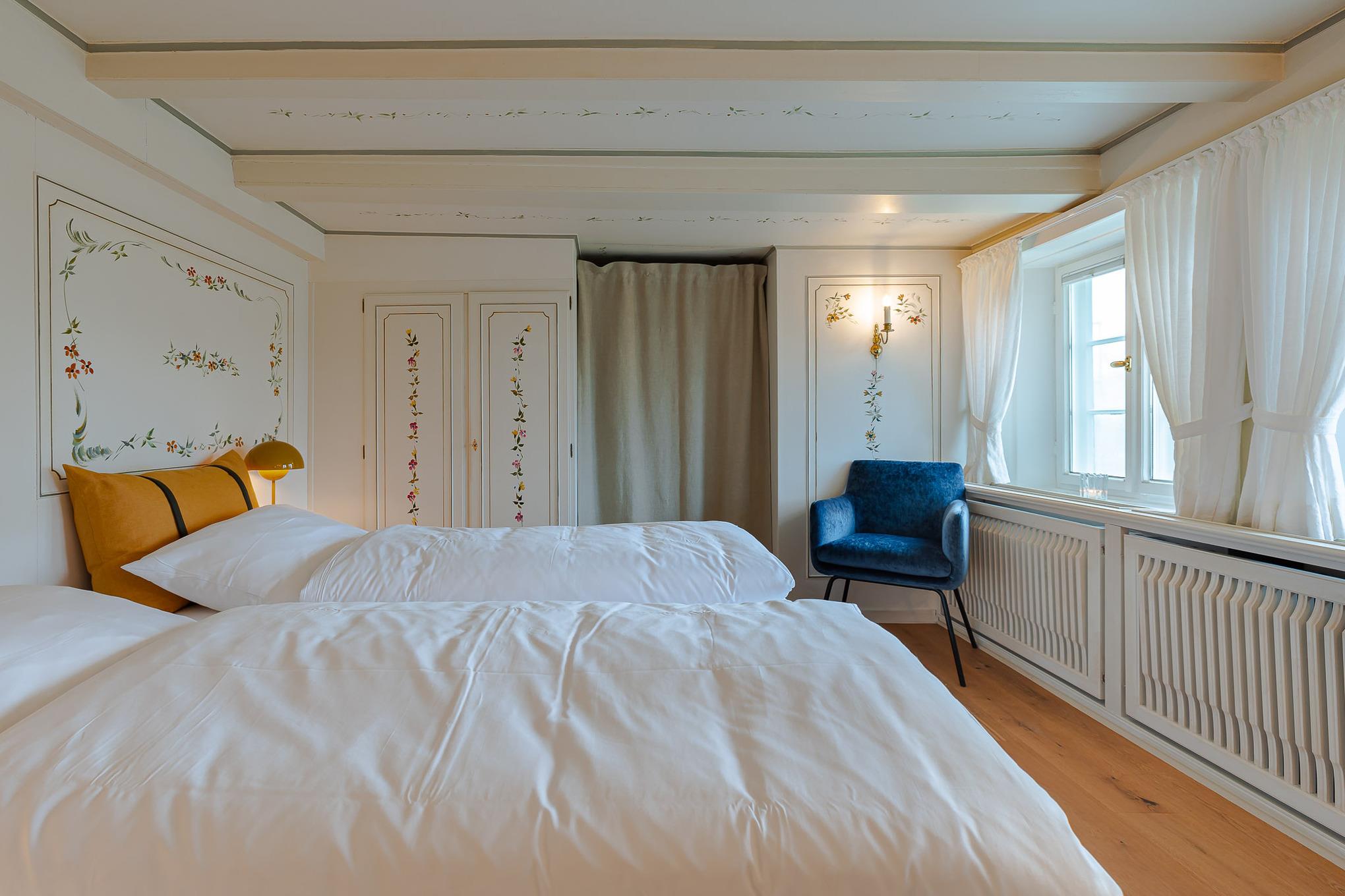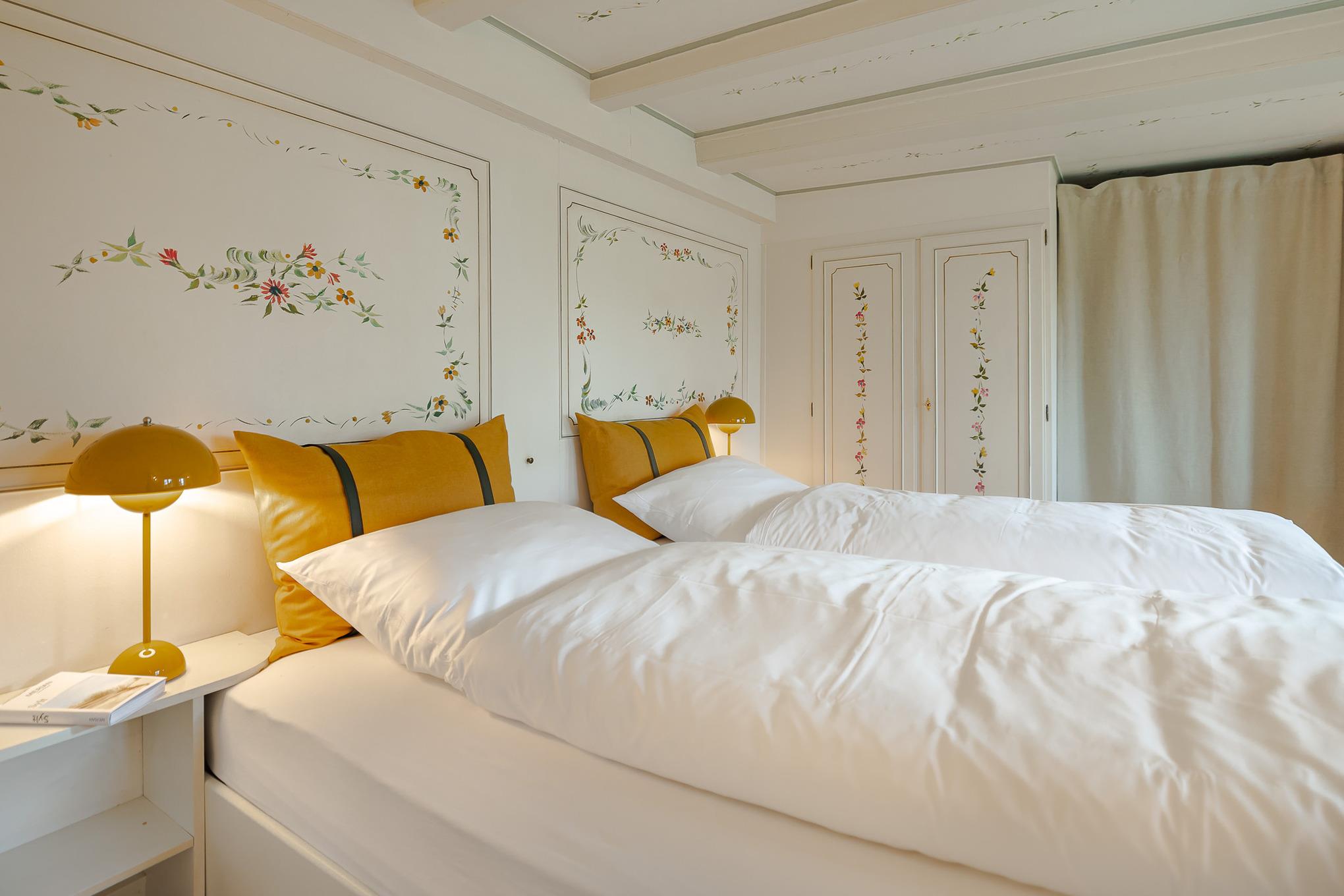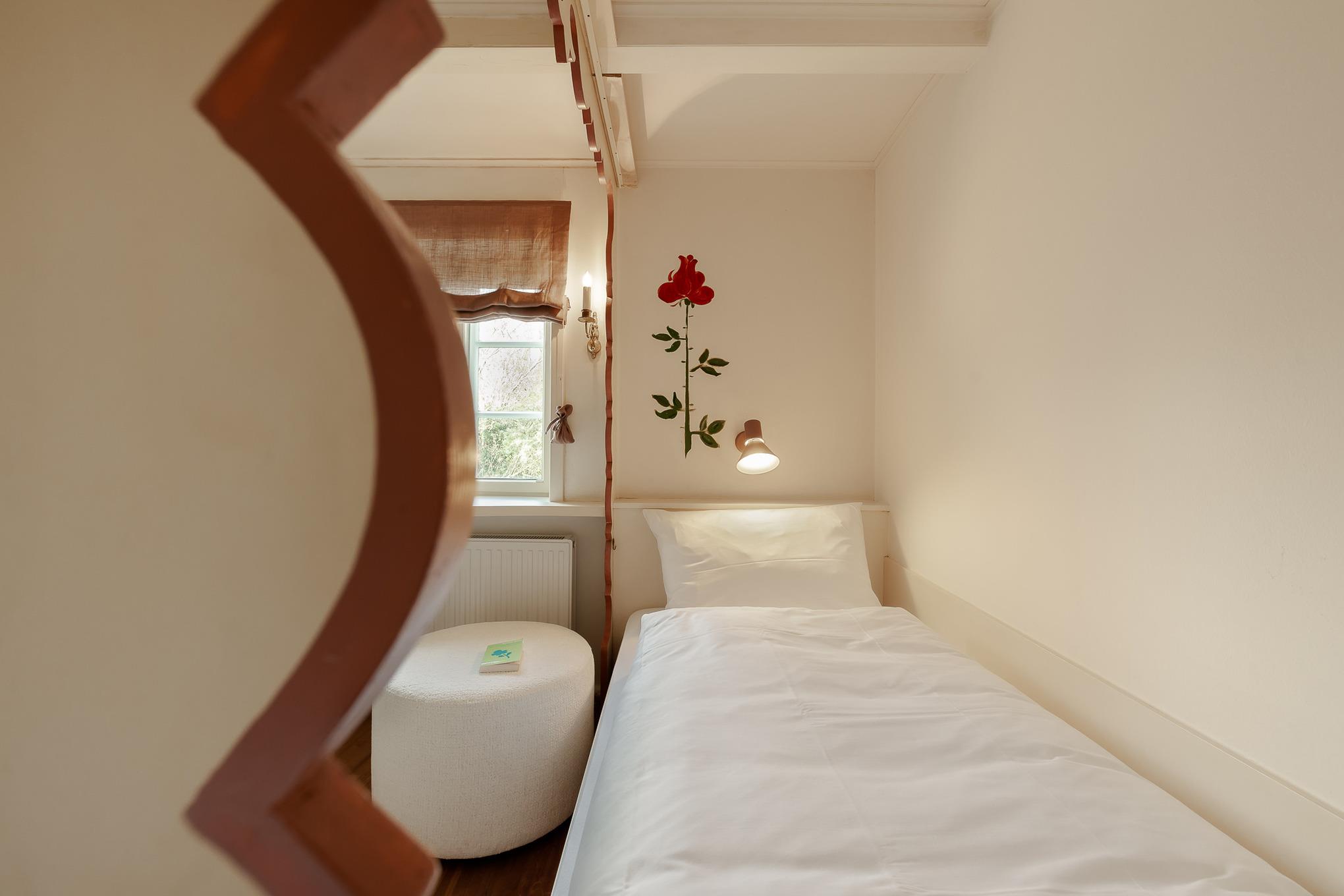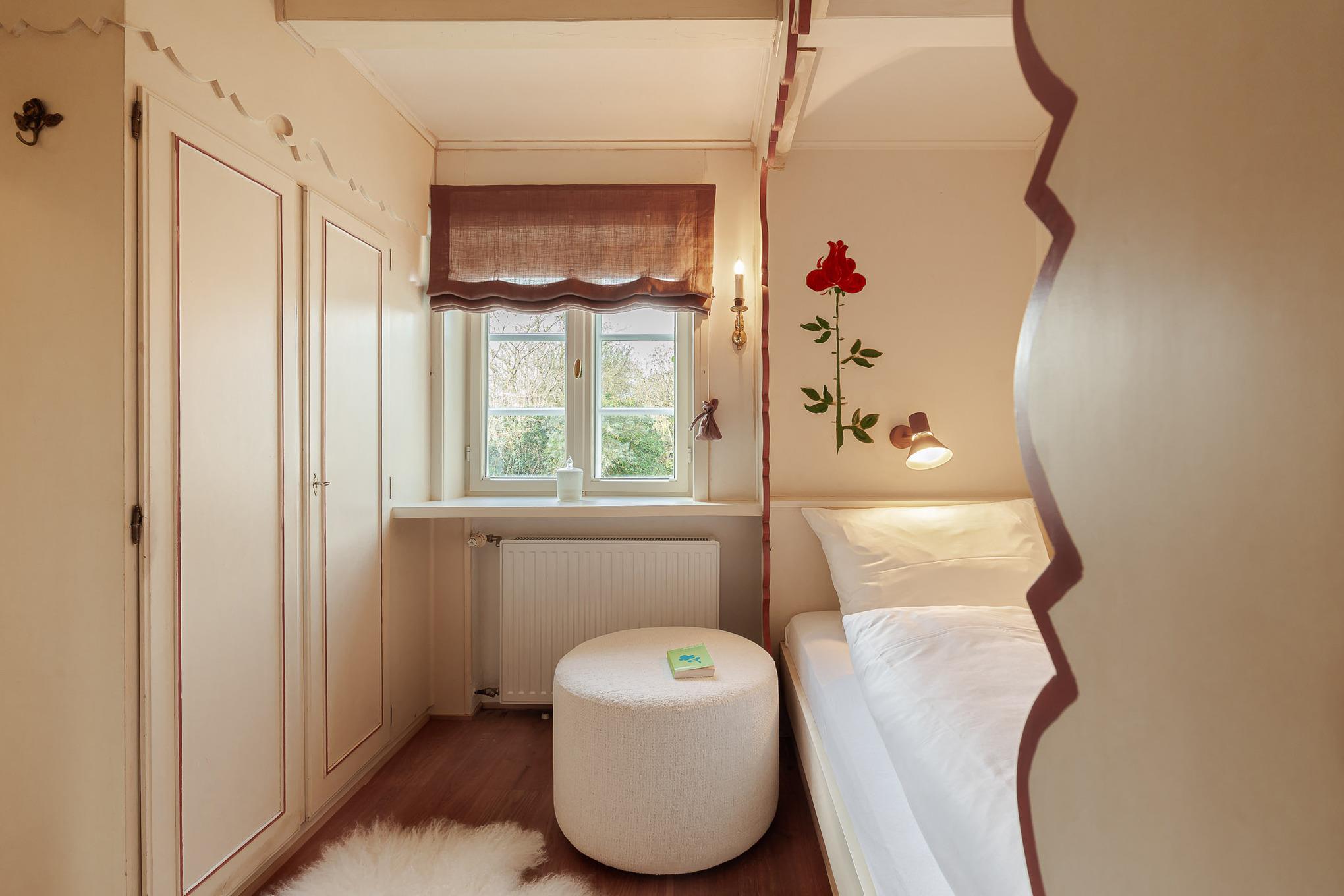 Schon beim Betreten der Wohnung empfängt Sie der fröhliche, warme Charakter von Bullerbü. Vom Flur aus gelangen Sie in das erste Schlafzimmer mit zwei gemütlichen Alkovenbetten, liebevoll ergänzt durch altrosafarbene Details. Eine handgemalte, apricotfarbene Rose an der Wand sorgt für einen besonderen, fast poetischen Akzent, während moderne Designelemente wie die Flowerpot-Lampe und ein kuscheliger Pouf dem Raum eine spielerische Leichtigkeit verleihen.