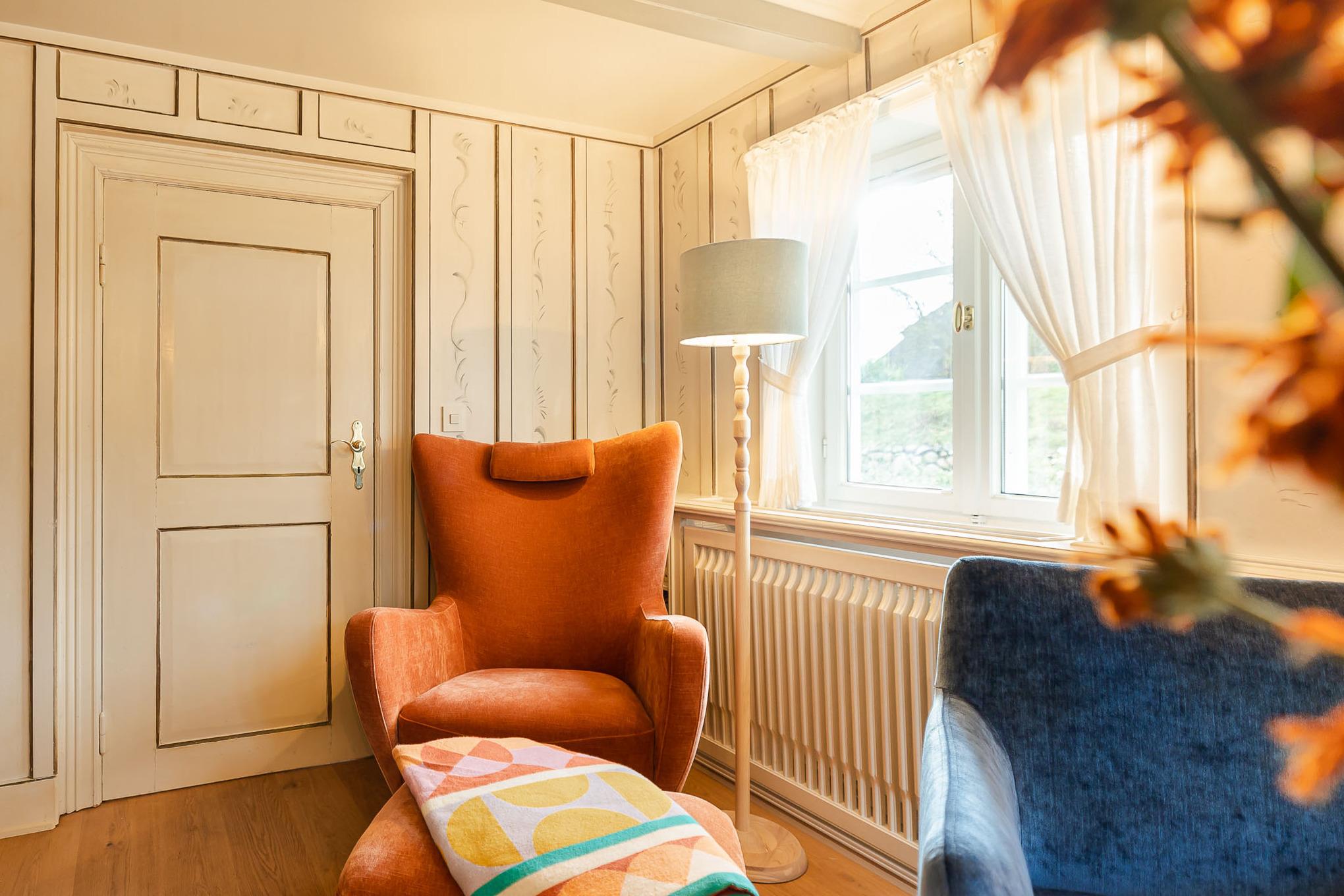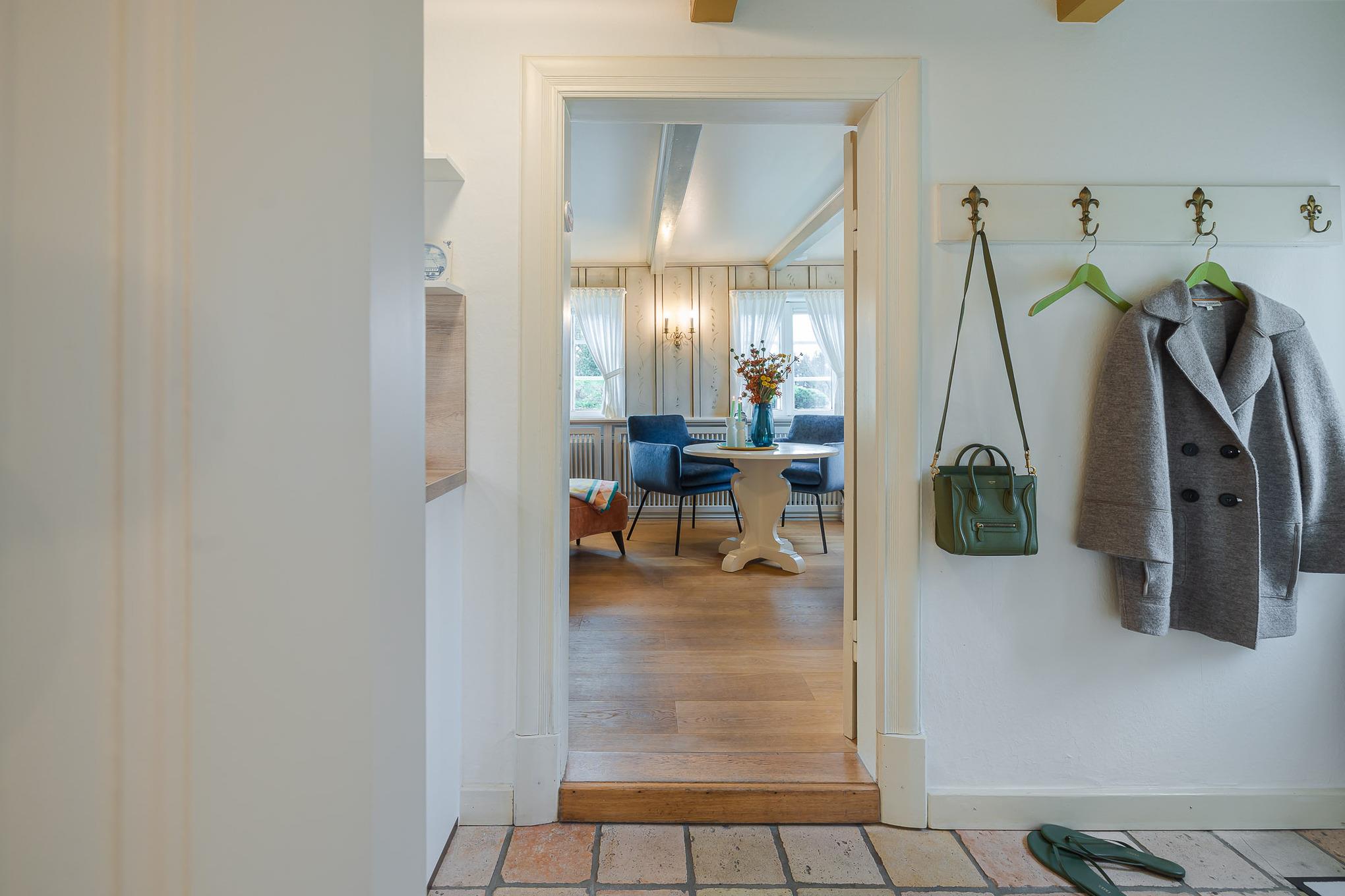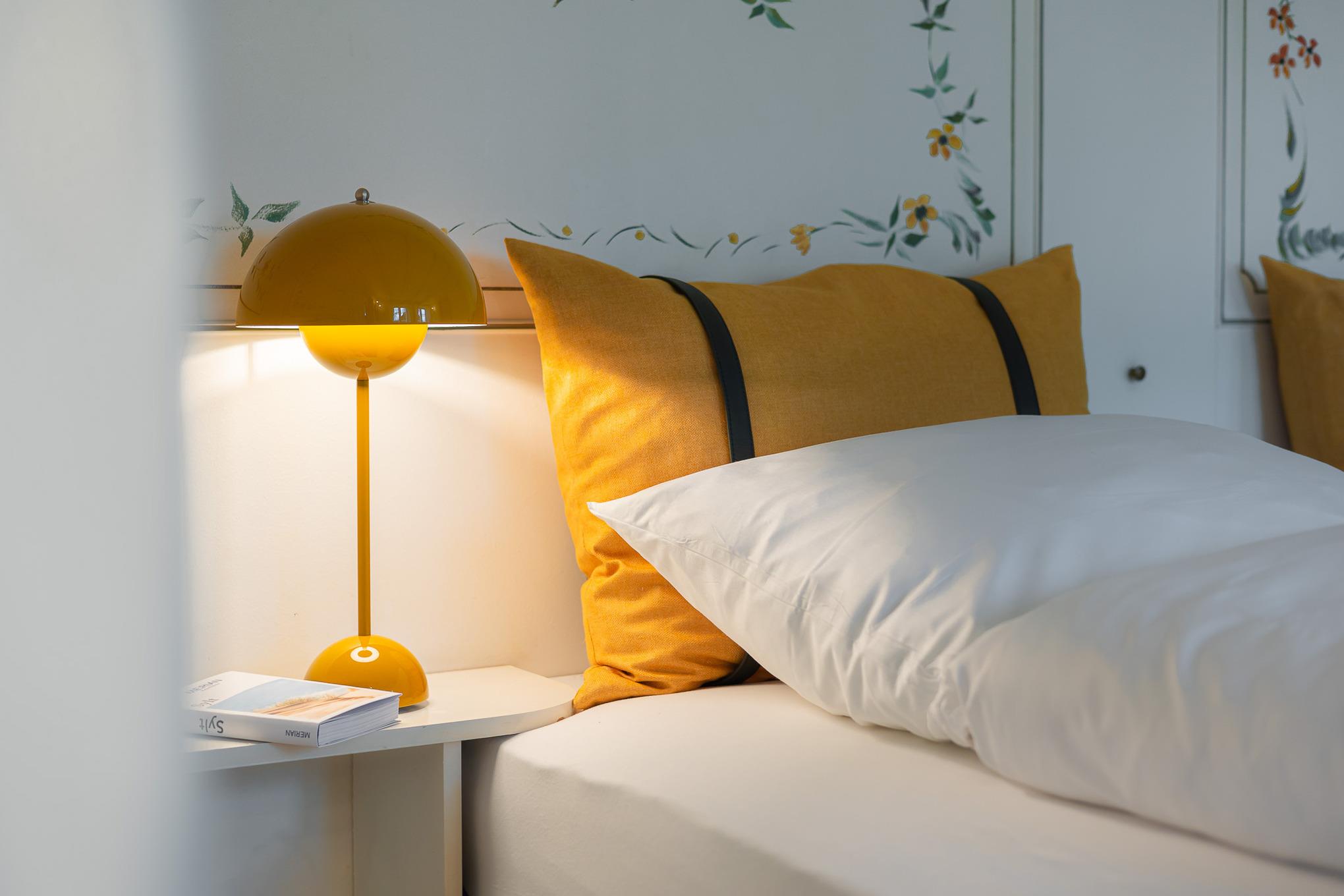 Schon beim Betreten der Wohnung empfängt Sie der fröhliche, warme Charakter von Bullerbü. Vom Flur aus gelangen Sie in das erste Schlafzimmer mit zwei gemütlichen Alkovenbetten, liebevoll ergänzt durch altrosafarbene Details. Eine handgemalte, apricotfarbene Rose an der Wand sorgt für einen besonderen, fast poetischen Akzent, während moderne Designelemente wie die Flowerpot-Lampe und ein kuscheliger Pouf dem Raum eine spielerische Leichtigkeit verleihen.