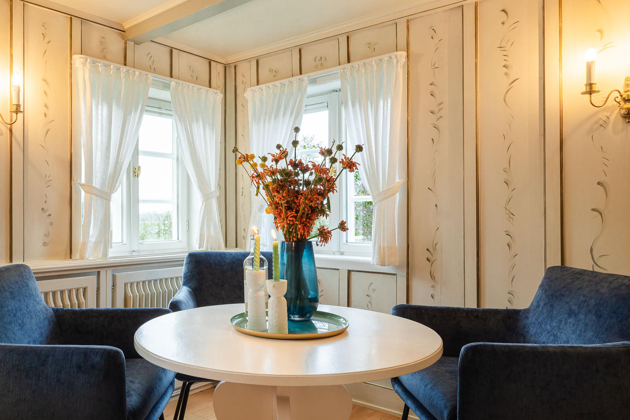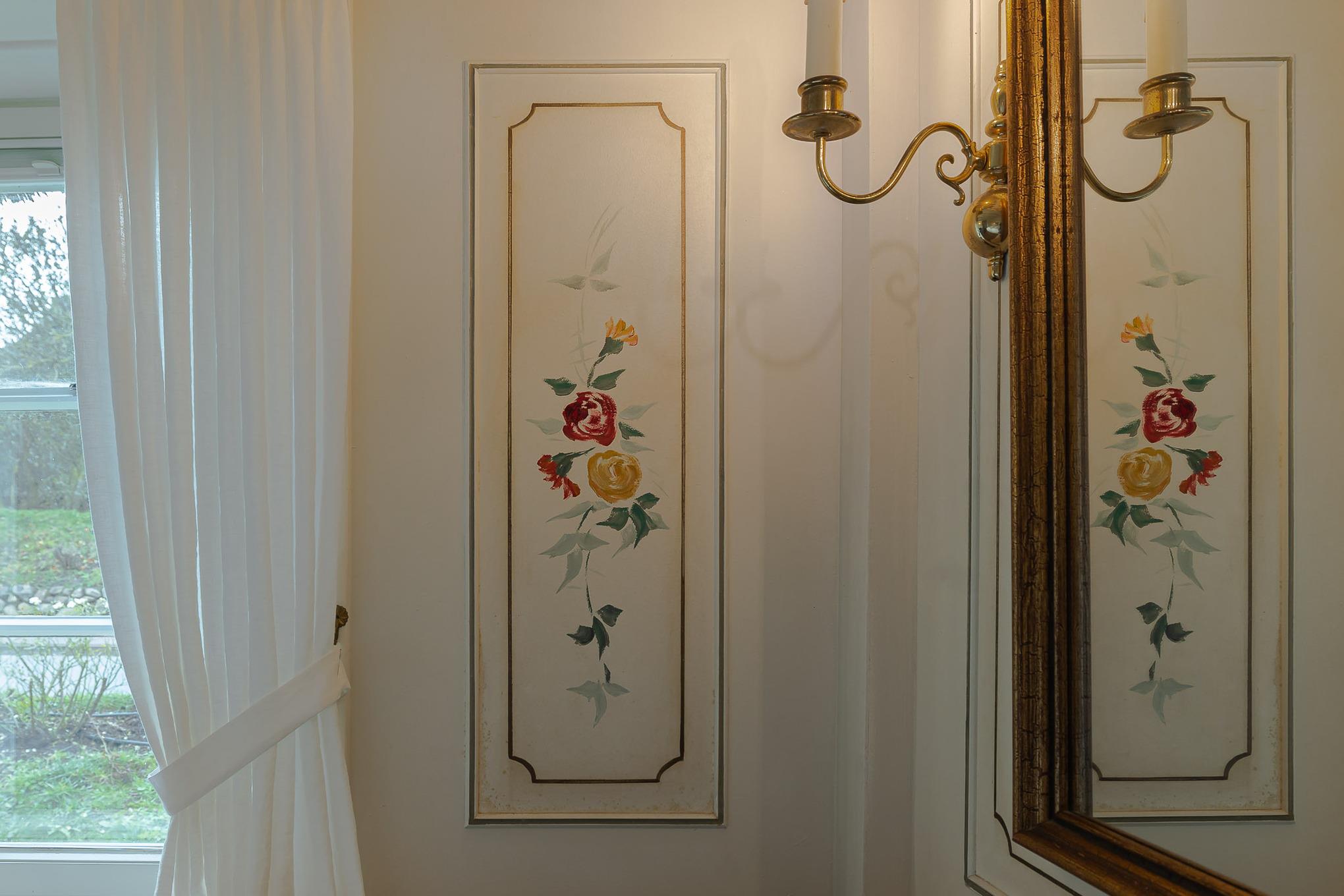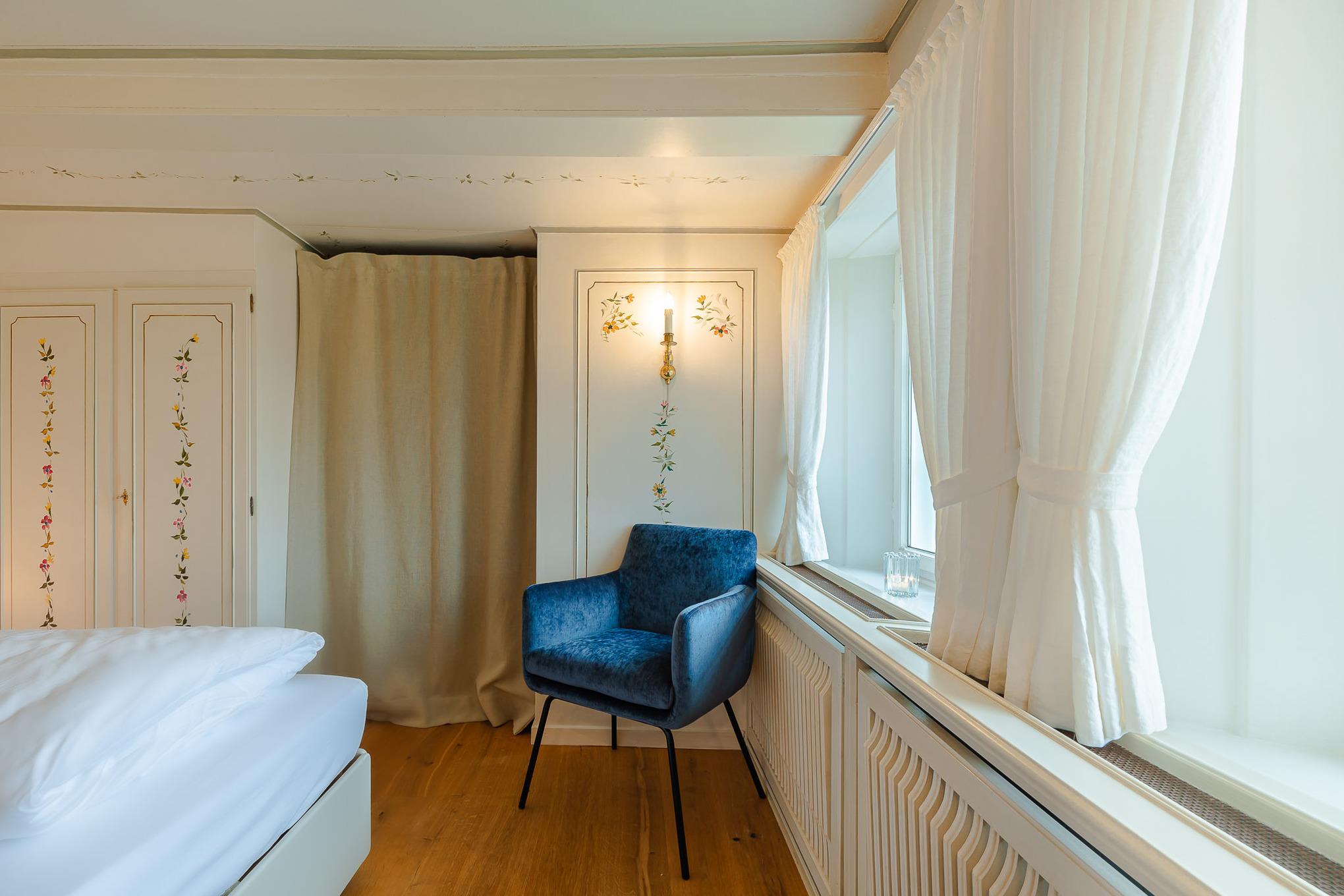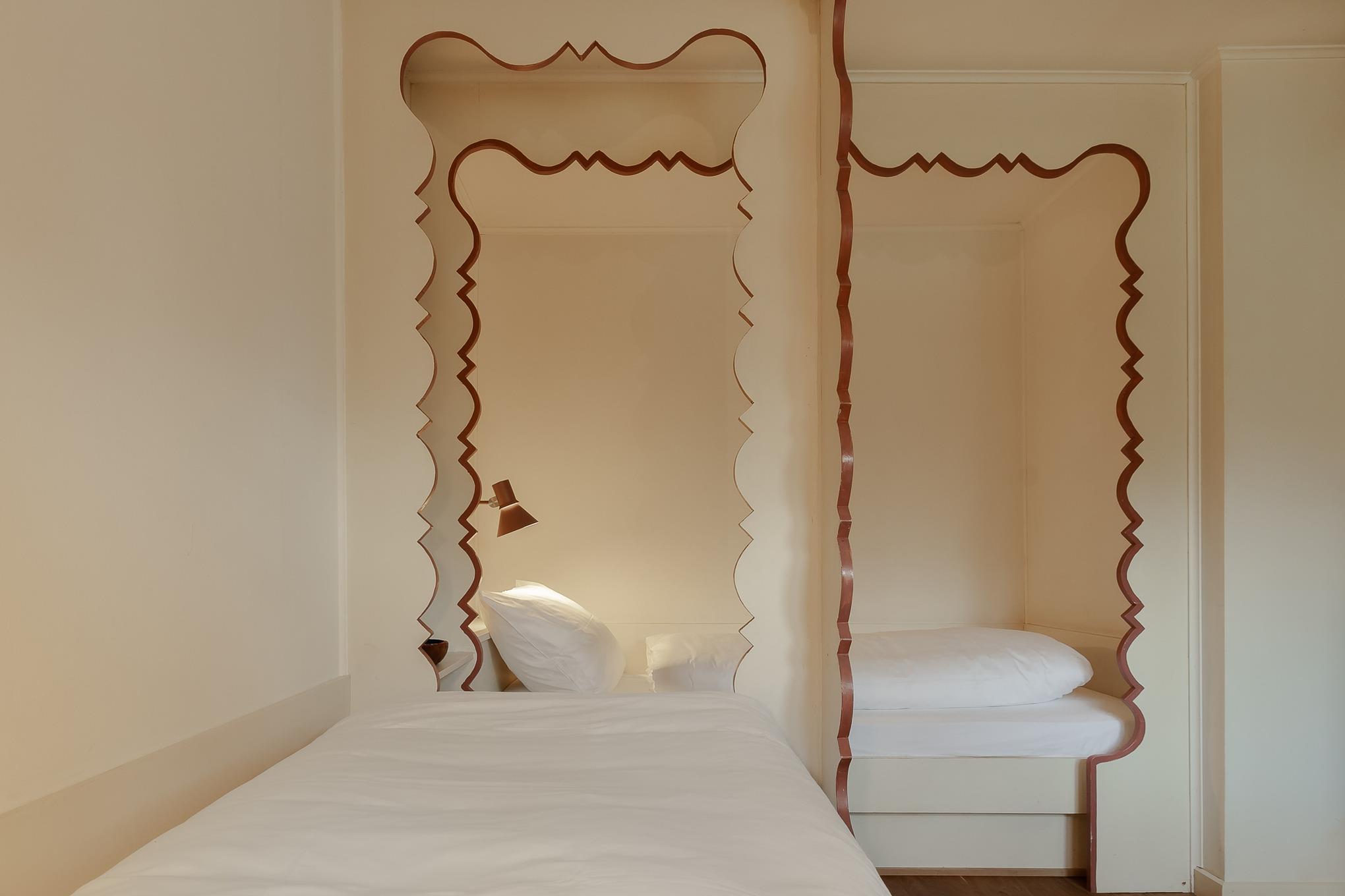 Schon beim Betreten der Wohnung empfängt Sie der fröhliche, warme Charakter von Bullerbü. Vom Flur aus gelangen Sie in das erste Schlafzimmer mit zwei gemütlichen Alkovenbetten, liebevoll ergänzt durch altrosafarbene Details. Eine handgemalte, apricotfarbene Rose an der Wand sorgt für einen besonderen, fast poetischen Akzent, während moderne Designelemente wie die Flowerpot-Lampe und ein kuscheliger Pouf dem Raum eine spielerische Leichtigkeit verleihen.