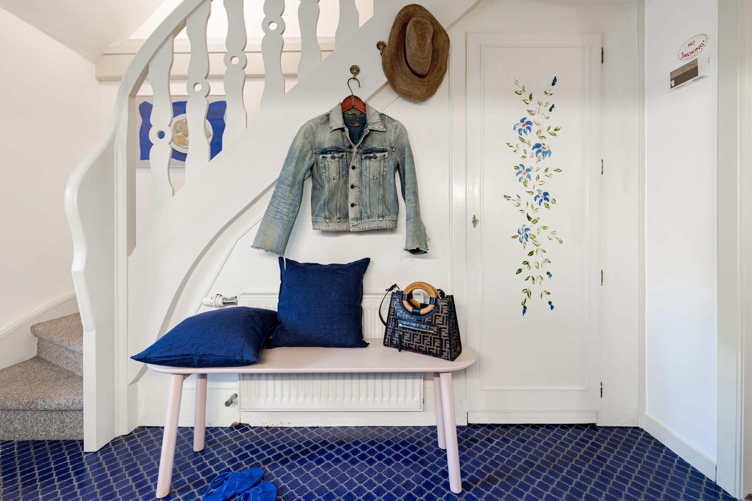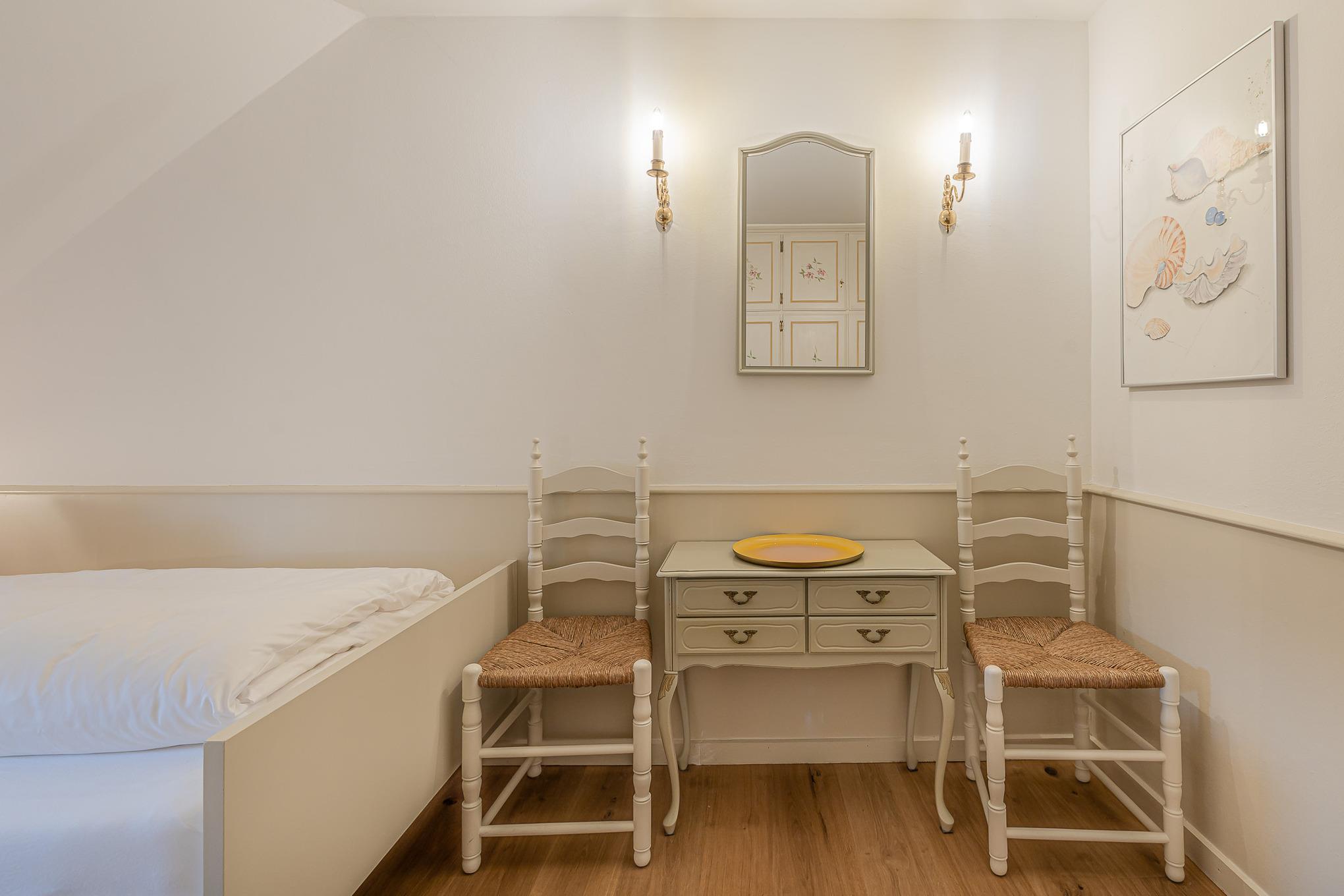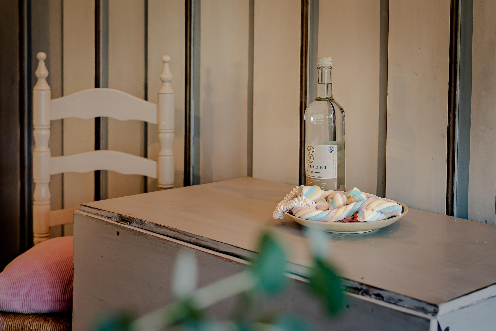 Auf zwei Stockwerken kommt die Mischung des alten Charmes und der modernen Einrichtung gut zur Geltung. Wenn Sie hereinkommen, stehen Sie direkt im Flur, wo sich auch die Küchenzeile befindet. Weiter durch können sie es sich im Wohnzimmer auf dem hellblauen Samtsofa gemütlich machen. Die wunderschöne, alte Junghans Uhr verleiht dem Raum einen ganz besonderen Charme und ist ein echter Hingucker. Auf der oberen Etage finden Sie das Schlafzimmer mit zwei gemütlichen Einzelbetten, direkt gegenüber befindet sich das Badezimmer mit Fenster und einer Dusche.
