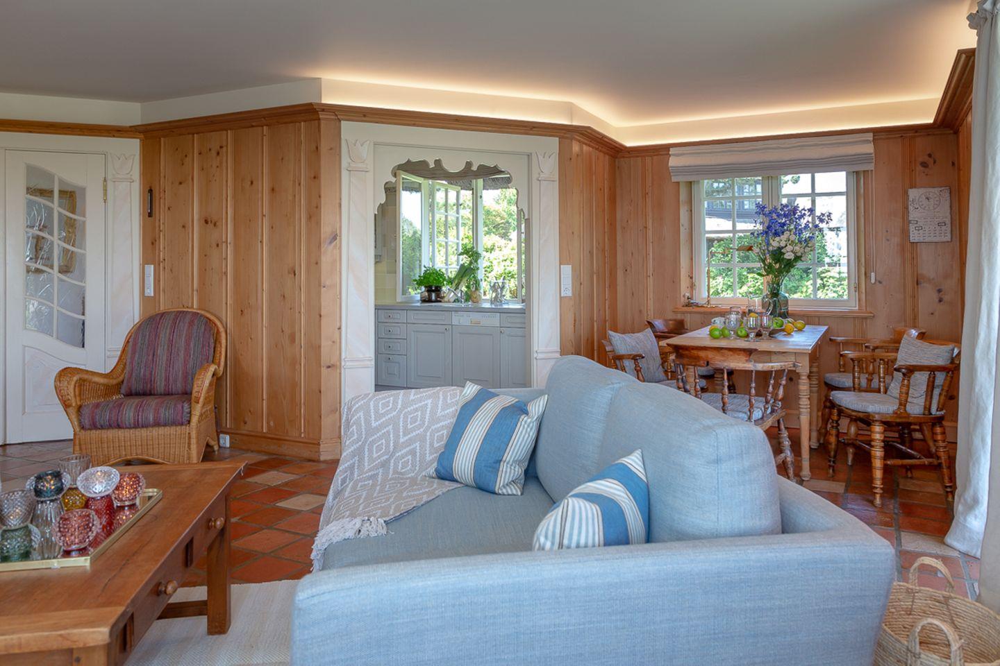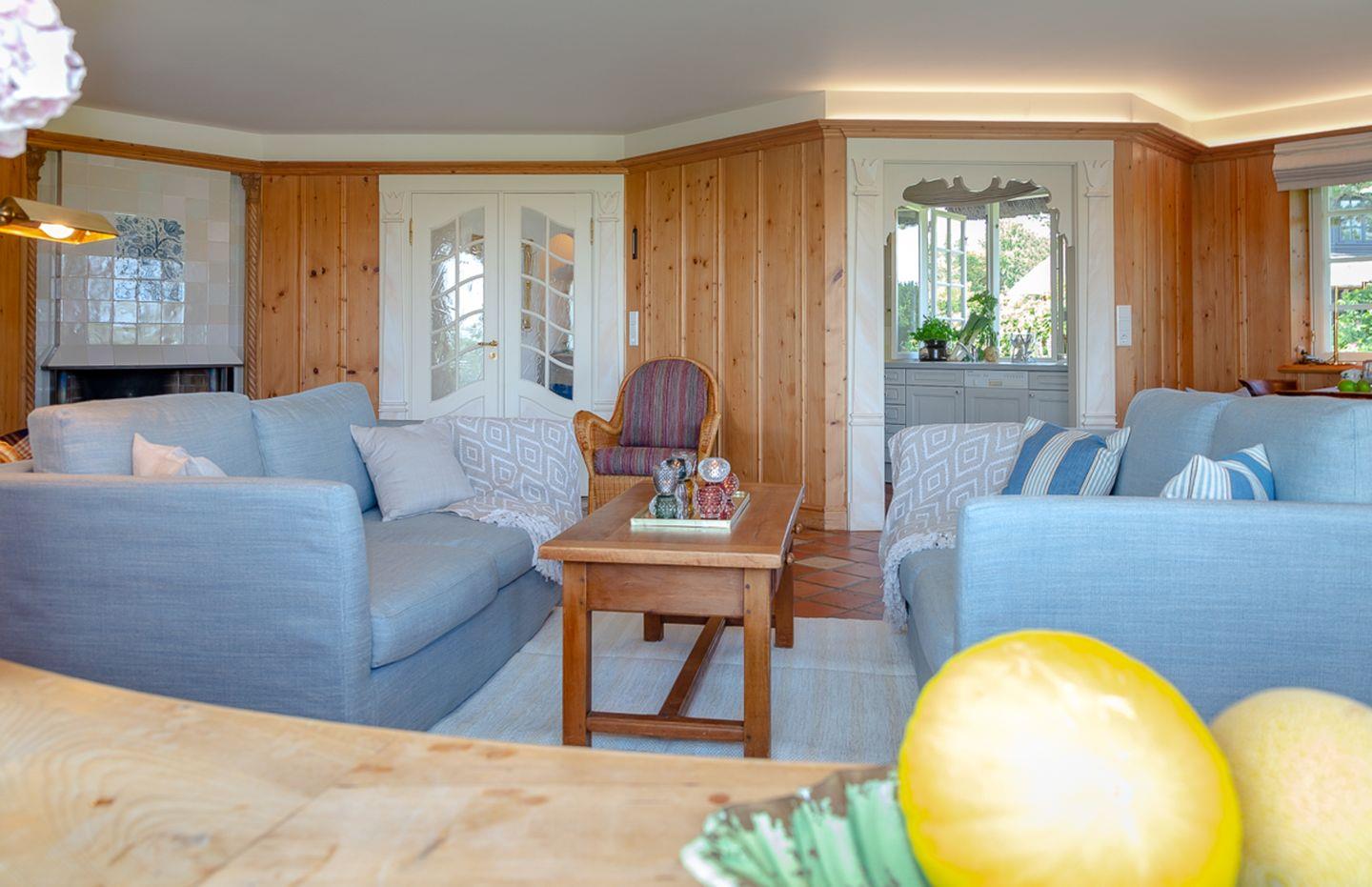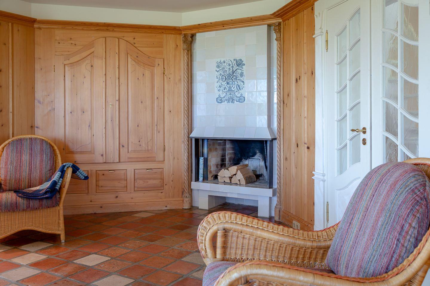 Verbringen Sie verträumte Stunden in Ihrem behaglichen Wohnzimmer, in dem Sie im Winter am Kamin sitzen und den unverstellten Blick auf das Meer genießen können. In diesem Haus wird das Motto „Wertschätzung statt Vergeudung“ großgeschrieben und so bietet Ihnen der leicht separate Küchenbereich – im Sinne der Nachhaltigkeit – eine gelungene Kombination aus hochwertiger Ausstattung und älteren Küchengeräten, durch die sich die Selbstversorgung im Urlaub einfach gut anfühlt.