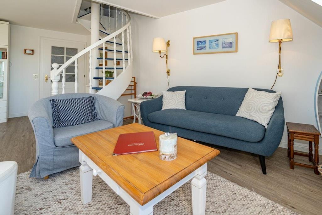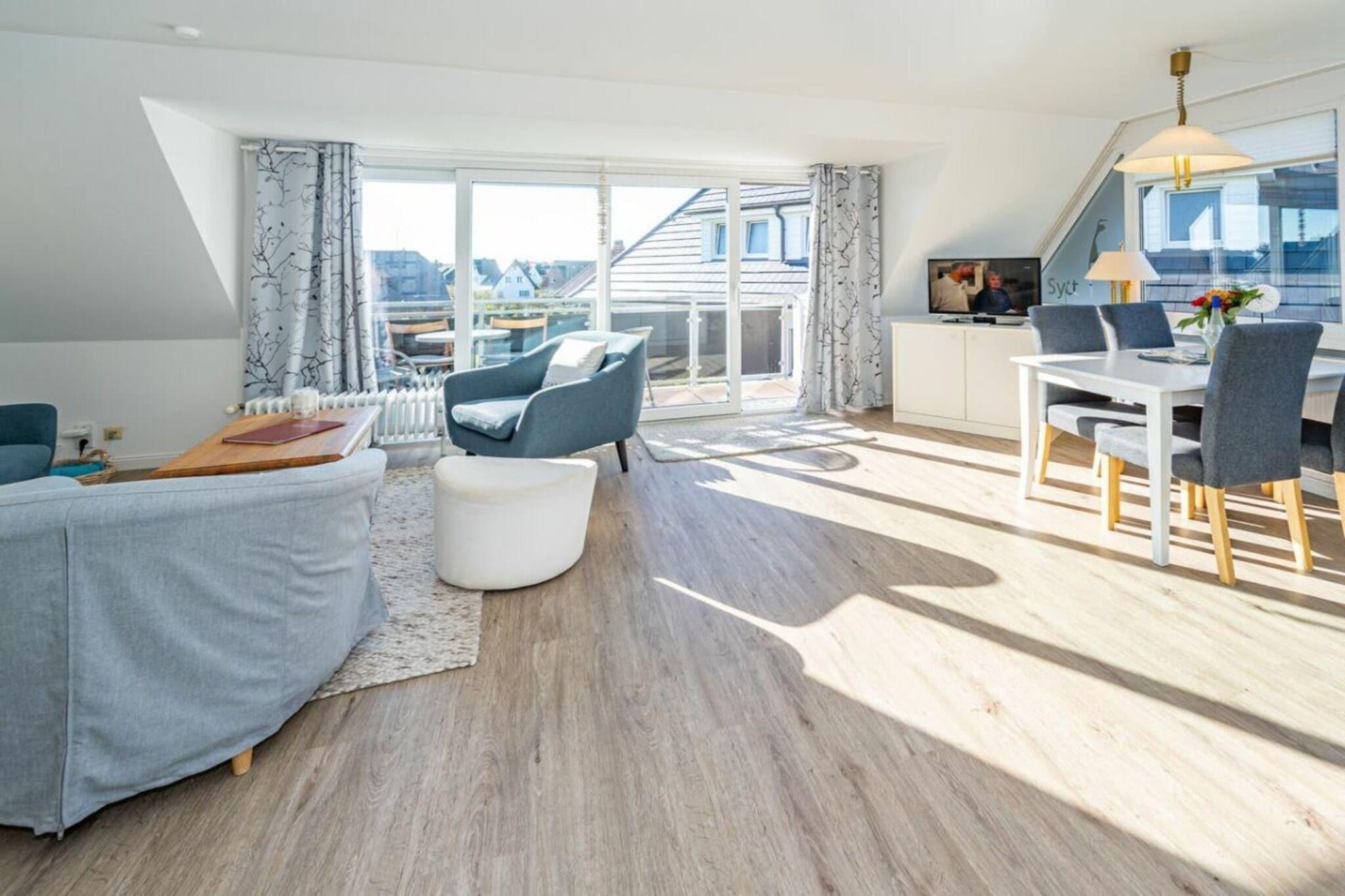 Appartement Seepferdchen Vom großen Süd - Balkon genießen sie einen traumhaften Blick über die Dächer von Wenningstedt bis zu den Dünen. Im Obergeschoss befindet sich die Ferienwohnung Seepferdchen, die 2021 frisch renoviert wurde. Nach dem keinen Flur sind Sie im großen Wohn-Essbereich. Separat dazu finden Sie eine Einbauküche mit allen nötigen Geräten. Vor der Fensterfront ist der gemütliche Balkon mit Südlage. Der Esstisch befindet sich in der eleganten Wohnumgebung. Das Duschbad mit WC befindet sich ebenfalls auf dieser Ebene. Im oberen Bereich finden Sie dann noch das Schlafzimmer mit einem Doppelbett und vielen Schränken für Ihre Garderobe. Haustiere werden nicht gestattet