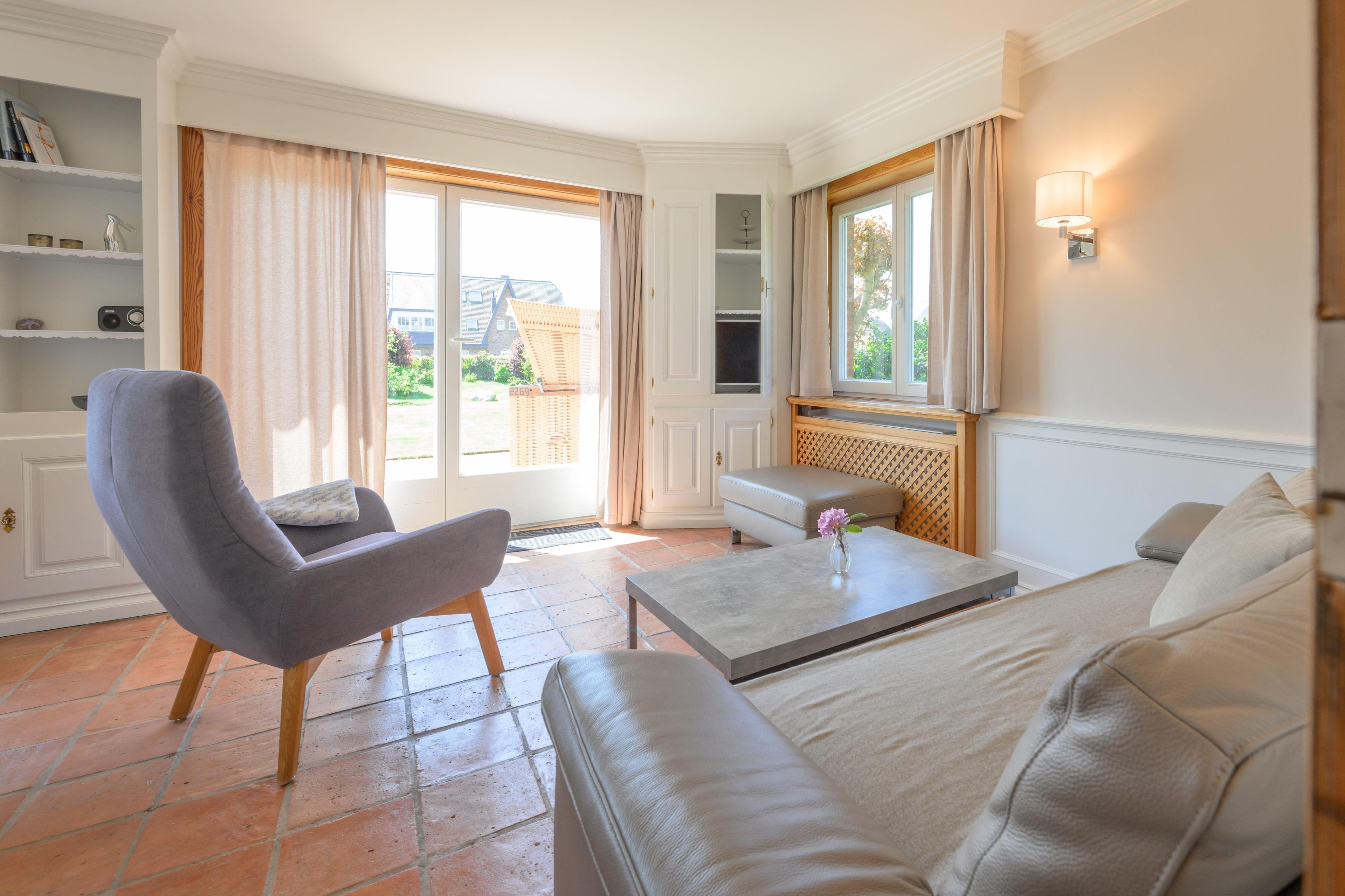 Der nach Süden gelegene großzügige Wohnraum mit Essbereich bietet Platz. Vom Wohnraum gelangt man unmittelbar auf die angrenzende Terrasse mit Strandkorb. Die Küche liegt neben dem Wohnraum.