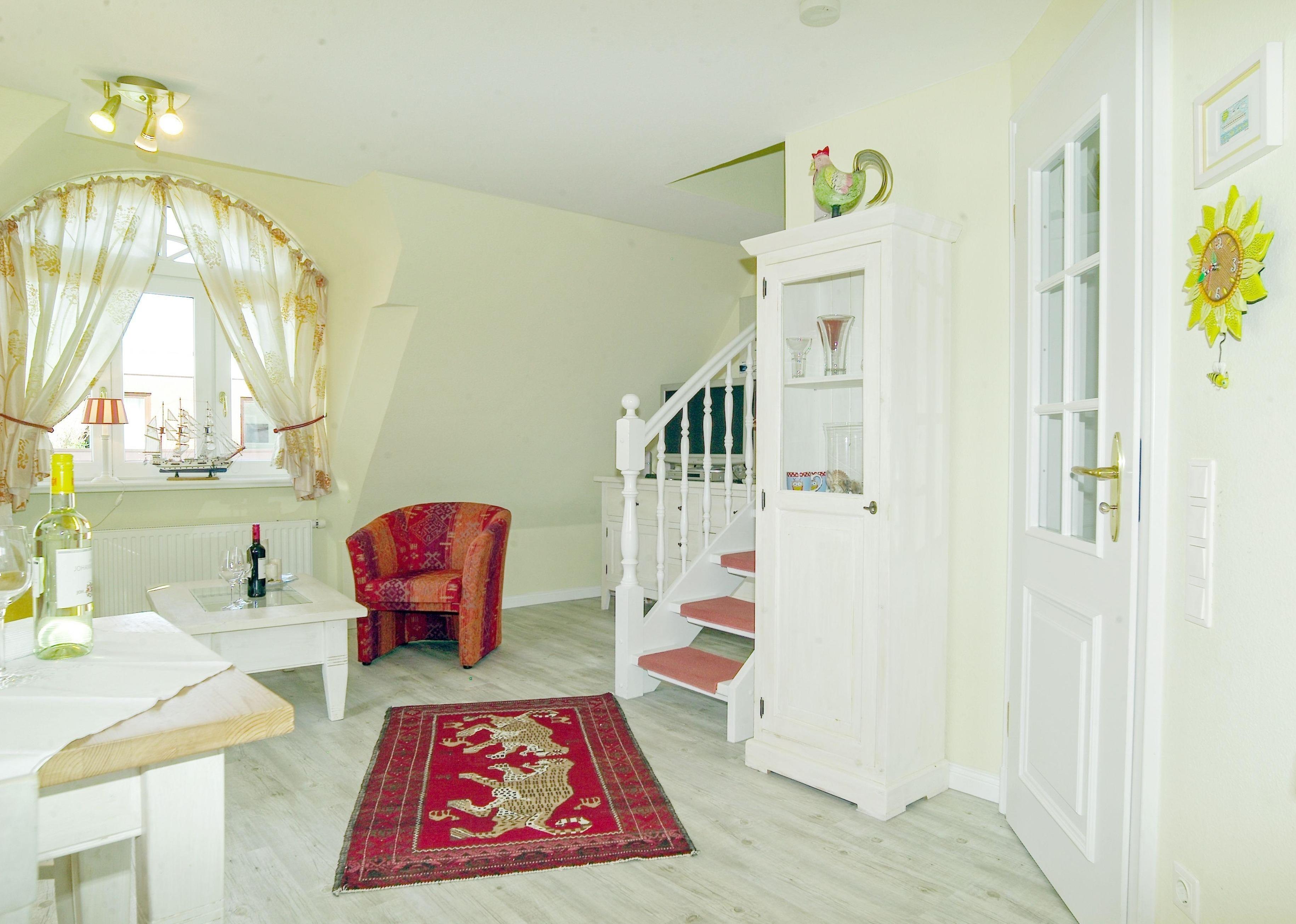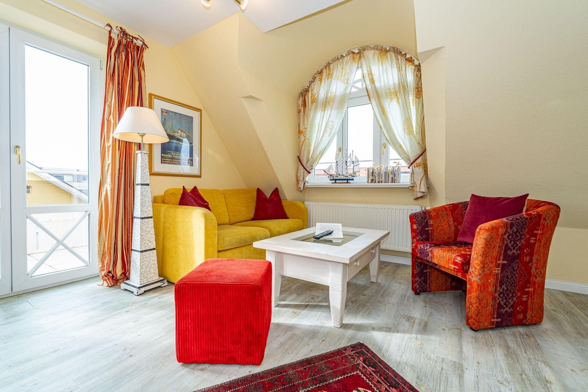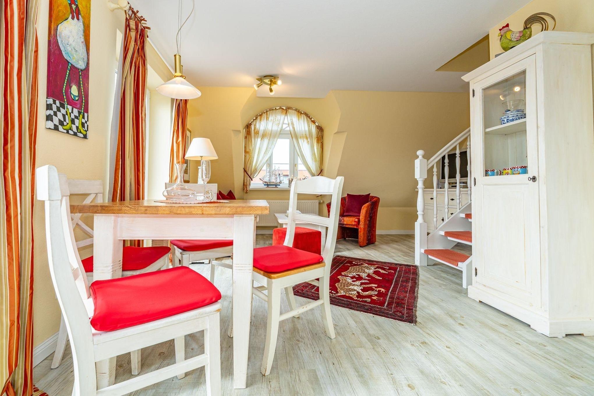 Im Obergeschoß befindet sich der sehr helle Wohnbereich mit 2 großen Fenstern (Richtg.Osten und Westen) und 2 Flügeltüren zum Balkon (Richtung Süden). Der Balkon (Südlage) ist knapp 7 m lang. Zwischen den Flügeltüren befindet sich der Eßbereich. Der gemütliche Eßbereich und die einladende Sitzecke sind modern möbliert, das Sofa läßt sich in eine Bett-Couch verwandeln und bietet einen sehr bequemen Schlafplatz für 2 Personen. Im Dachgeschoß ist das Schlafzimmer mit 2 Betten, die sich einzeln oder zusammen stellen lassen.