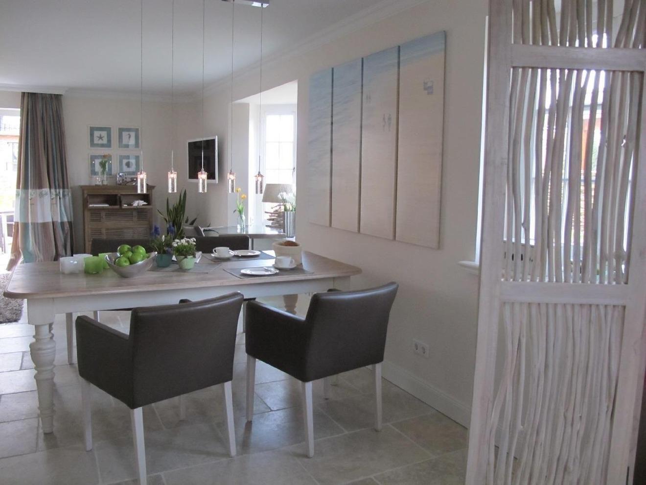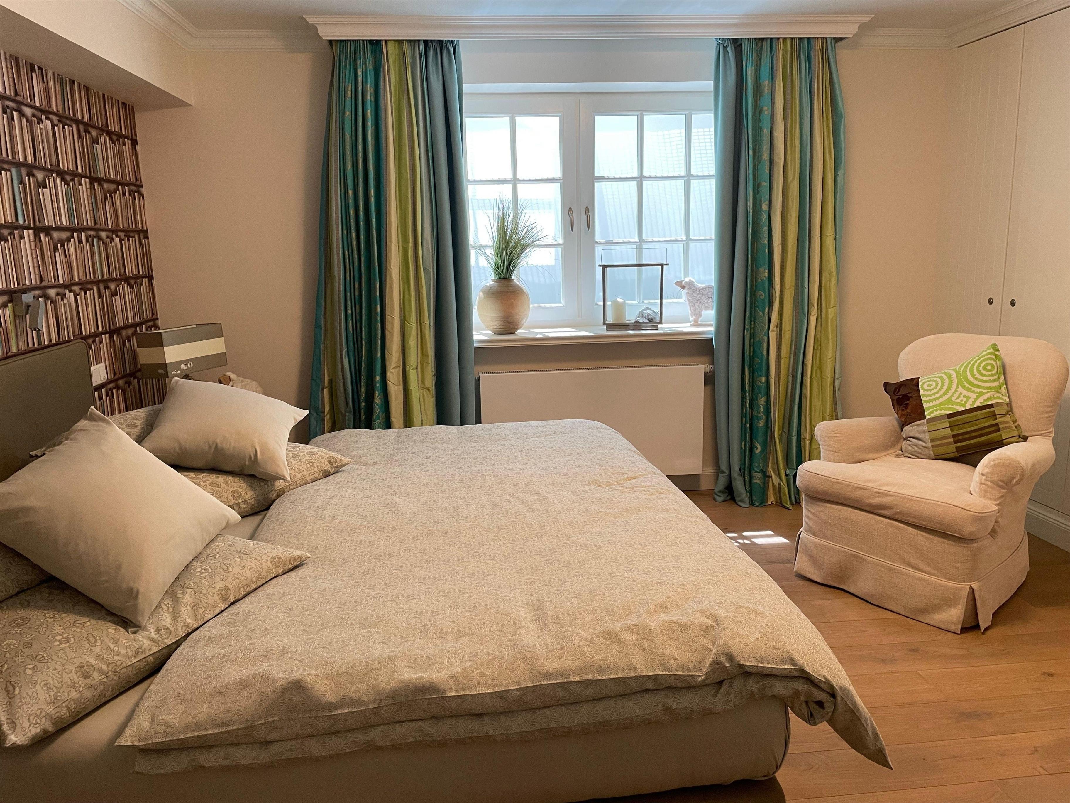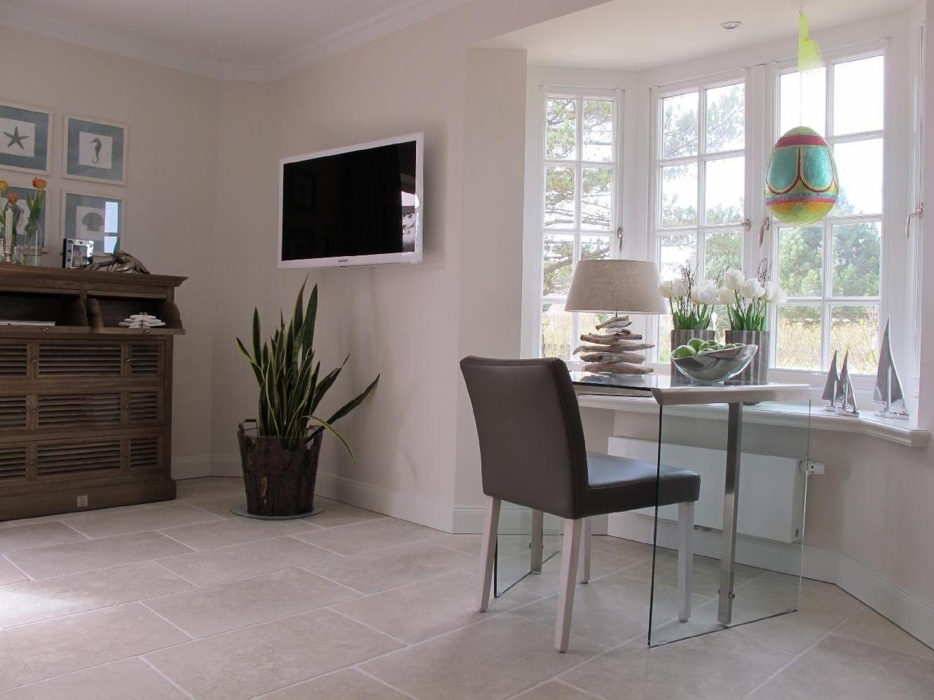 Die außergewöhnliche Gestaltung über zwei Ebenen, EG und Warftgeschoss, laden Sie zu gemütlichen Urlaubsstunden ein. Der lichtdurchflutete Wohnraum mit einem mediterranen, warmen Naturstein-Fußboden erhält durch die Bodenheizung eine gleichmäßige, wohlige Wärme. Gut durchdachte Einbauschränke, Safe, gemütliches Sofa sowie ein großer Esstisch tragen zum Wohlfühlen bei. Natürlich ist ein Flatscreen sowie kostenfreies WLAN vorhanden. Die offene Küchenzeile ist praktisch und mit den neuesten Geräten wie Induktionsherd, Mikrowelle, Backofen, Kühlschrank, Kaffeeautomat, Spülmaschine eingerichtet. In das Untergeschoss gelangen Sie über eine bequeme holzbelegte Treppe. Hier erwarten Sie 2 getrennte Schlafräume mit Doppelbetten -Doppel-Bettgrößen 200 x 200 cm und 160 x 200 cm- sowie weiteren praktischen Einbauschränken. In der Nacht können Sie unter Bettdecken in Komfortgröße träumen. Den Abschluss bildet ein besonderes Badezimmer mit Natursteinen, angenehmer Fußbodenheizung, großem Fenster zum seegrasbepflanzten und beleuchteten Lichtschacht, großzügiger Dusche und einem beheizten Handtuchhalter.