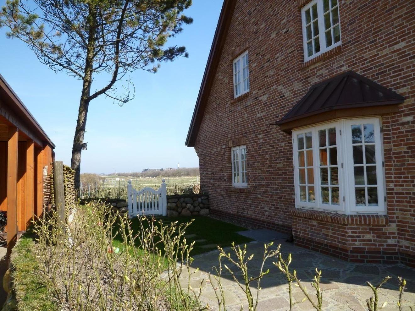 Lichtdurchflutete Endhaus-Wohnung mit großzügigem Gartenteil, geschützt, da eingewachsenes Grundstück, freier Blick auf Weideland und Kampener Leuchtturm, sehr ruhige Lage. Das Haus liegt in einer Mulde, zur Straße nach Kampen durch Büsche und Bäume isoliert. Durch die äußerst zentralen Standort ist der Urlaub auch ohne Auto problemlos (Feinkost Meyer ca. 200 m), Bushaltestelle, Arzt, Apotheke in Laufnähe, direkt am Rad- und Joggingweg nach Kampen, zum Dorfteich 200 m, zum Strand 800 m, Golf-Club Sylt in Sichtweite.