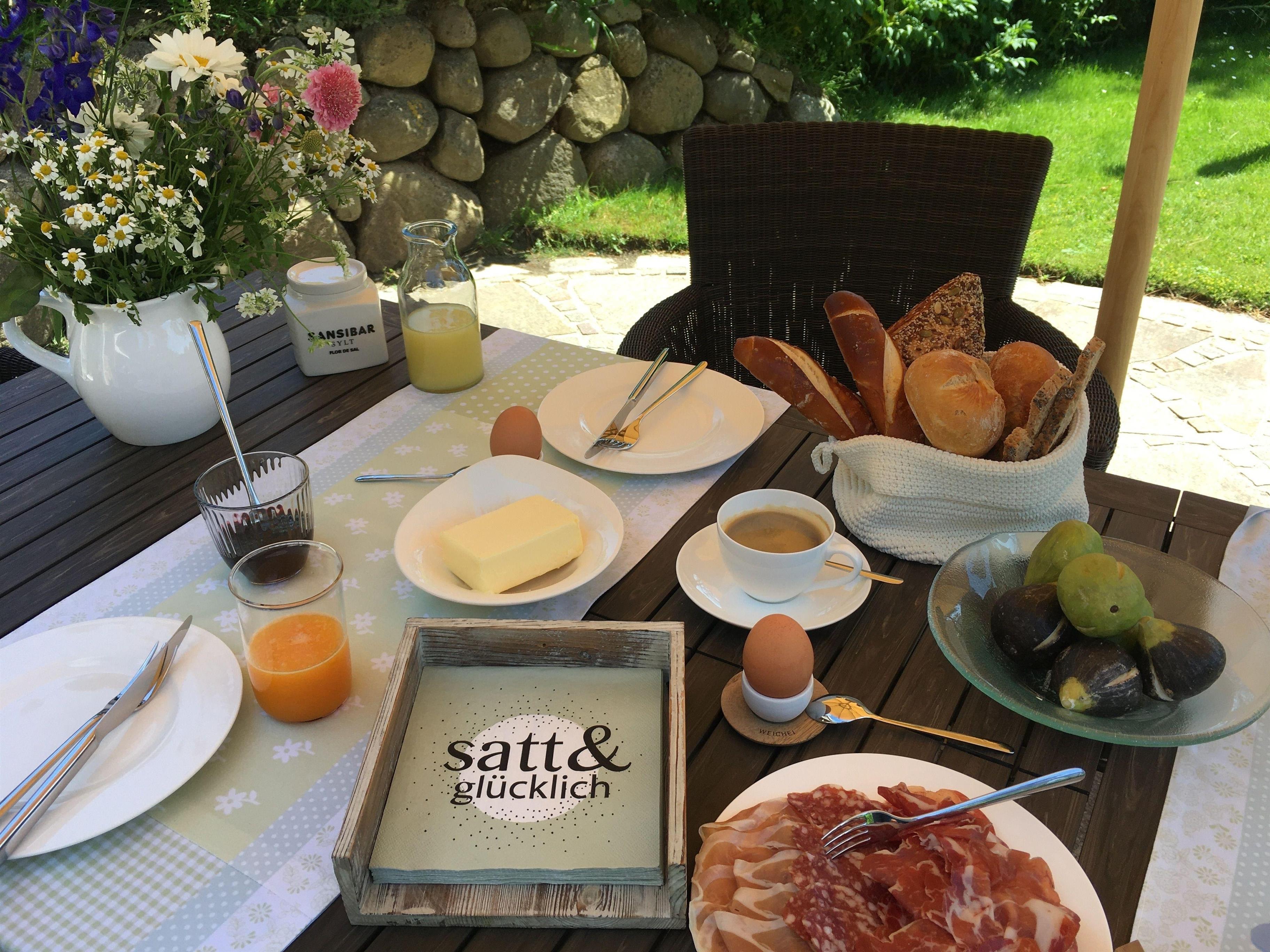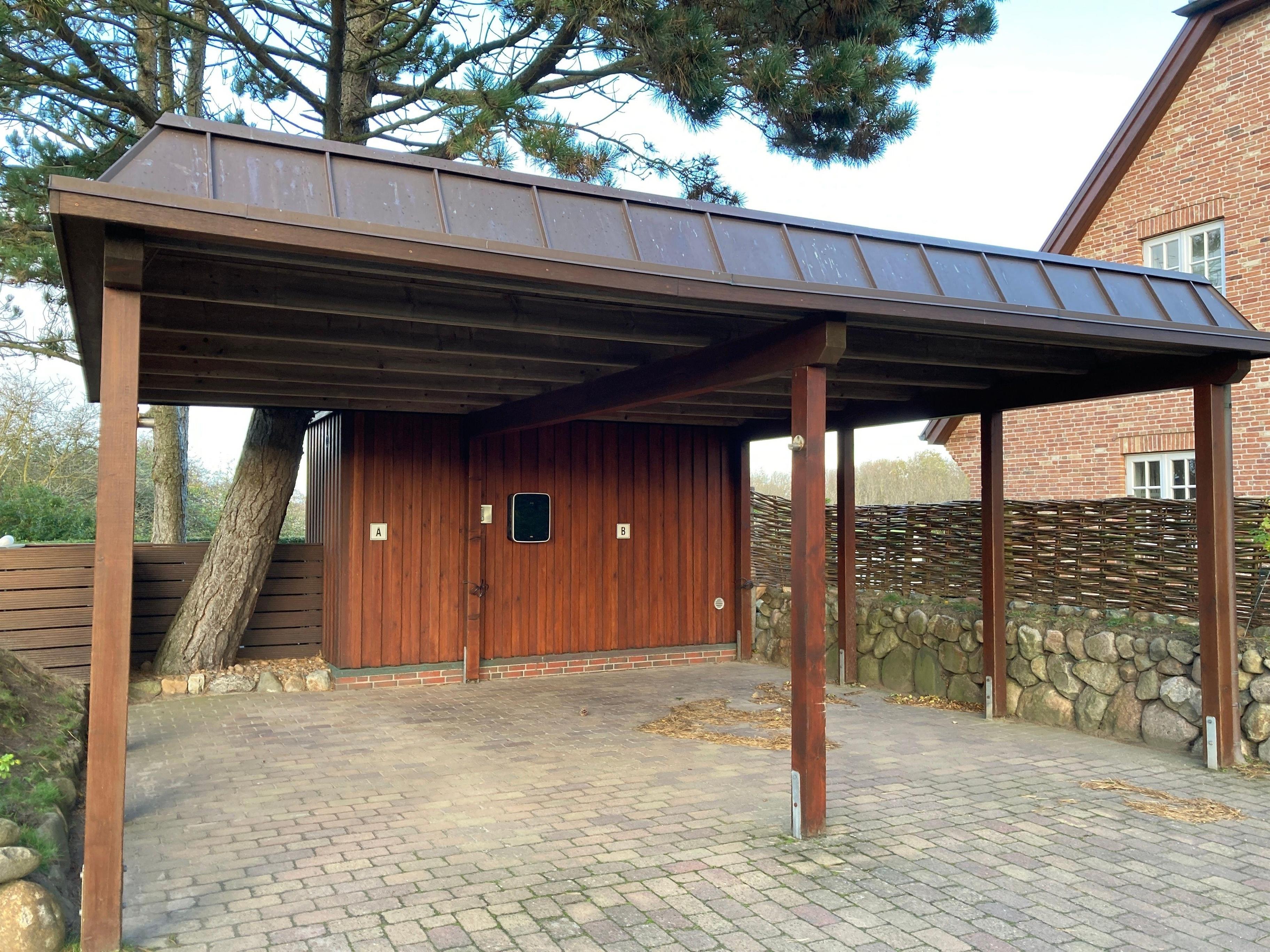 Vom Wohnraum haben Sie direkten Zutritt in den mit Friesenwällen herrlich angelegten Garten, wo Sie ausgewählte Gartenmöbel zu einem genüsslichen Kaffeeplausch erwarten. Ihr Auto hat natürlich einen überdachten Parkplatz (A), kostenfrei.