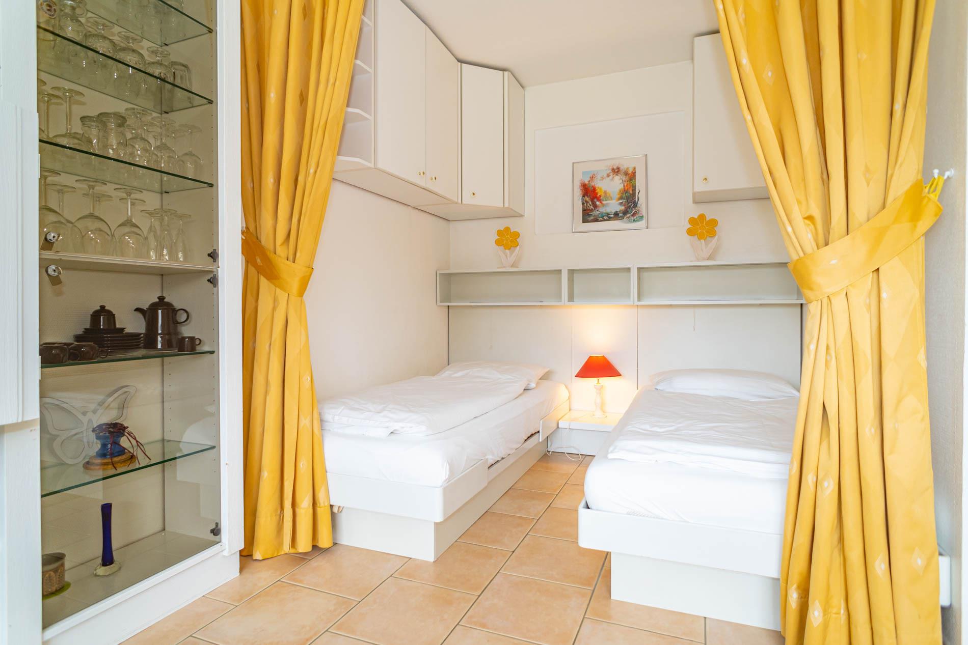 Die Schlafnische ist mit 2 Einzelbetten ausgestattet und kann durch einen Vorhang vom Wohnbereich getrennt werden.