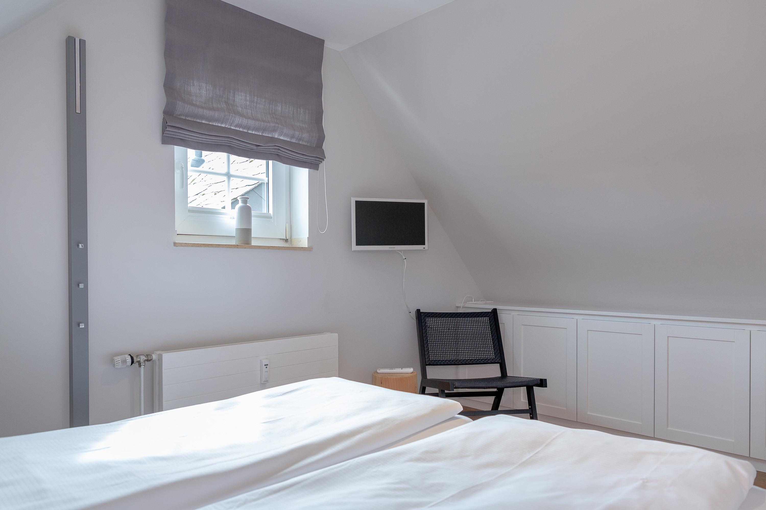 Auf gleicher Ebene zum Wohnbereich bietet Ihnen die Wohnung ein Schlafzimmer mit einem Einzelbett und ein Badezimmer mit Dusche und WC sowie noch ein separates Gäste WC. Einen weiteren Raum mit Doppelbett und Flatscreen-TV finden Sie im Dachgeschoss.