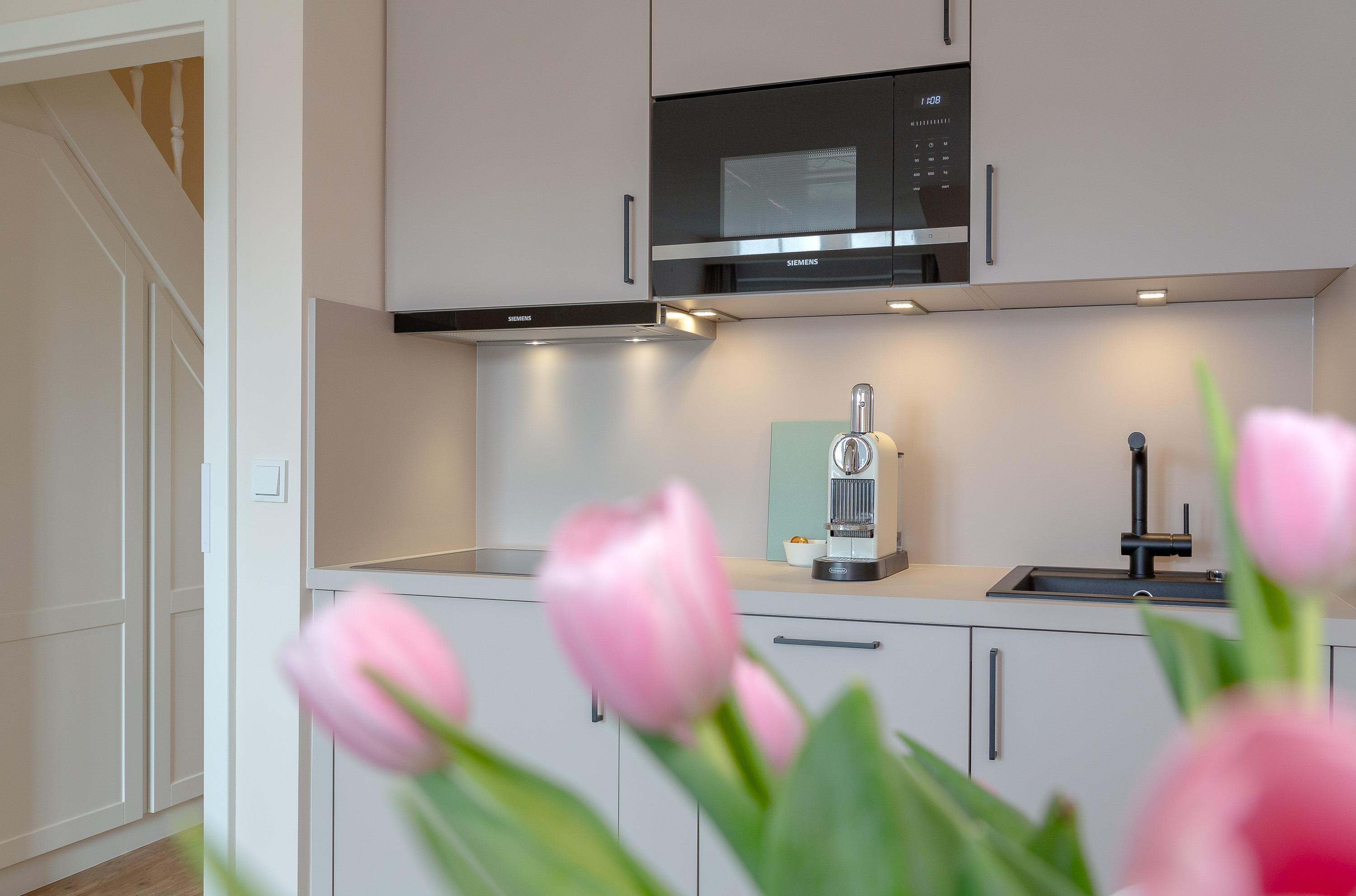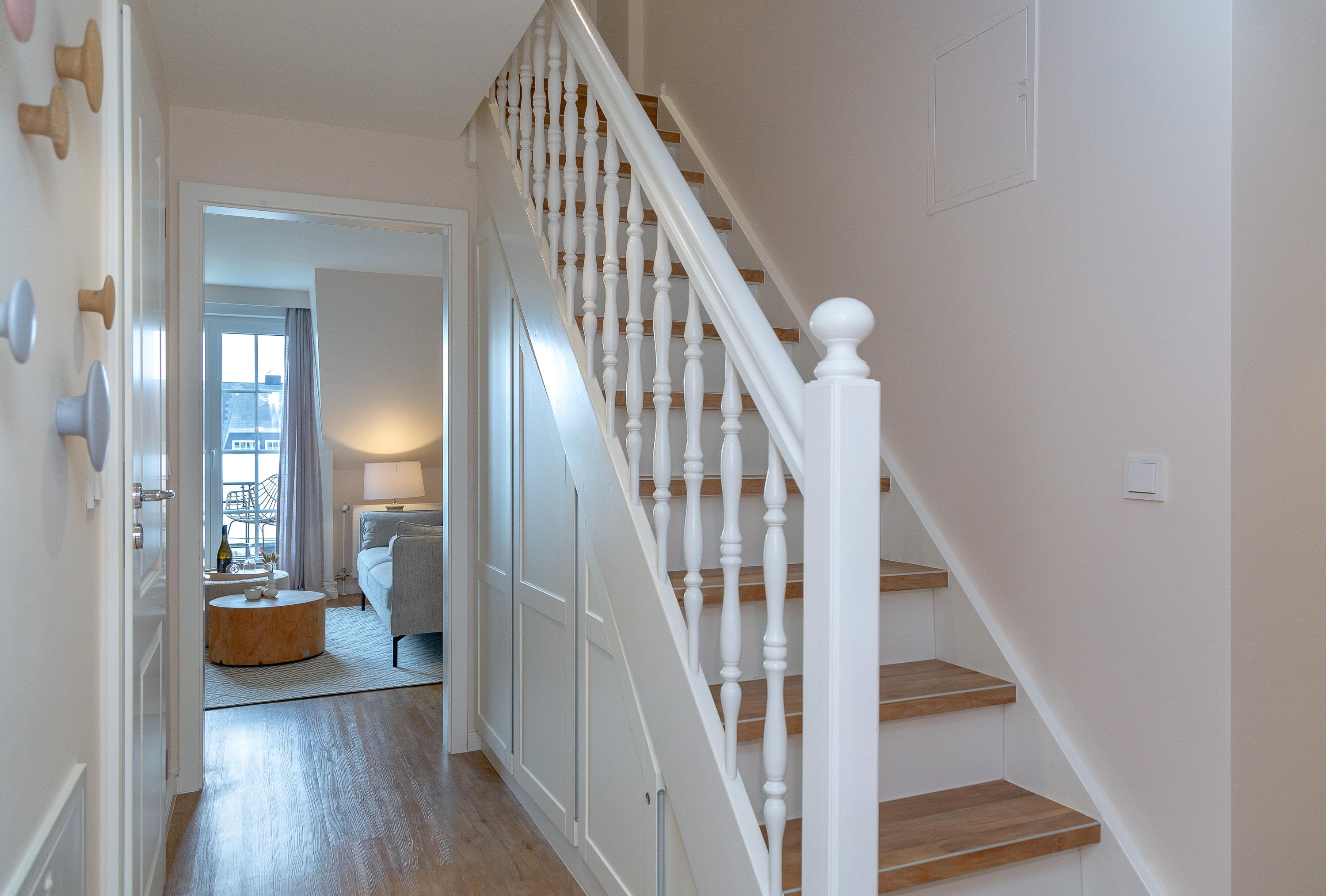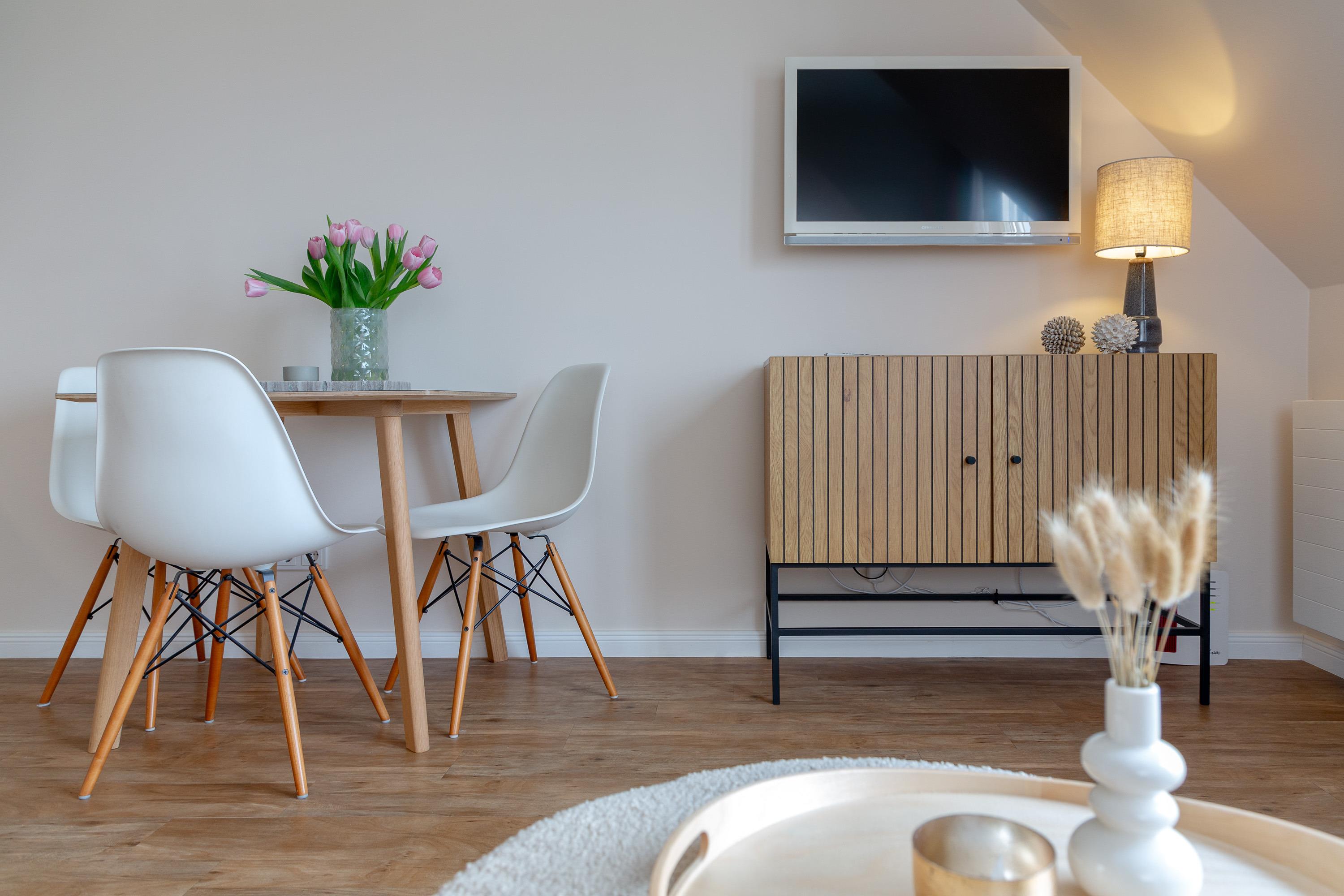 OG: Wohnbereich mit Flat-TV und WLAN, integrierte, vollausgestattete Küchenzeile mit Spülmaschine, Cerankochfeld, Mikrowelle mit Grill, Nespressomaschine, Kühlschrank mit Gefrierfach, Toaster und Wasserkocher, Schlafzimmer mit Einzelbett, Safe, Bad mit Dusche und WC, sonniger Südbalkon, eigener Strandkorb in der Sonnenkuhle