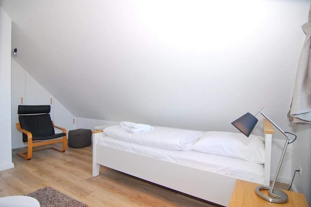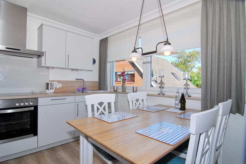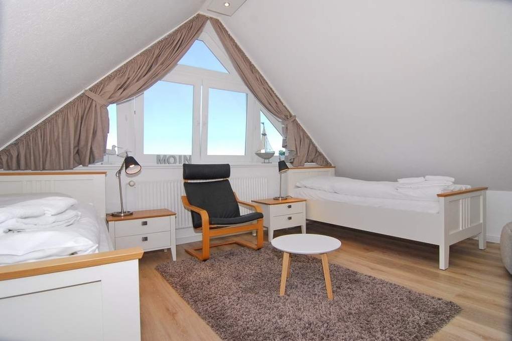 Moderne 3-Zimmer-Maisonette-Ferienwohnung, ca. 85 m². Nichtraucher-Whg.! OG: Wohnzimmer mit Flat-TV sowie Stereoanlage und Internet (ohne Gewähr), Leder-Couchecke mit Sessel, heller Essplatz am Fenster, offene Küche mit Backofen, Geschirrspüler und Mikrowelle, Zugang zum Südbalkon mit Strandkorb und Balkonmöbeln, Schlafzimmer mit Doppelbett und Kleiderschrank, Duschbad mit Regendusche / WC. Wendeltreppe zum geschlossenem Dachgeschoß mit 2 Einzelbetten sowie 2 Sessel mit Tisch, Einbauschrank und Flat-TV. Das Appartement ist mit Designer-Fußboden ausgelegt. Tierhaltung ist nicht gestattet. Der PKW-Stellplatz Nr. 2 ist am Haus ( ist der 3. von links ). Bettwäsche und Handtücher sind zur Anreise aufgezogen.
