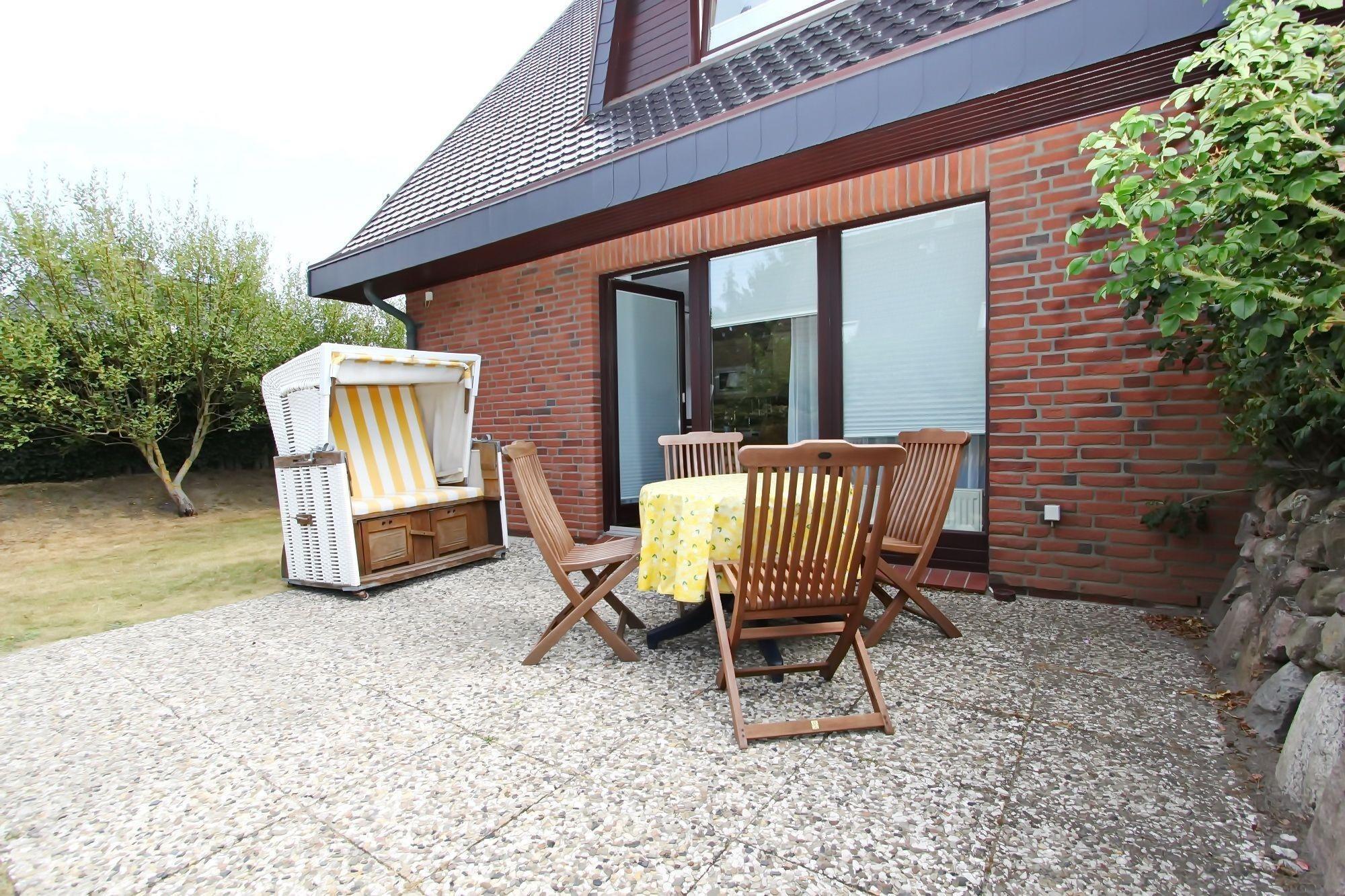 Das Appartement hat eine Westterrasse mit Strandkorb.