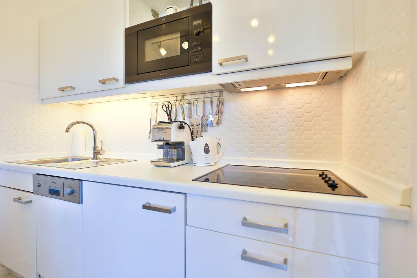 Schon beim Betreten des Appartements fällt auf, dass hier alles gut durchdacht und mit viel Liebe zum Detail gestaltet wurde. Hingucker im Wohnbereich ist die nordisch blaue Couch, die einen schönen Kontrast zum Esstisch-Ensemble und der offenen und bestens ausgestatteten Küche bildet. An schönen Tagen lässt es sich übrigens auch herrlich auf dem Westbalkon sitzen.